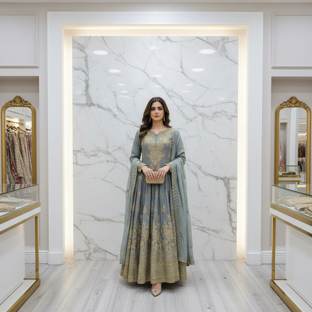 LM Printed Co-Ord Linen Shalwar Kameez – Deep Teal, Dark Forest Green & Dim Gray