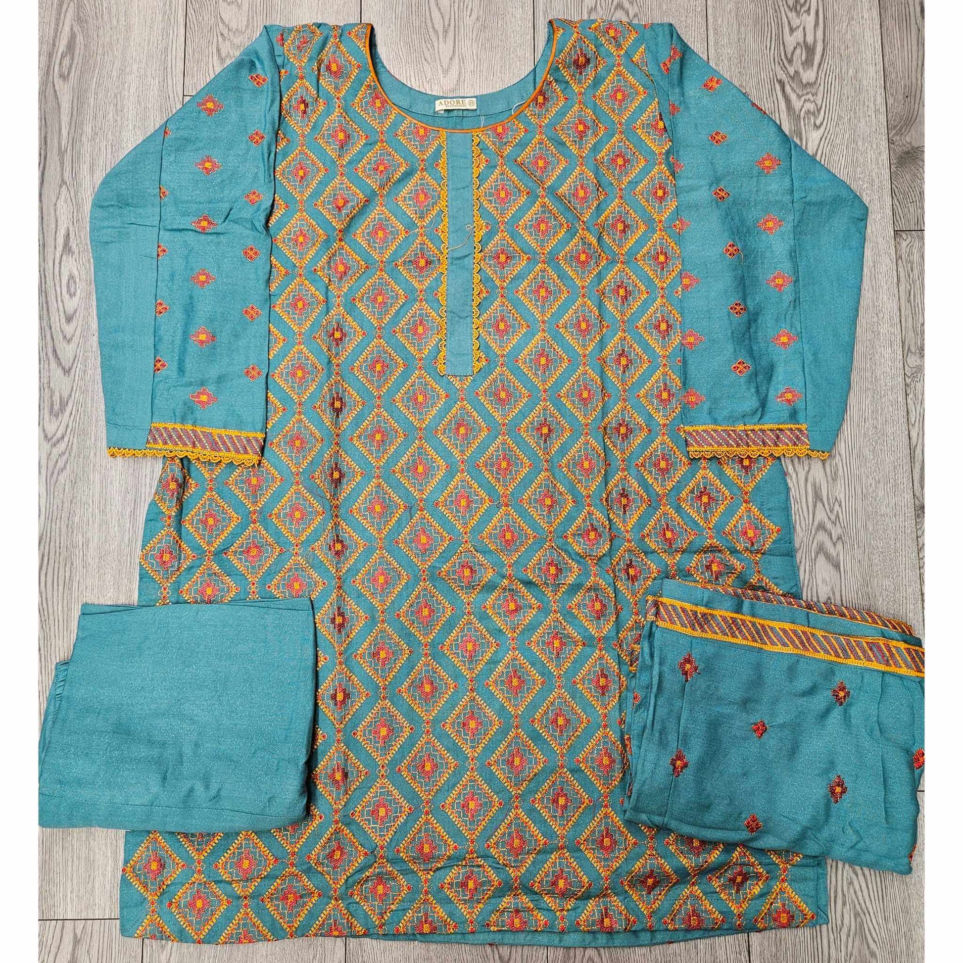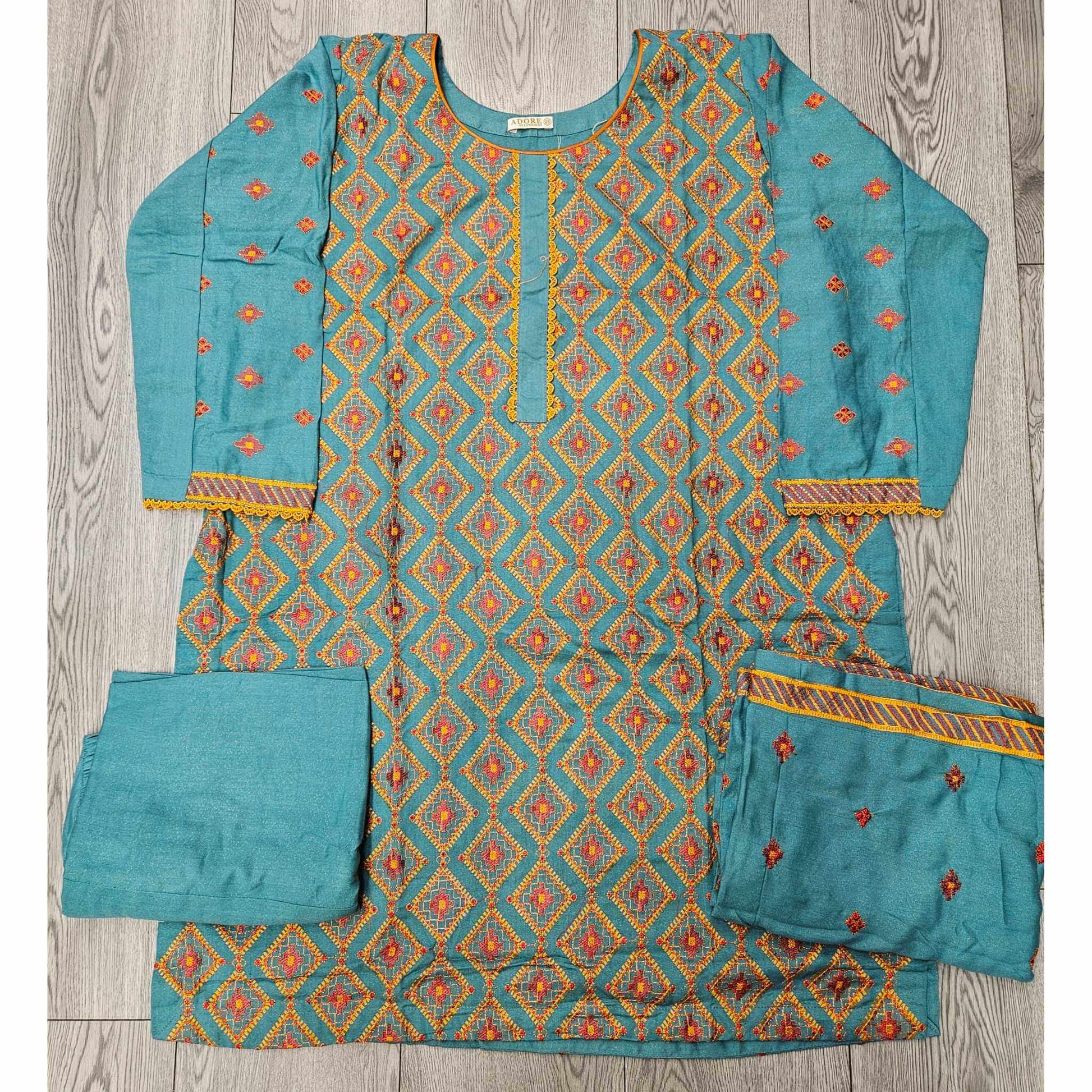 Azure Flame: Turquoise Blue & Orange Bareeze Embroidered Dhanak Suit (Small-7XL)