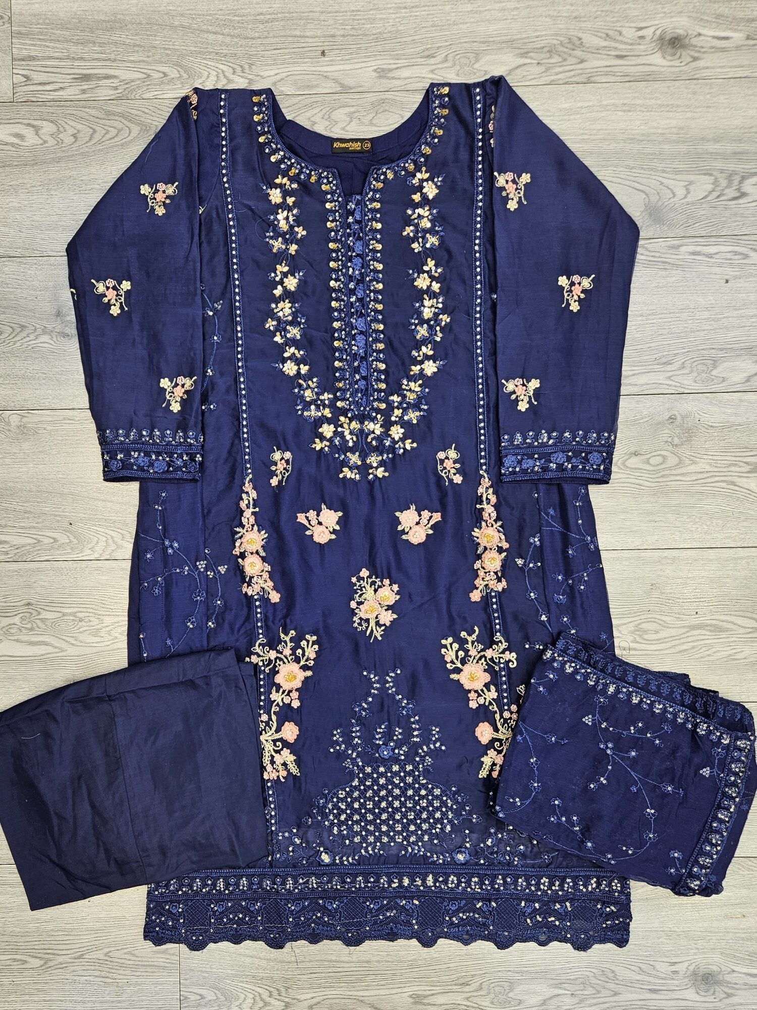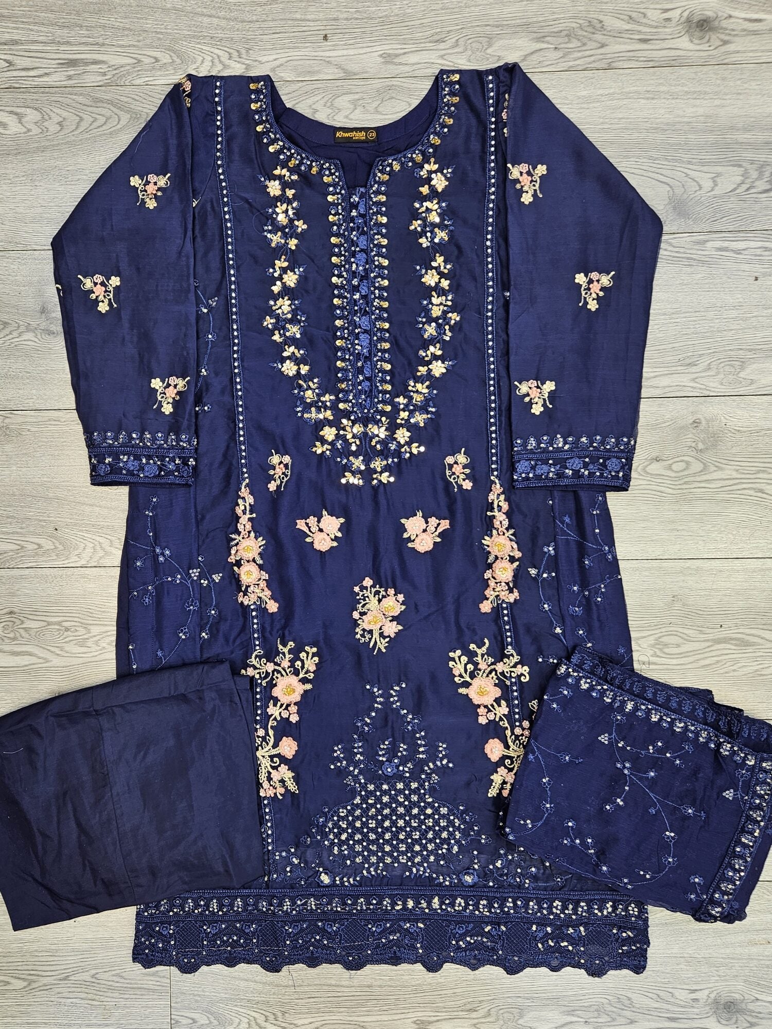 Navy Blue Stone Work Kameez | Silk Sharara & Chiffon Dupatta | 4-Side Embroidered | Sizes Up to 8XL
