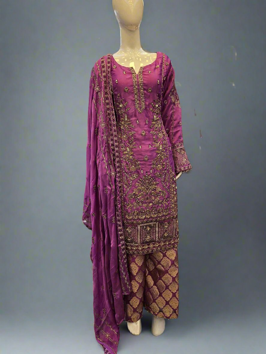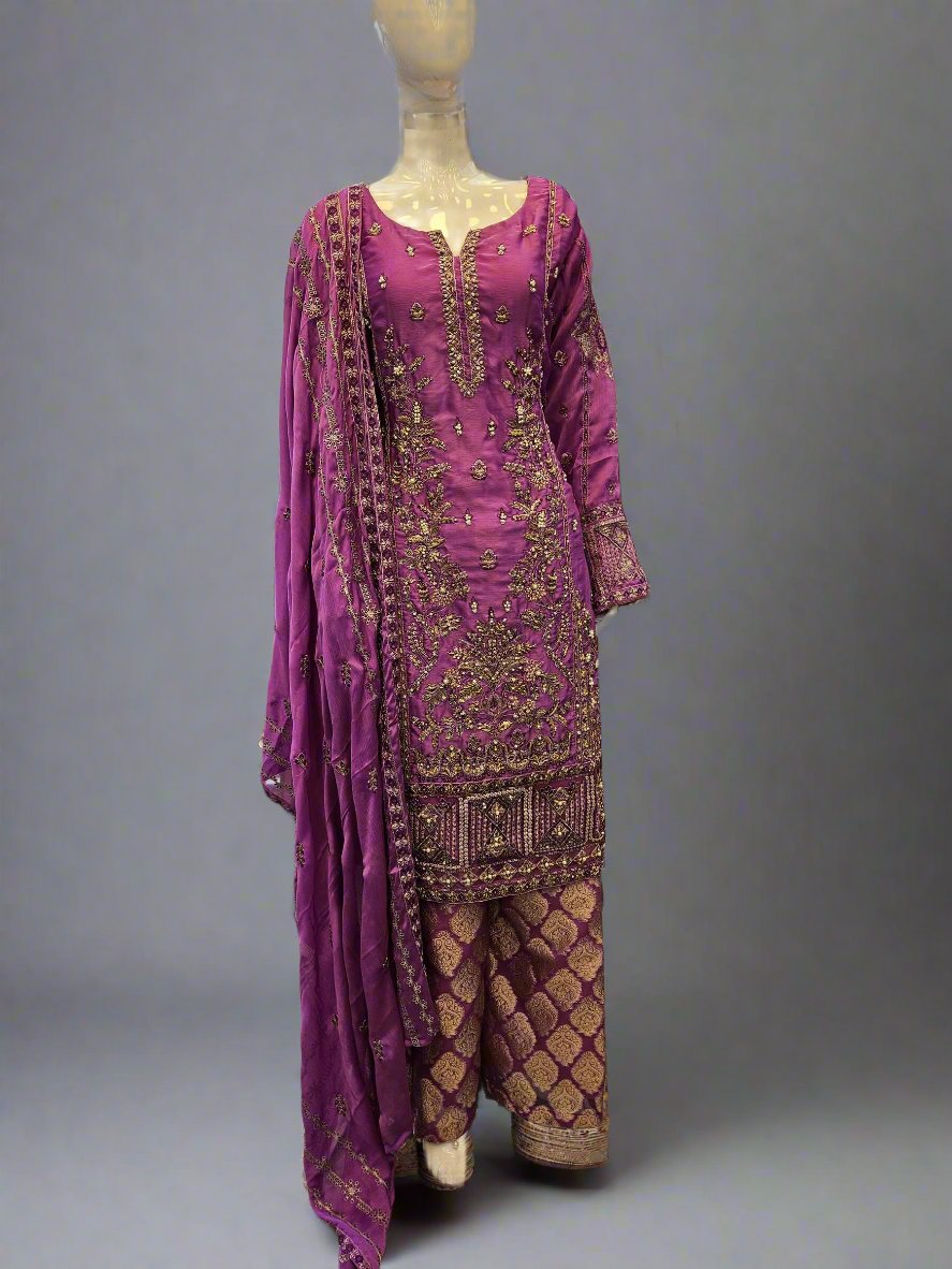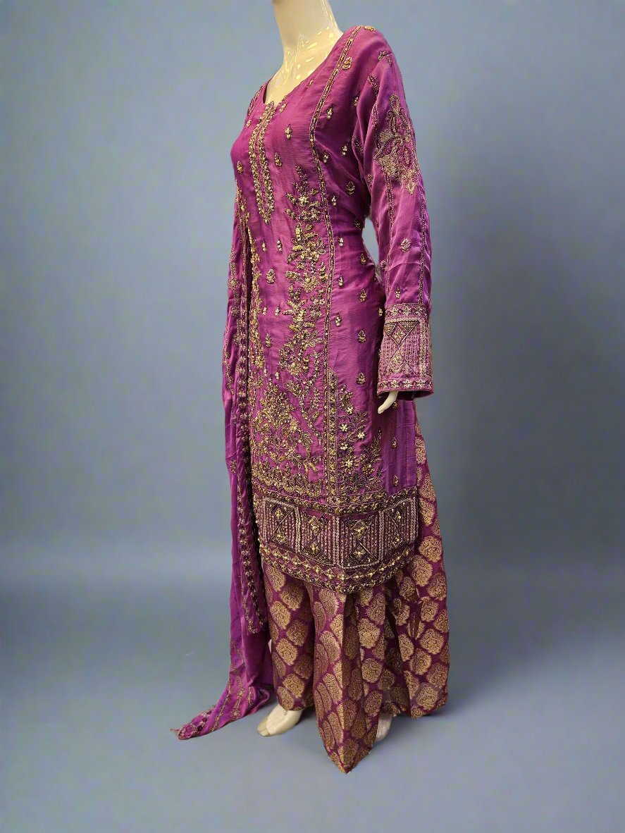 Navy Blue Stone Work Kameez | Silk Sharara & Chiffon Dupatta | 4-Side Embroidered | Sizes Up to 8XL