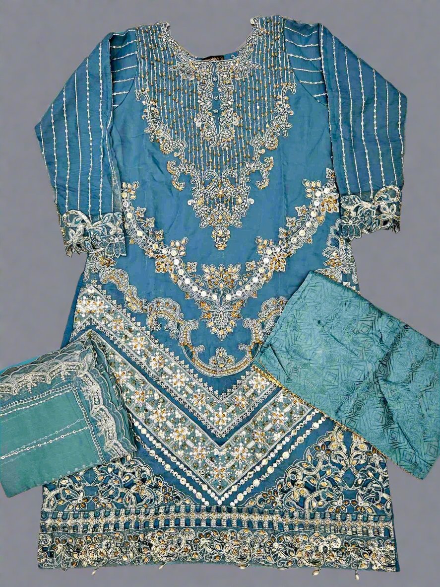 Navy Blue Stone Work Kameez | Silk Sharara & Chiffon Dupatta | 4-Side Embroidered | Sizes Up to 8XL