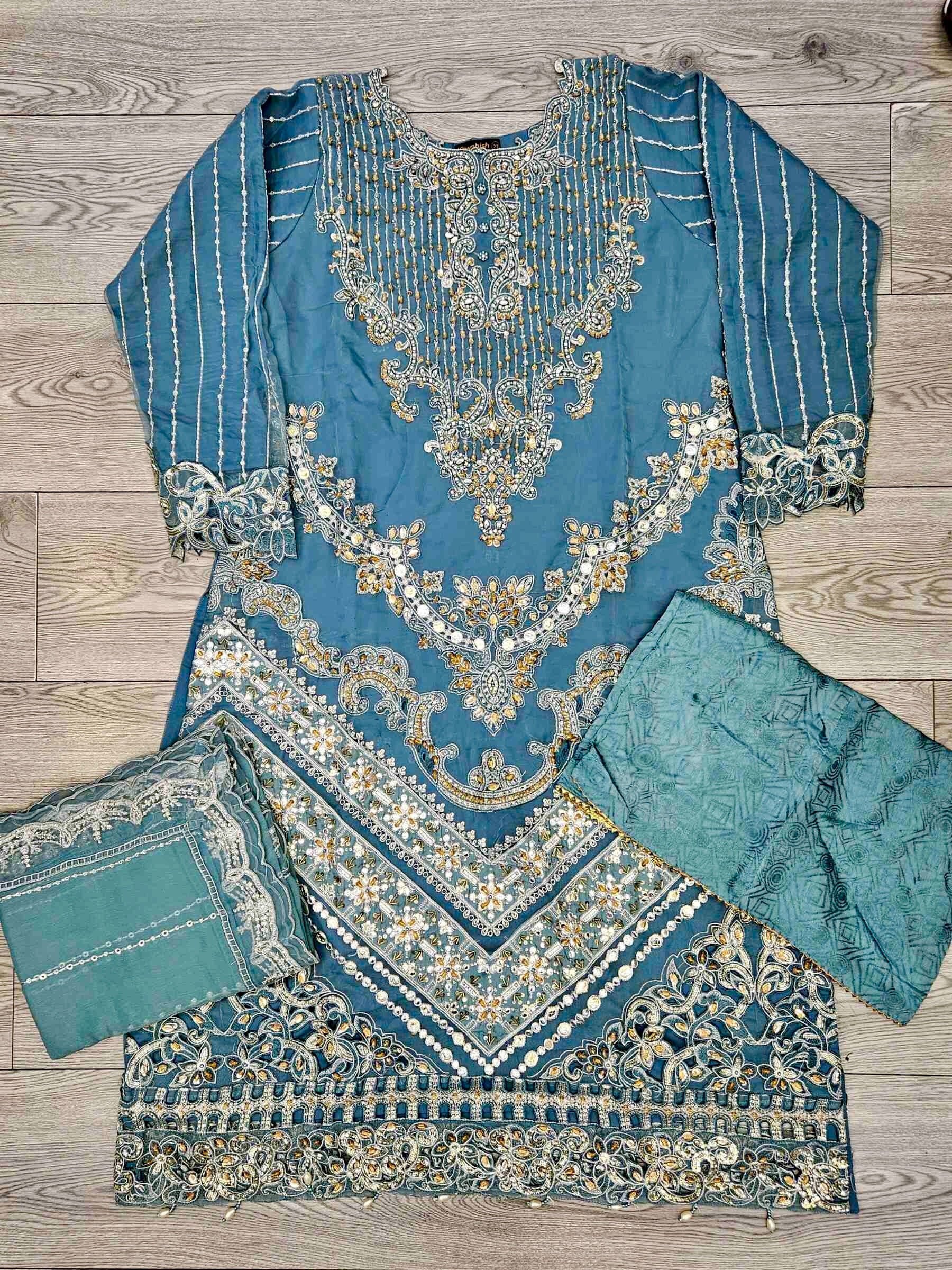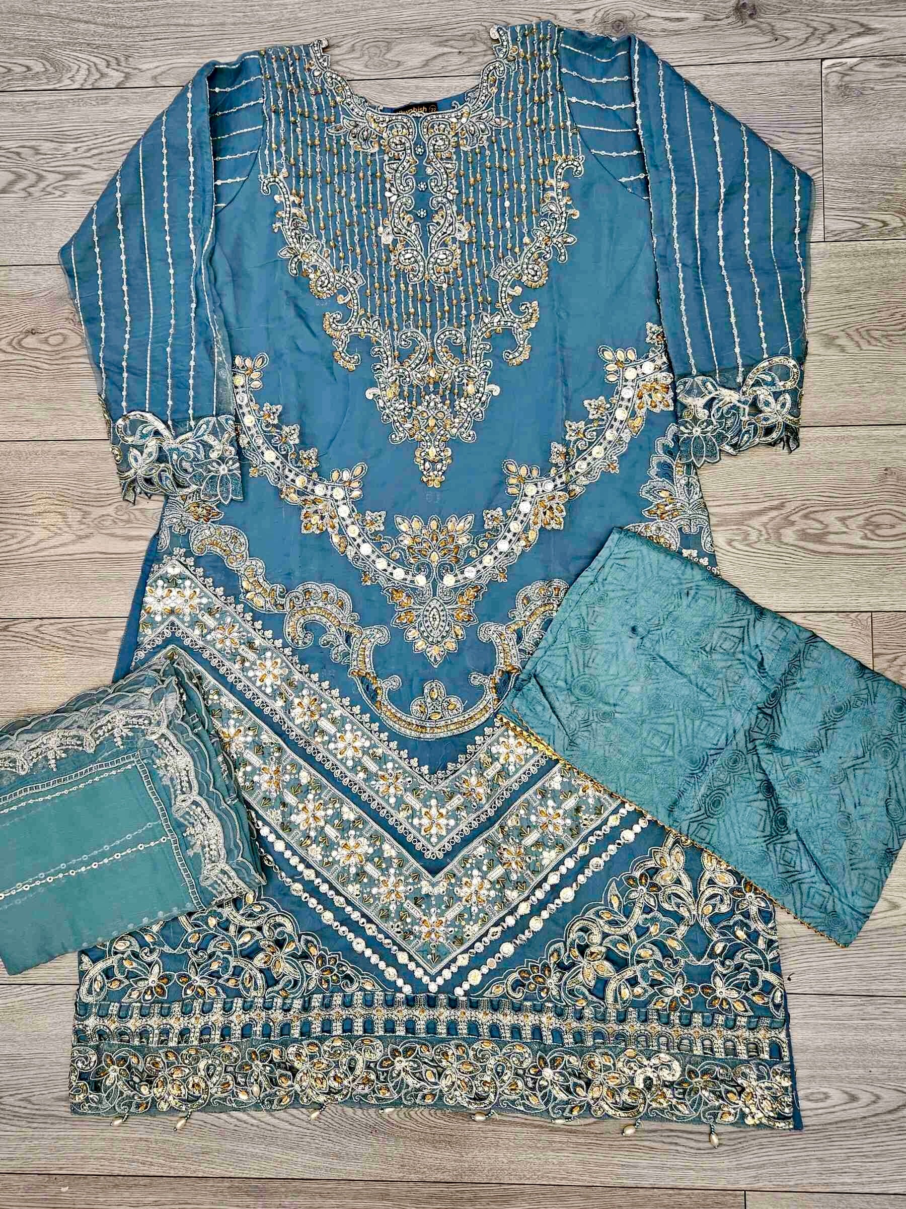 ELF Light Grey Hand Embellished Organza Kameez | Pink Crystal Detail | Sizes Up to 8XL