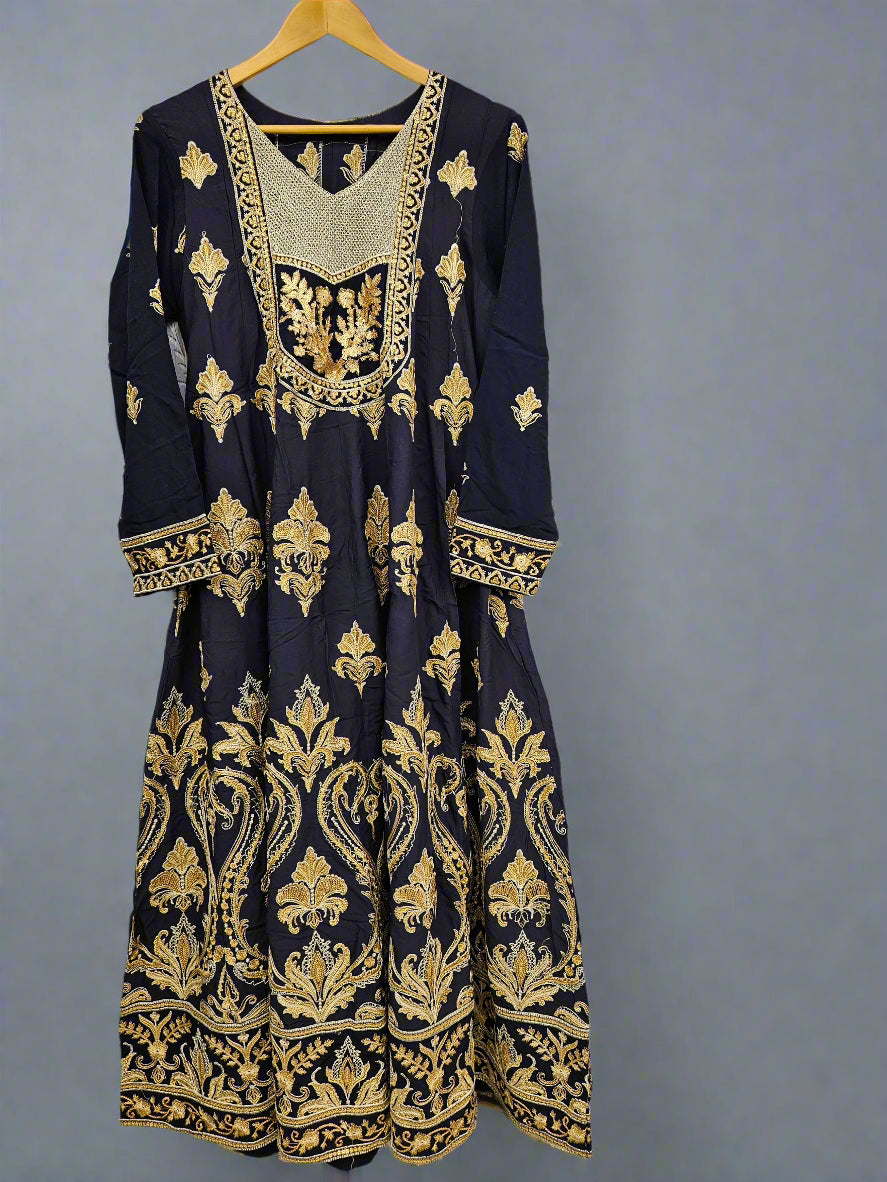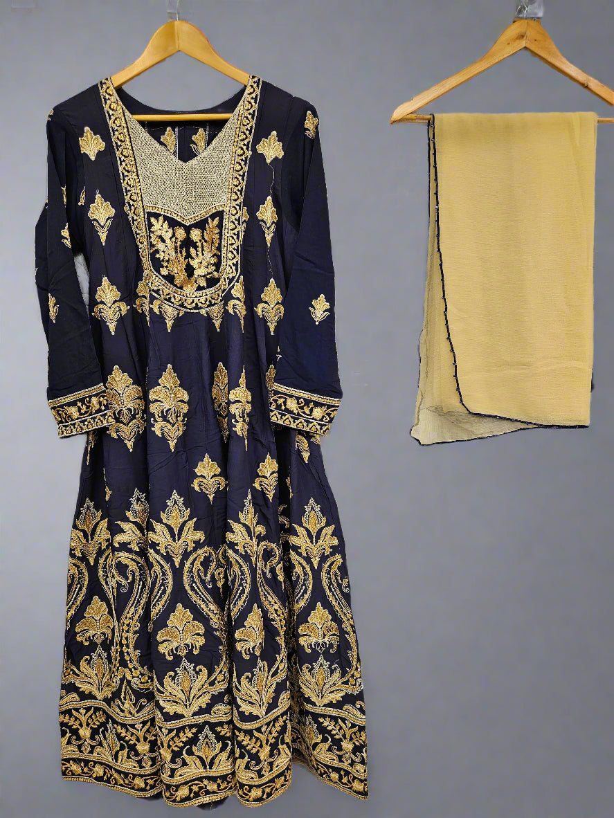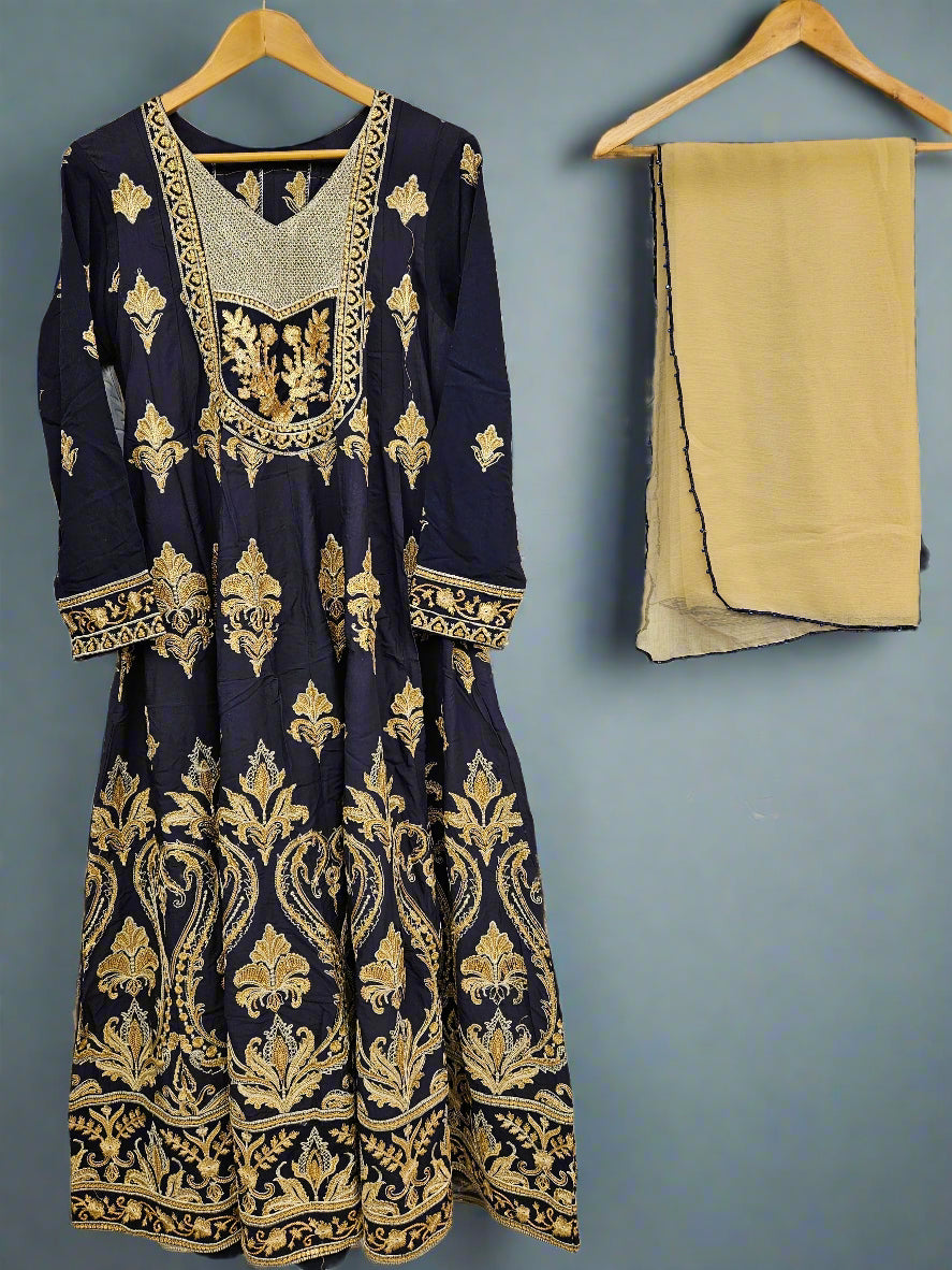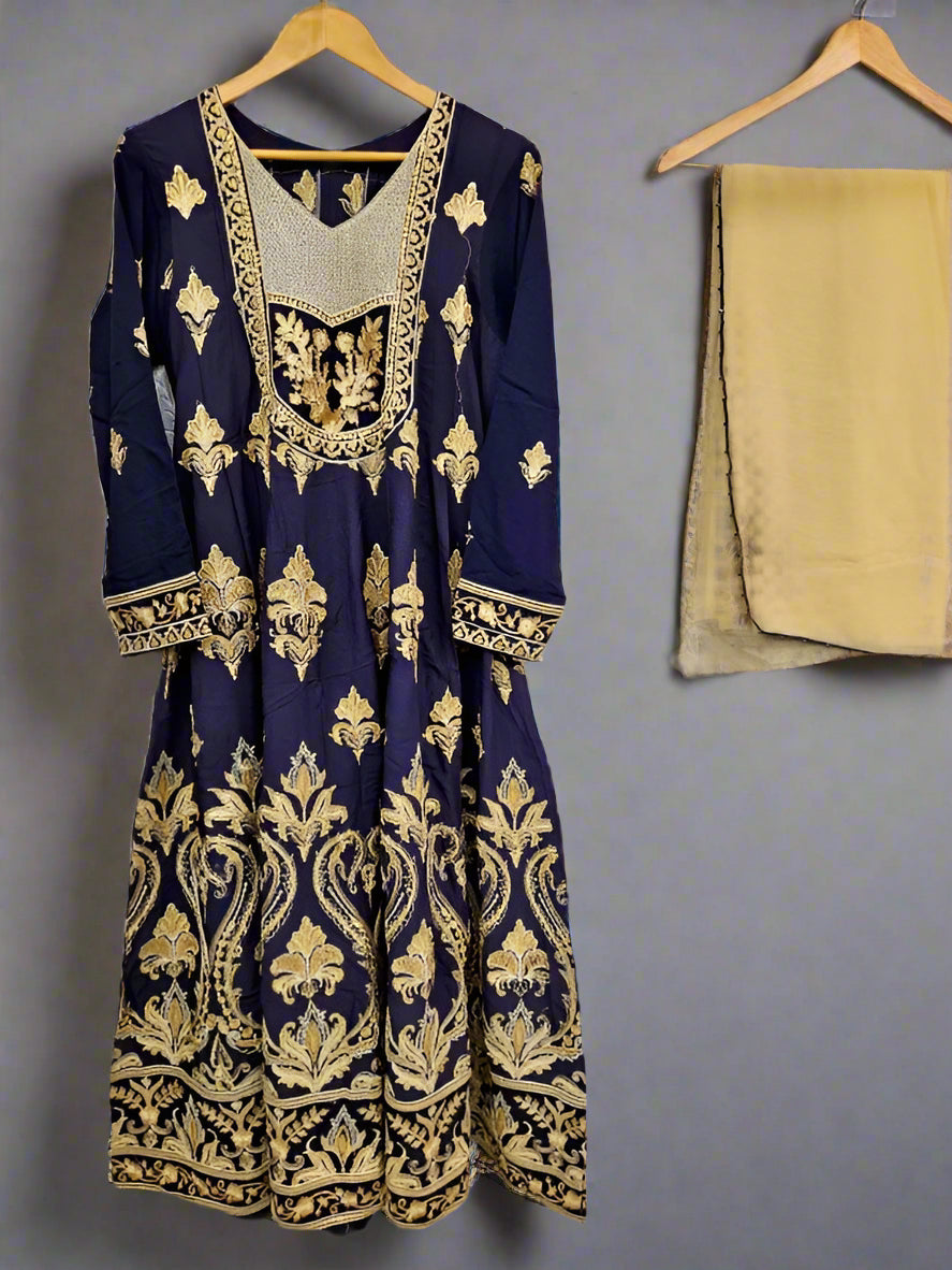 Navy Blue Stone Work Kameez | Silk Sharara & Chiffon Dupatta | 4-Side Embroidered | Sizes Up to 8XL