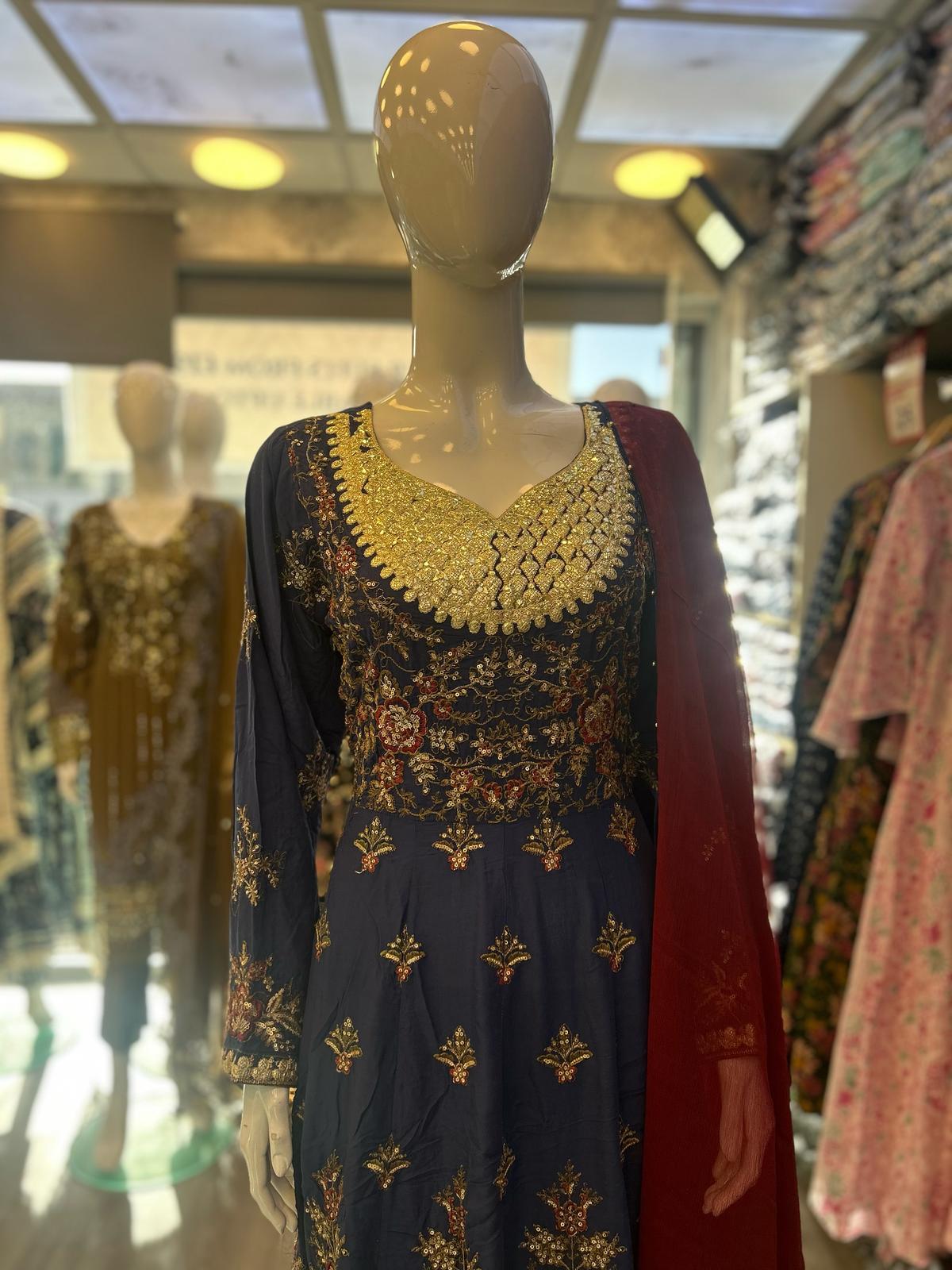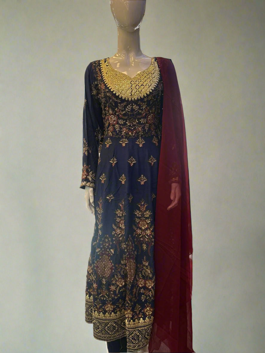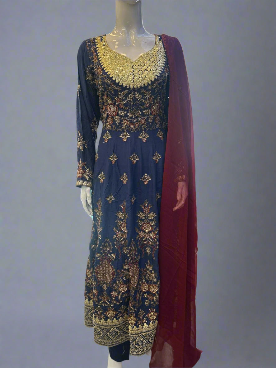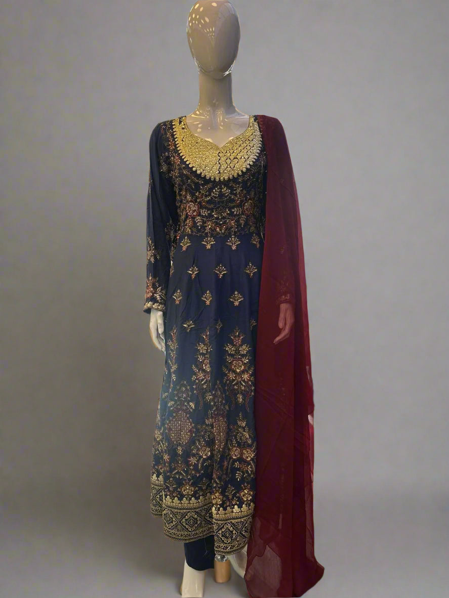 Navy Blue Stone Work Kameez | Silk Sharara & Chiffon Dupatta | 4-Side Embroidered | Sizes Up to 8XL