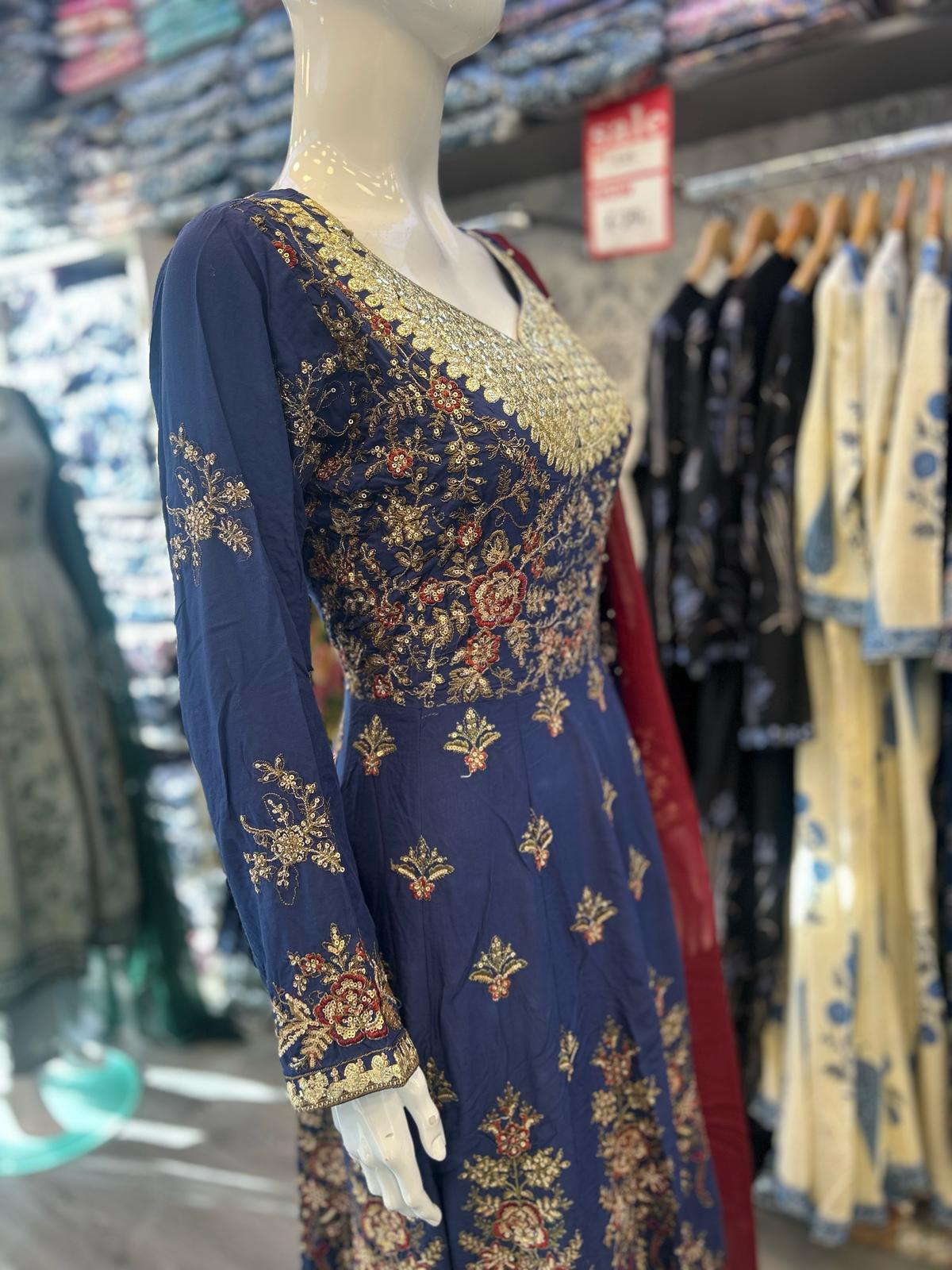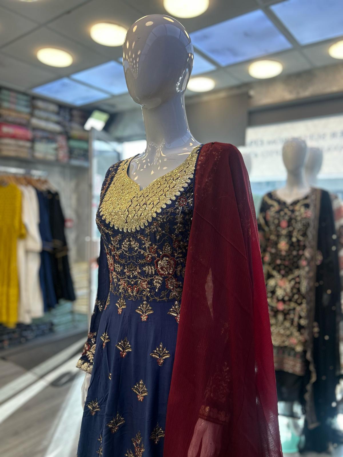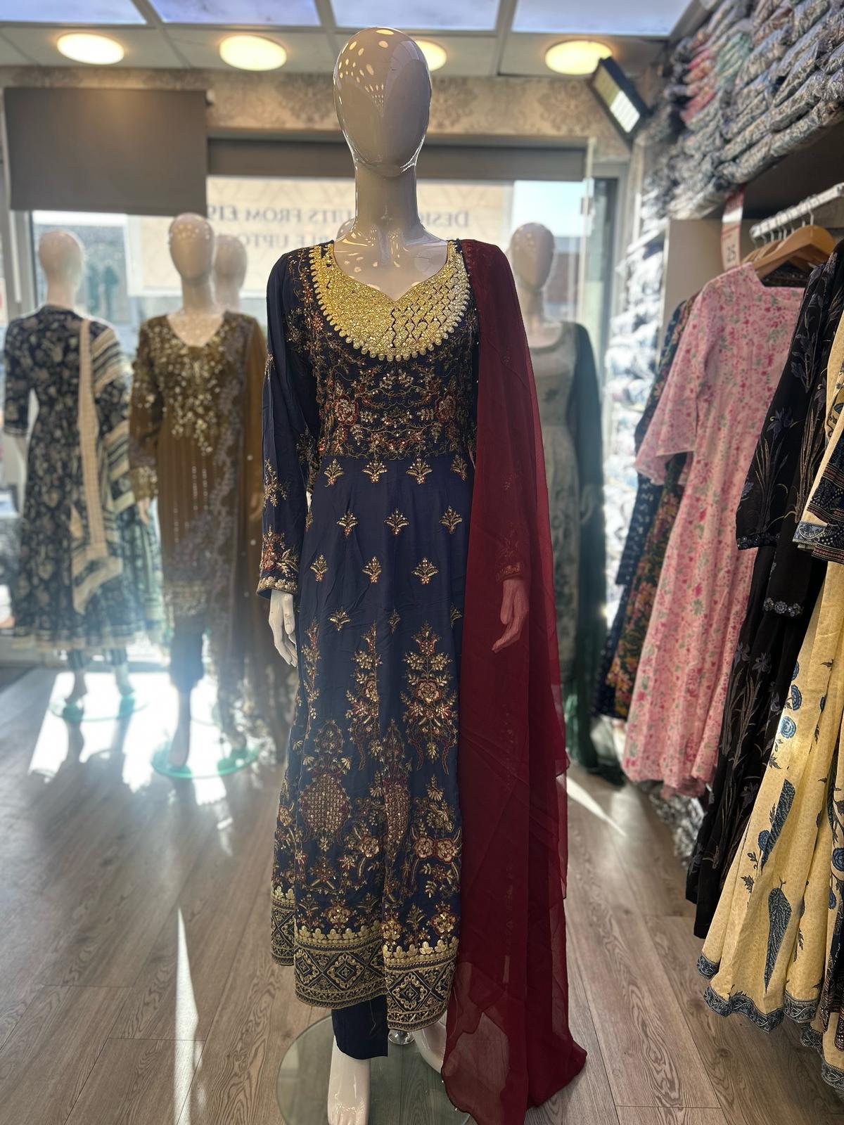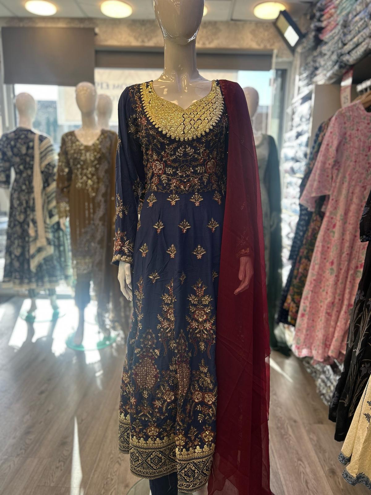 Navy Blue Stone Work Kameez | Silk Sharara & Chiffon Dupatta | 4-Side Embroidered | Sizes Up to 8XL