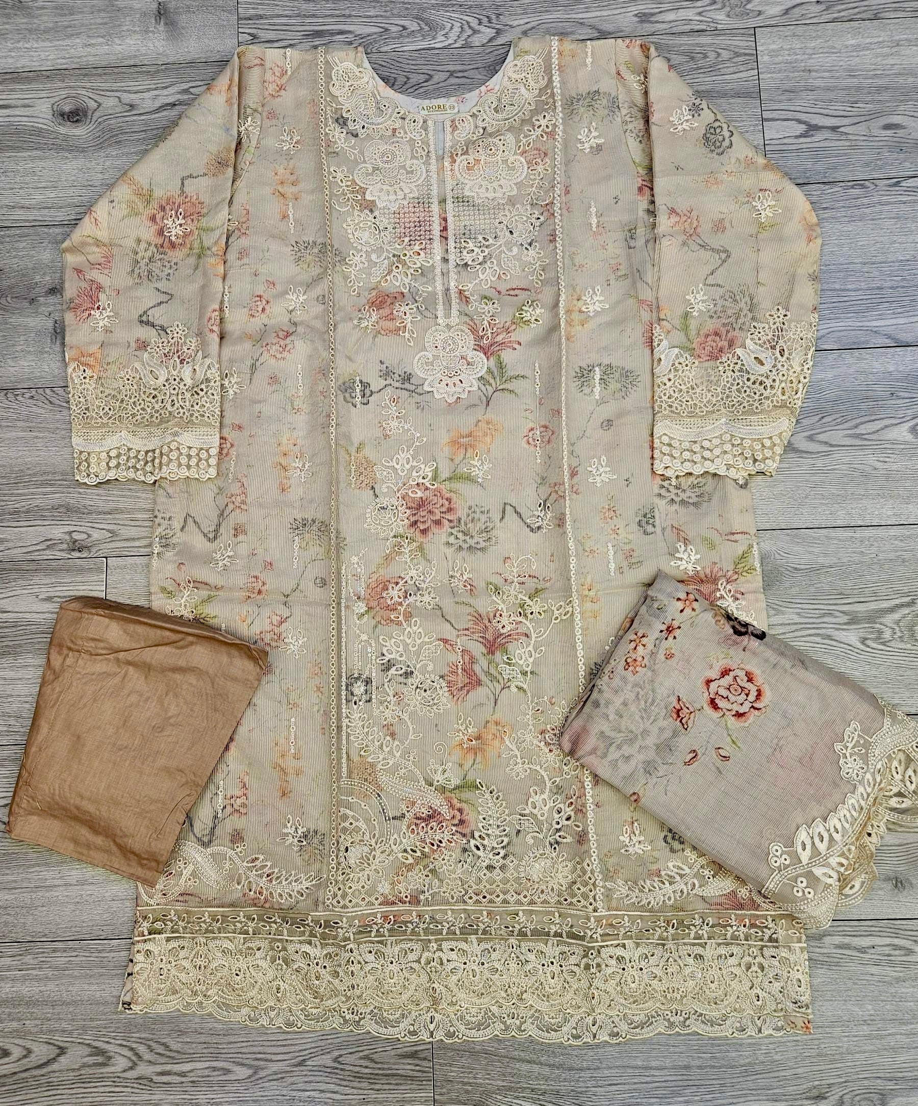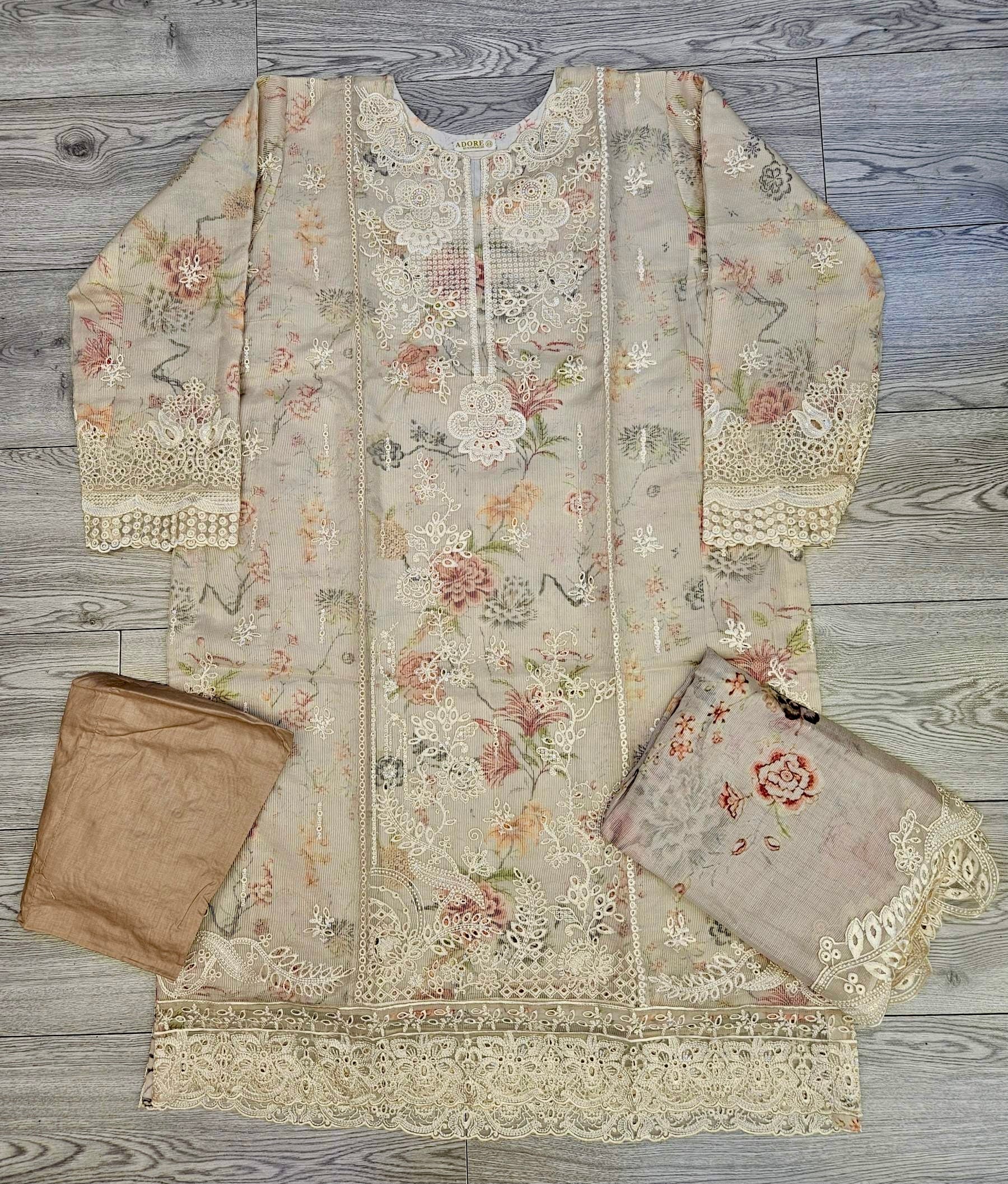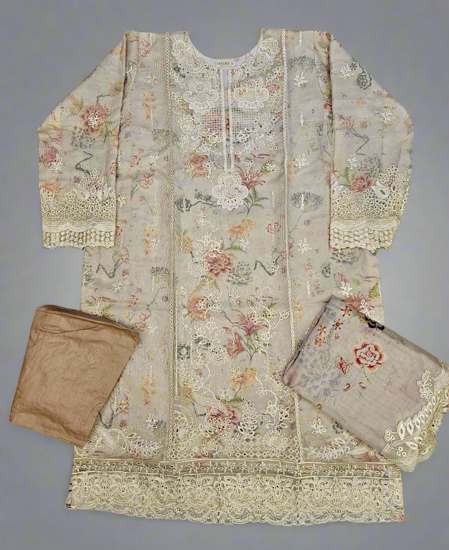 CHRZ Nude Peach Hand Embellished Chiffon Kameez | Embroidered Dupatta & Trousers | Front Split Design