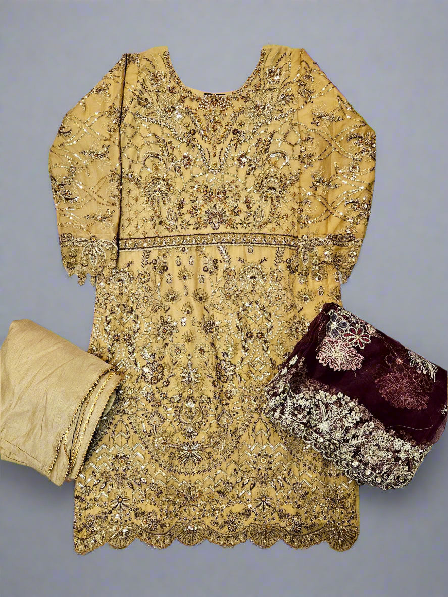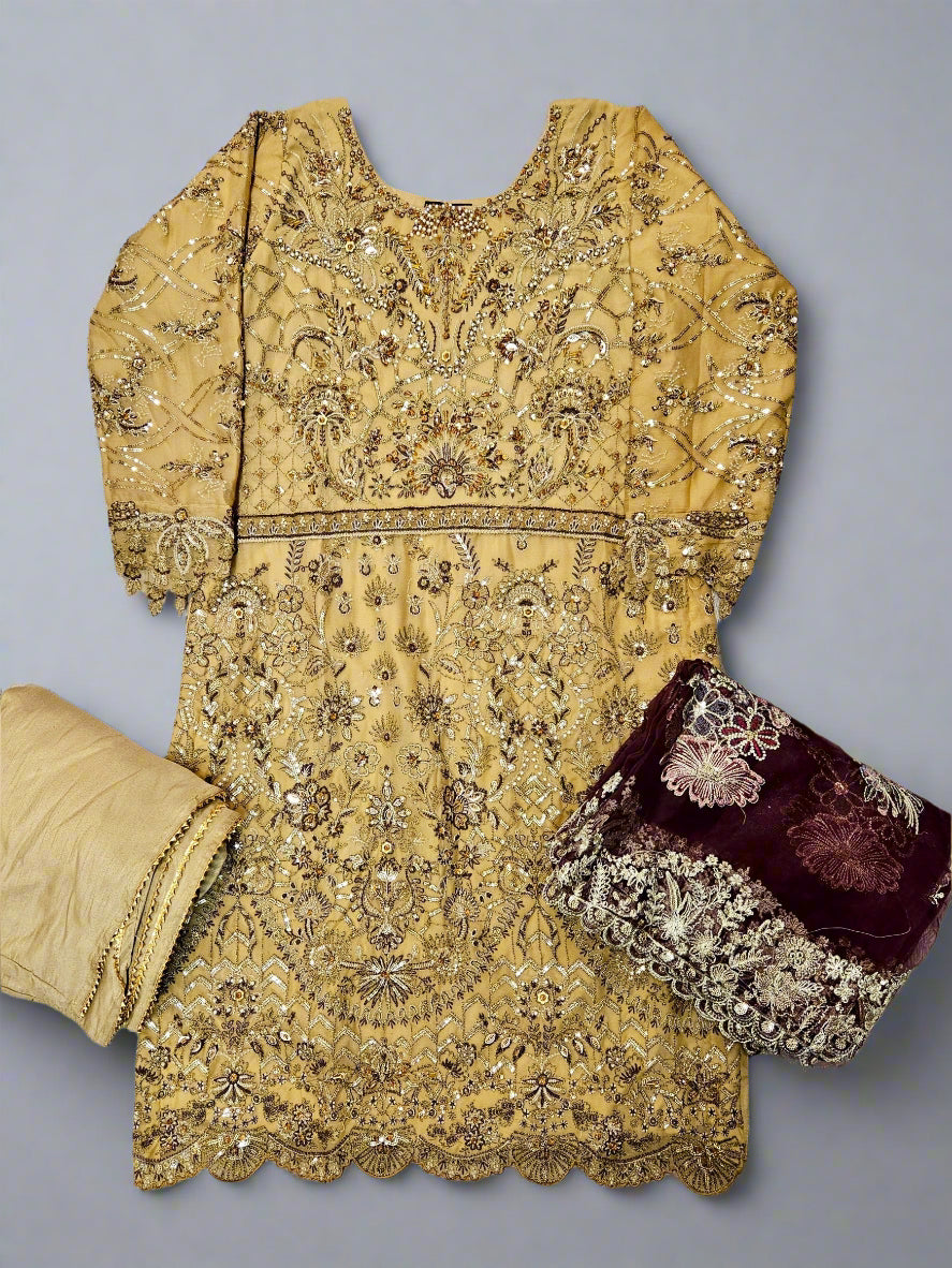 ZC dark beige and plum hand embellished chiffon gharara suit
