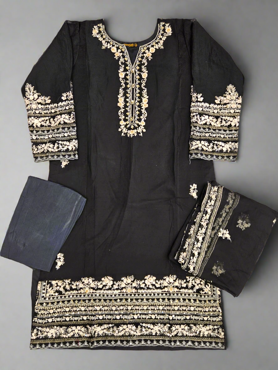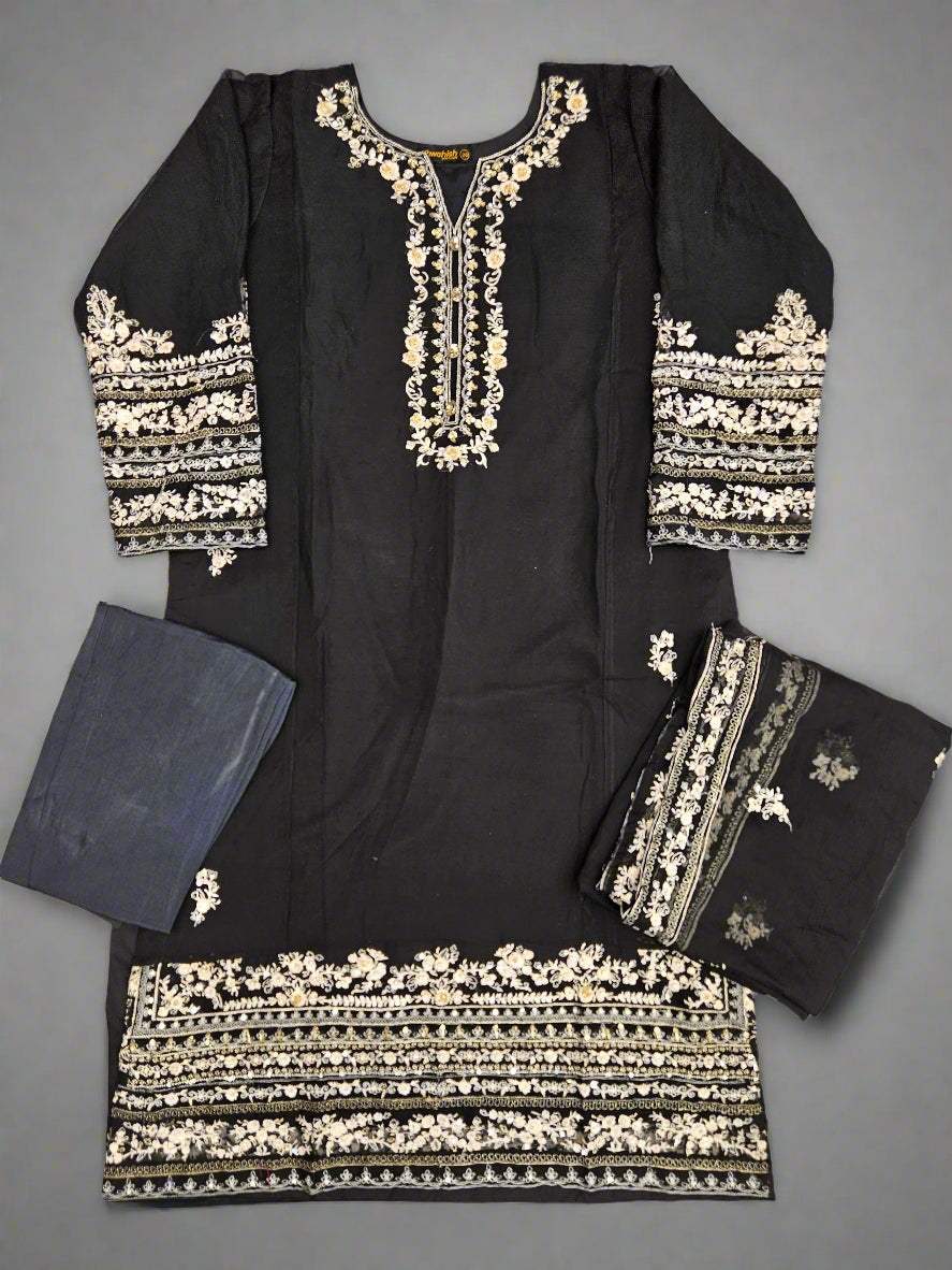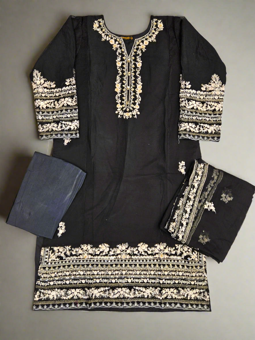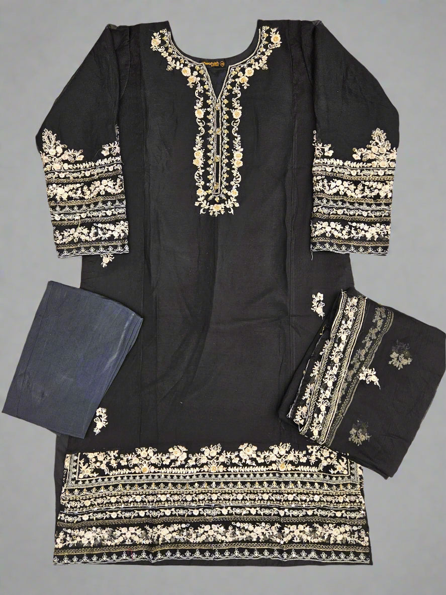 Navy Blue Stone Work Kameez | Silk Sharara & Chiffon Dupatta | 4-Side Embroidered | Sizes Up to 8XL