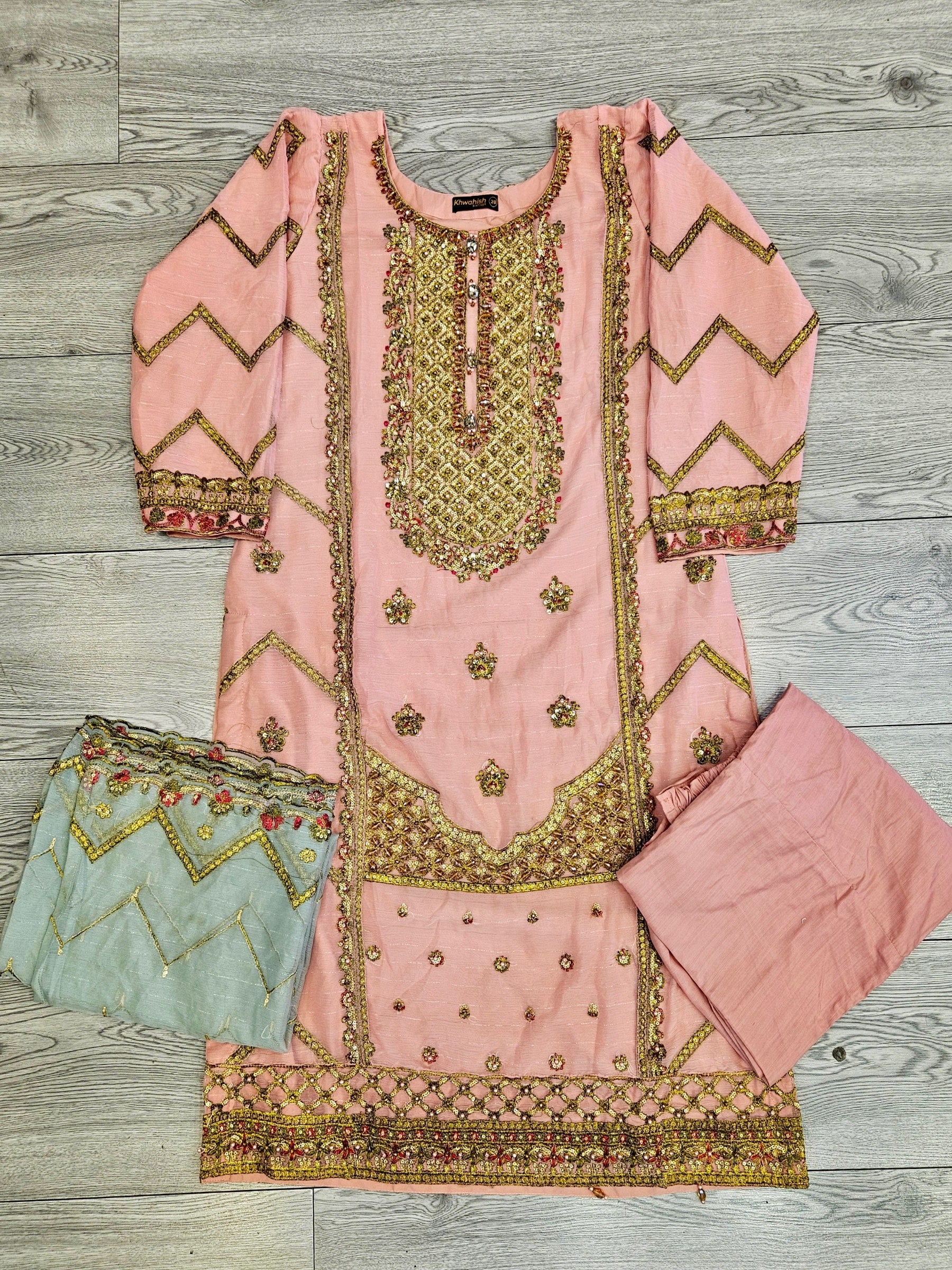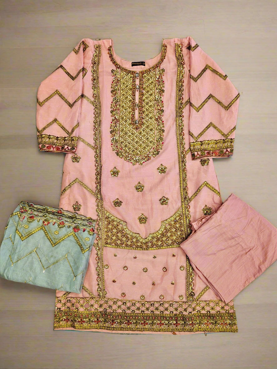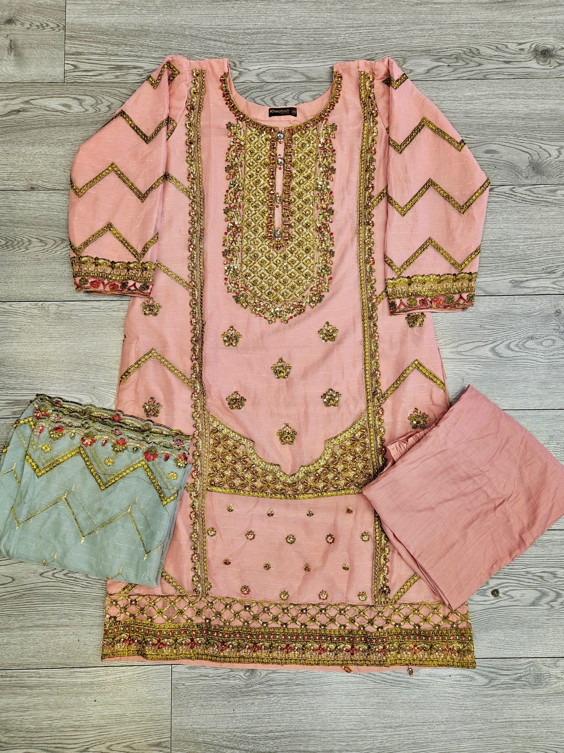 CHRZ Nude Peach Hand Embellished Chiffon Kameez | Embroidered Dupatta & Trousers | Front Split Design