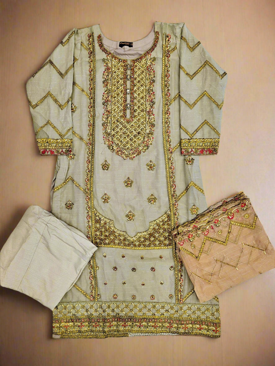CHRZ Nude Peach Hand Embellished Chiffon Kameez | Embroidered Dupatta & Trousers | Front Split Design