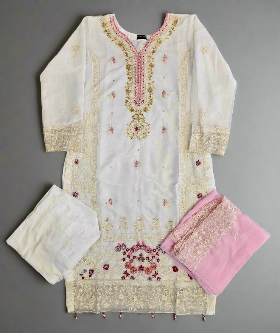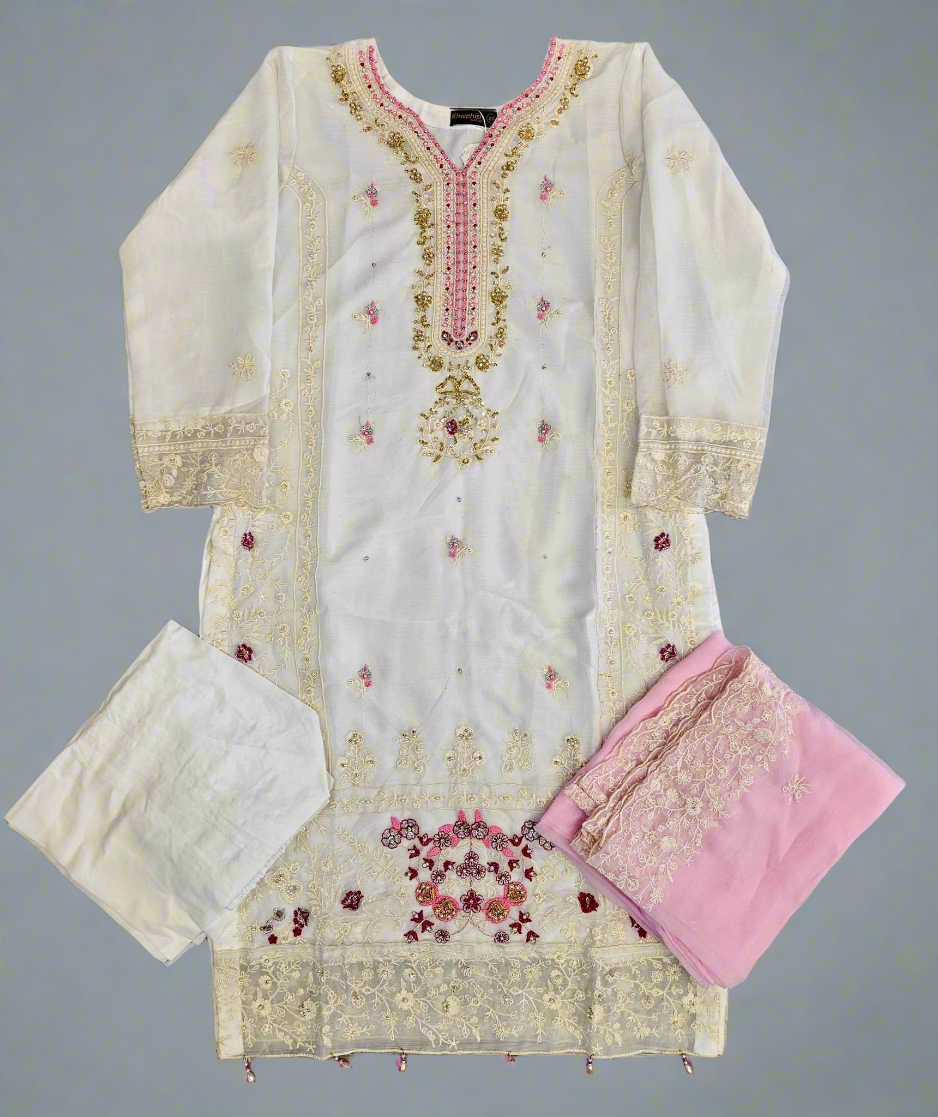 ELF Light Grey Hand Embellished Organza Kameez | Pink Crystal Detail | Sizes Up to 8XL