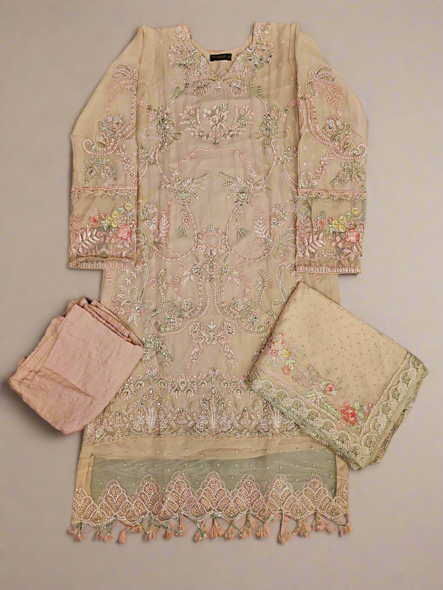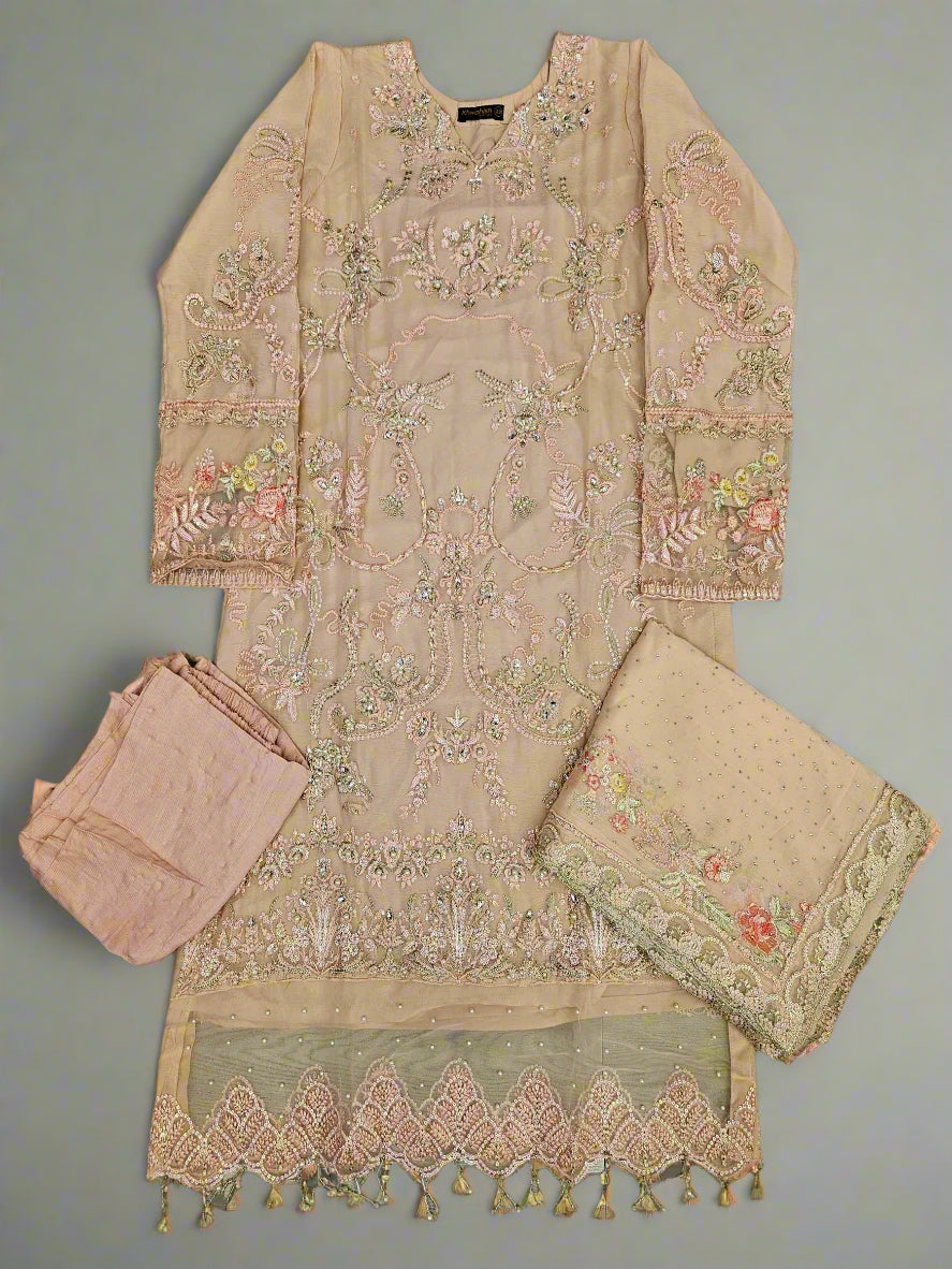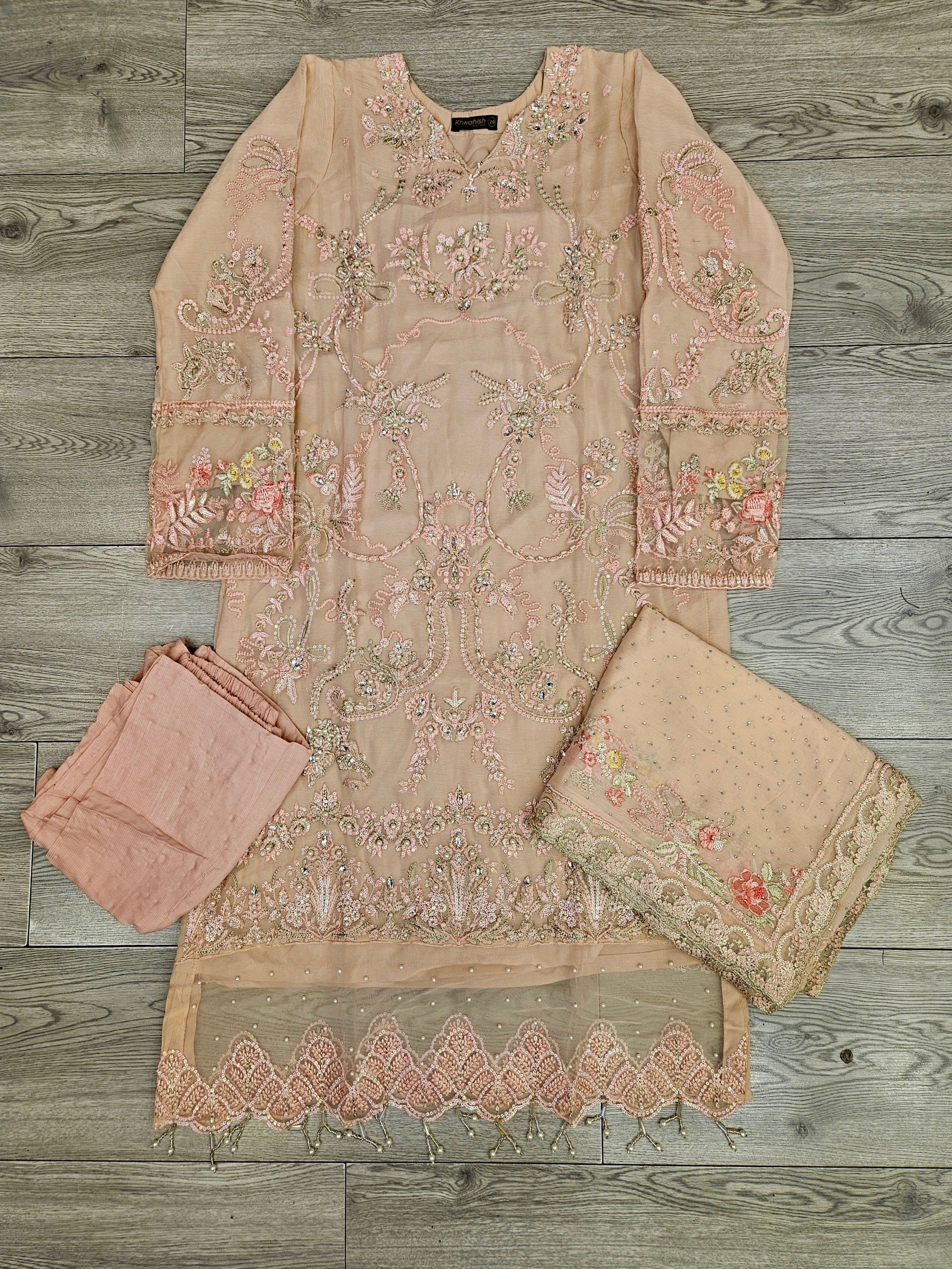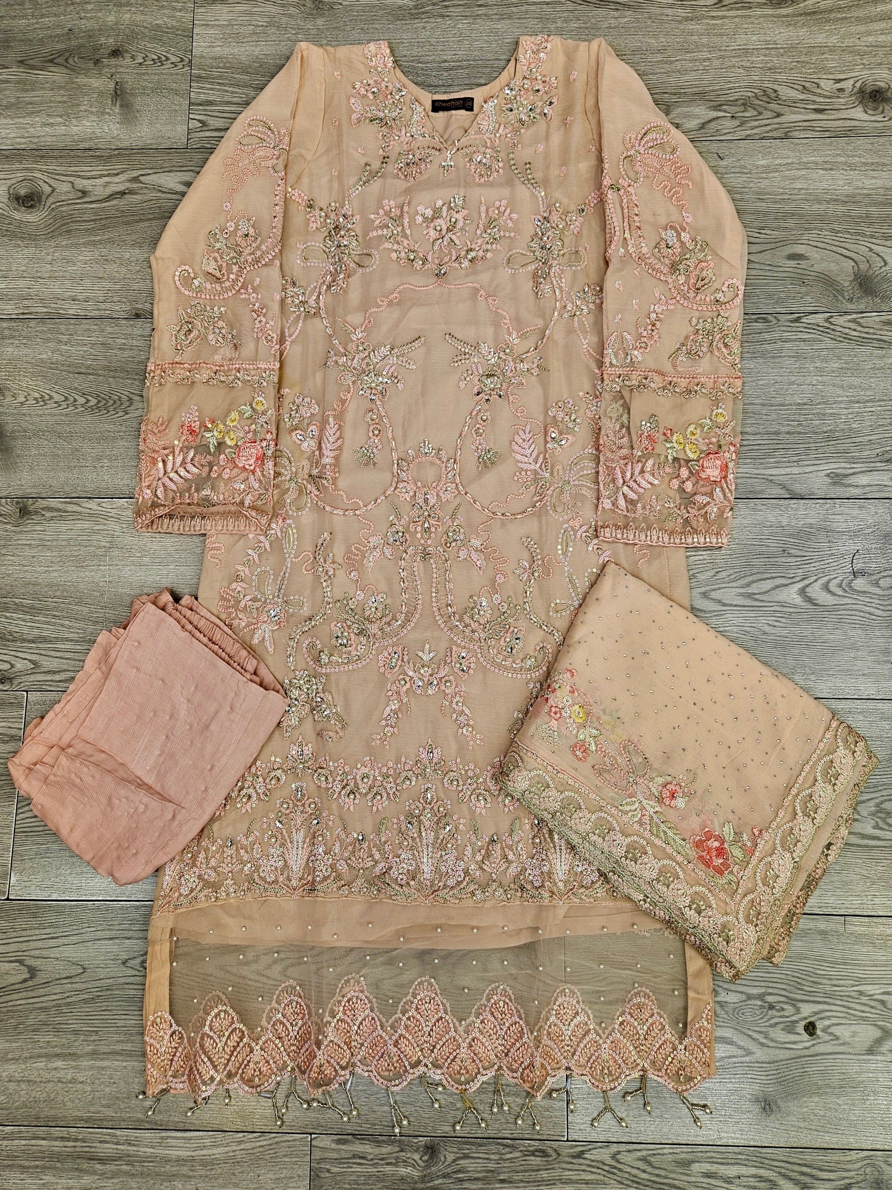 CHRZ Nude Peach Hand Embellished Chiffon Kameez | Embroidered Dupatta & Trousers | Front Split Design
