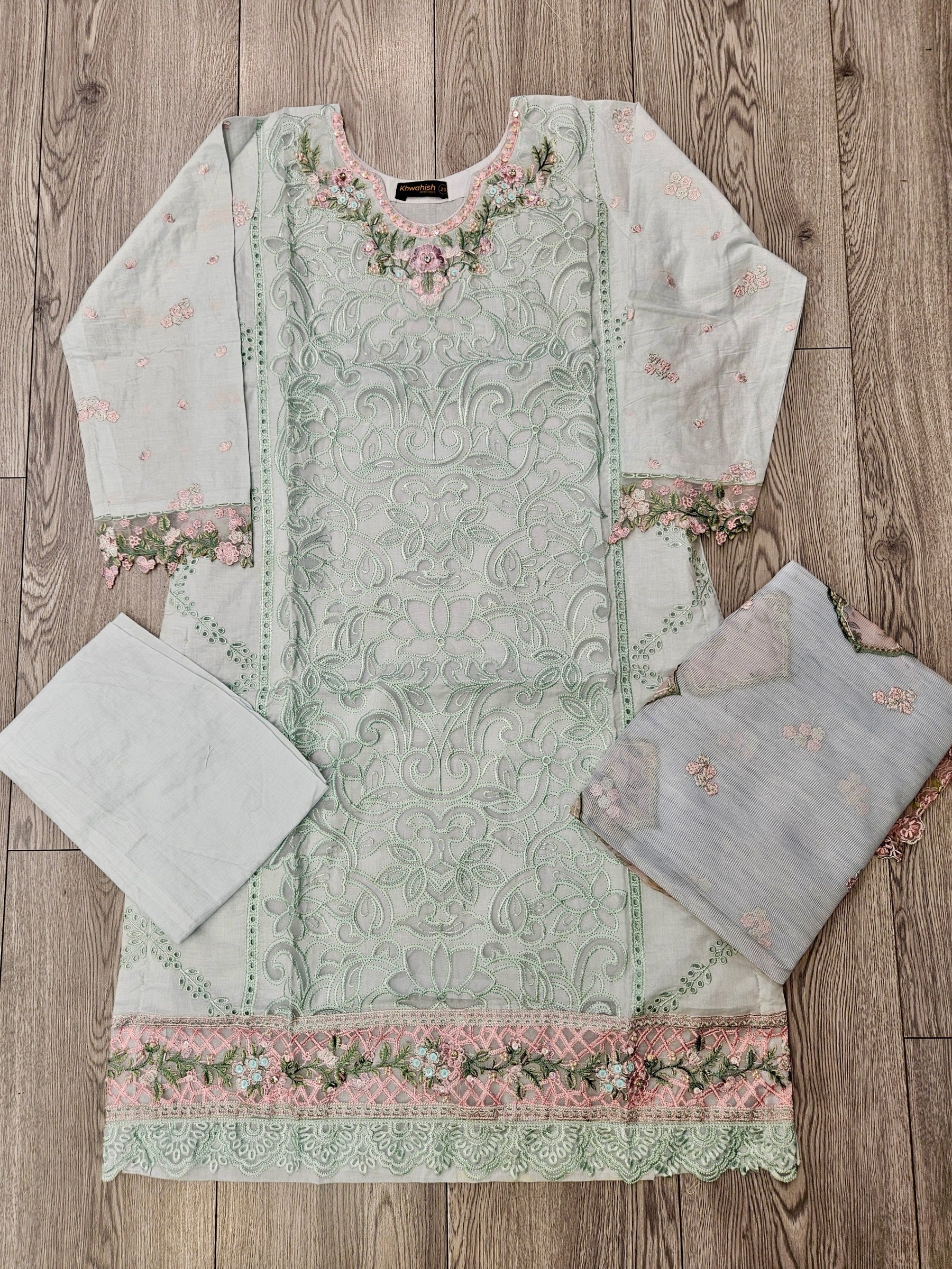 ELF Light Grey Hand Embellished Organza Kameez | Pink Crystal Detail | Sizes Up to 8XL