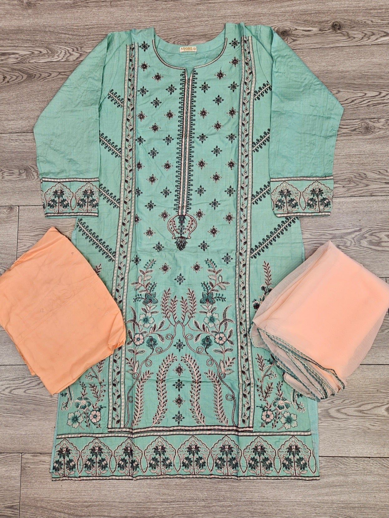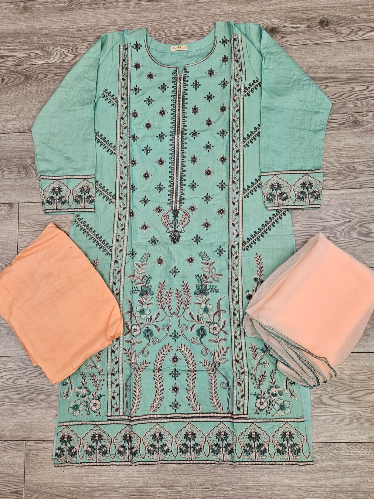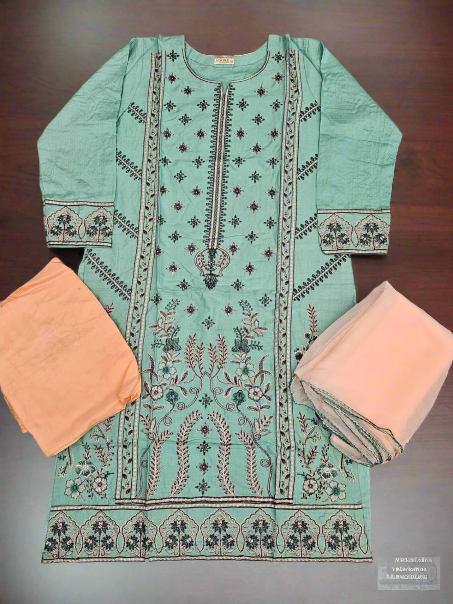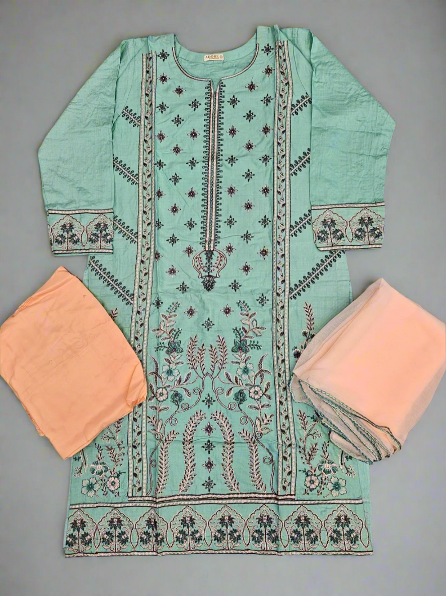 CRM blue green and peach colour thread embroidery linen fabric shalwar kameez