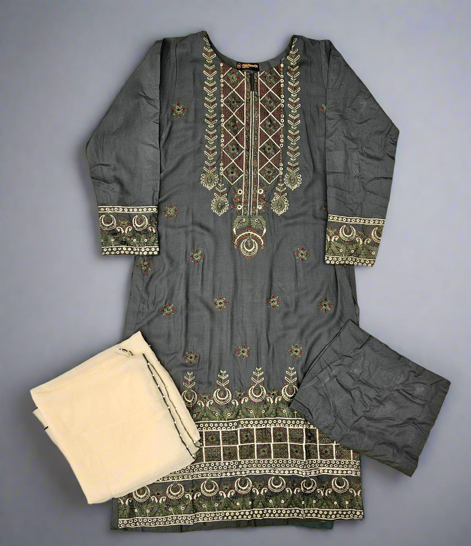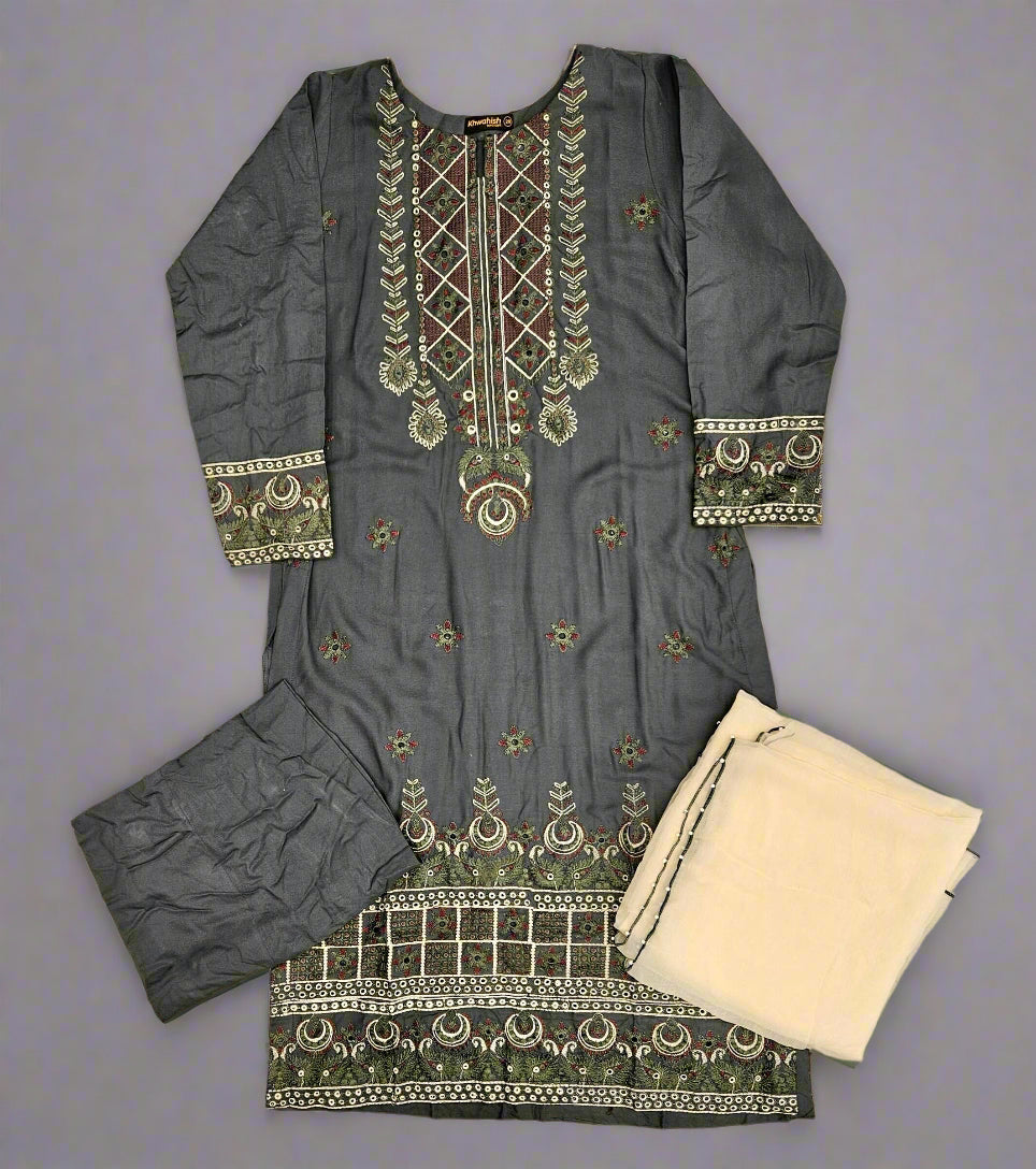 Navy Blue Stone Work Kameez | Silk Sharara & Chiffon Dupatta | 4-Side Embroidered | Sizes Up to 8XL