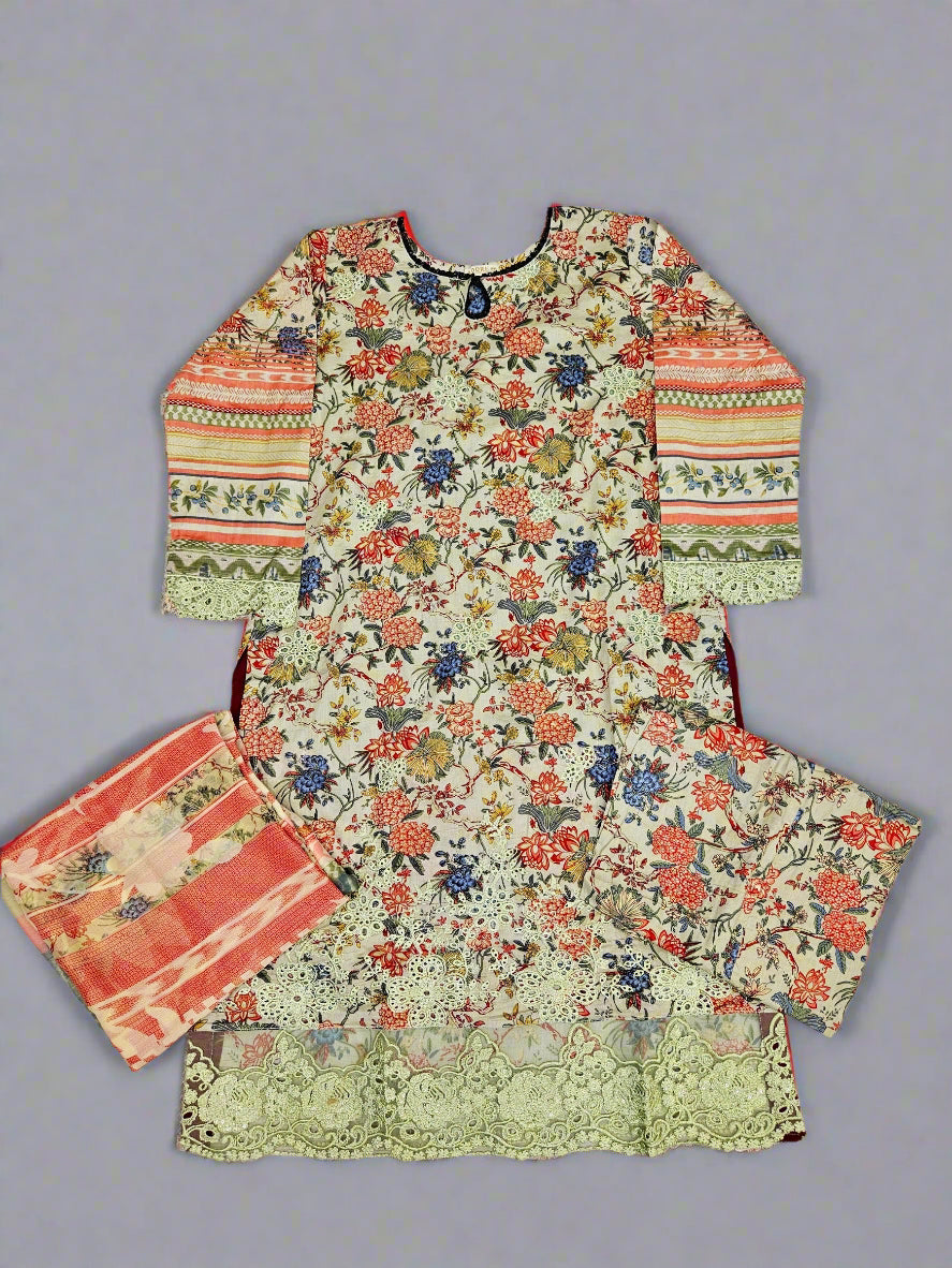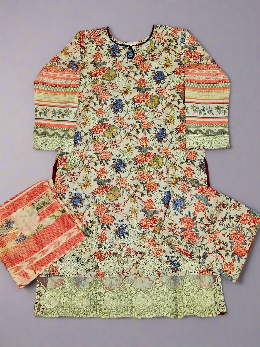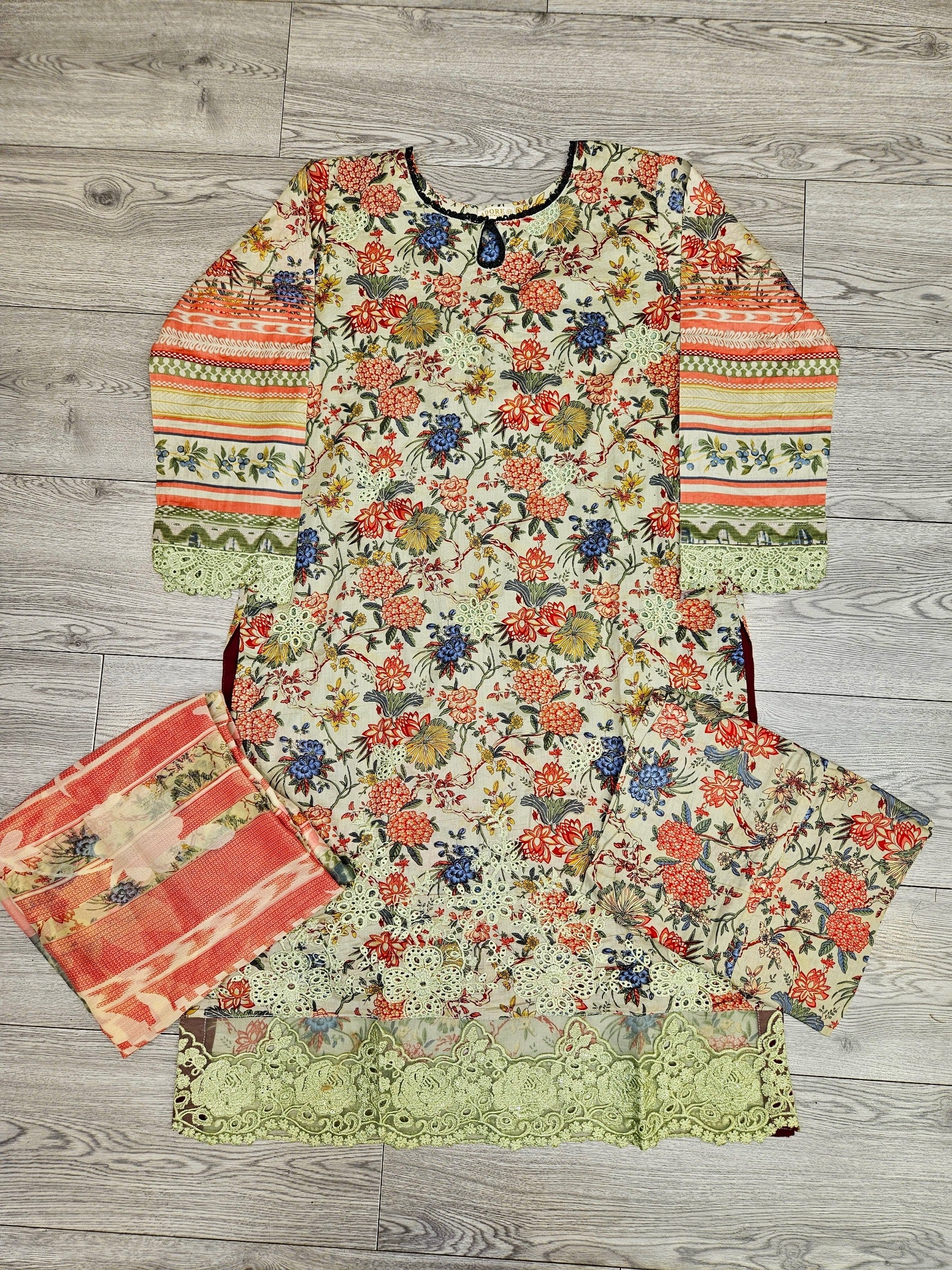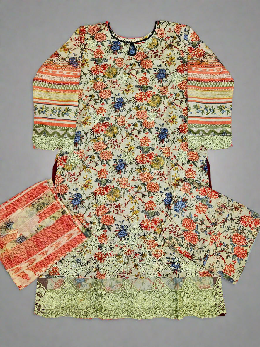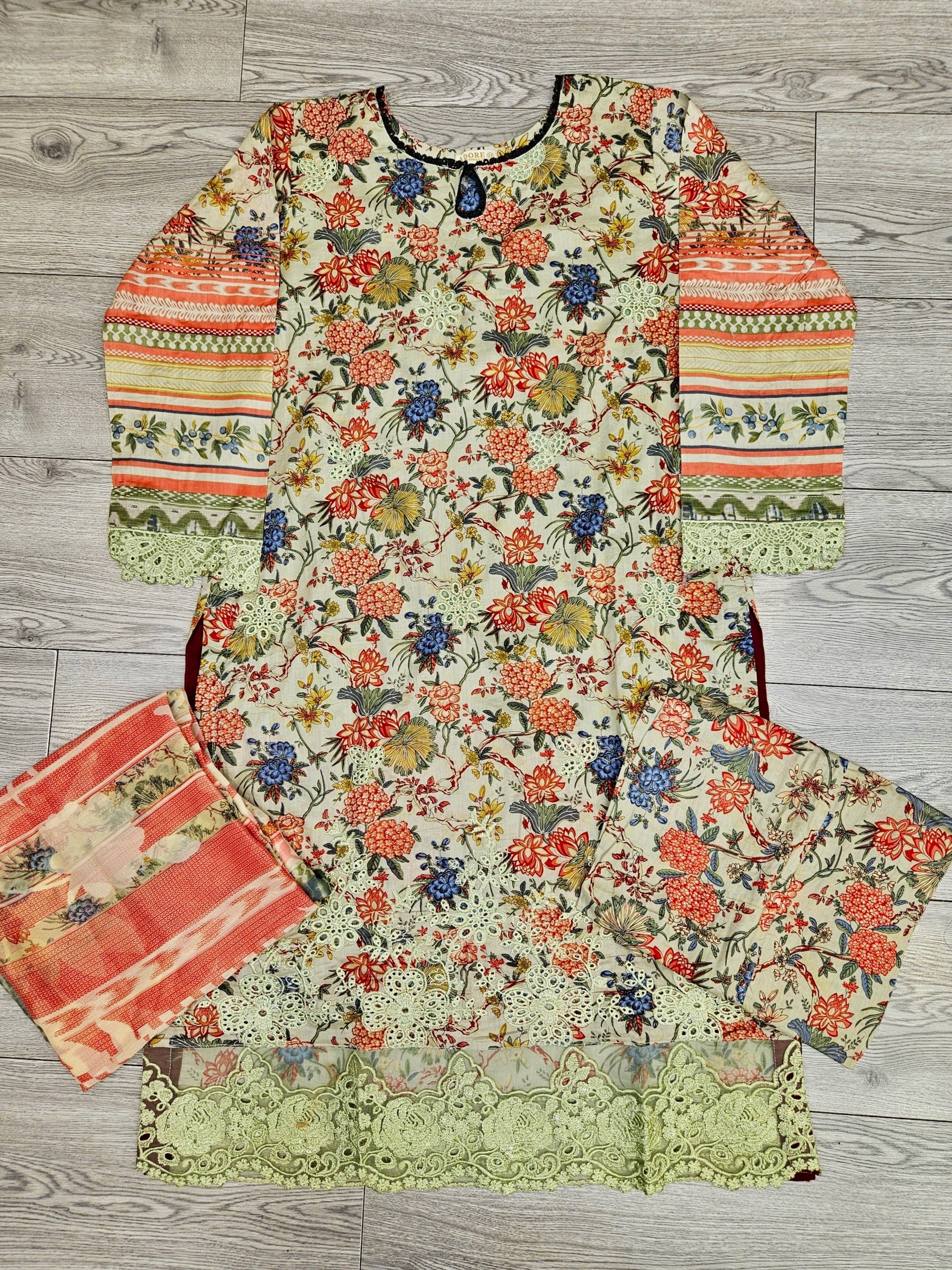 Sea Green & Mint Linen Viscose Suit | Orange Pink Symmetrical Print | Chikan Embroidery | Sizes Up to 8XL