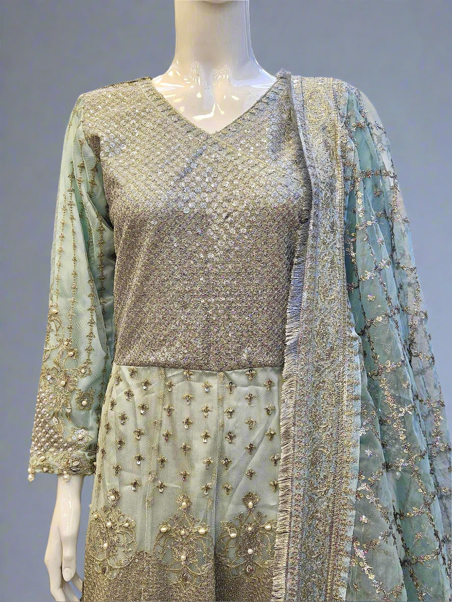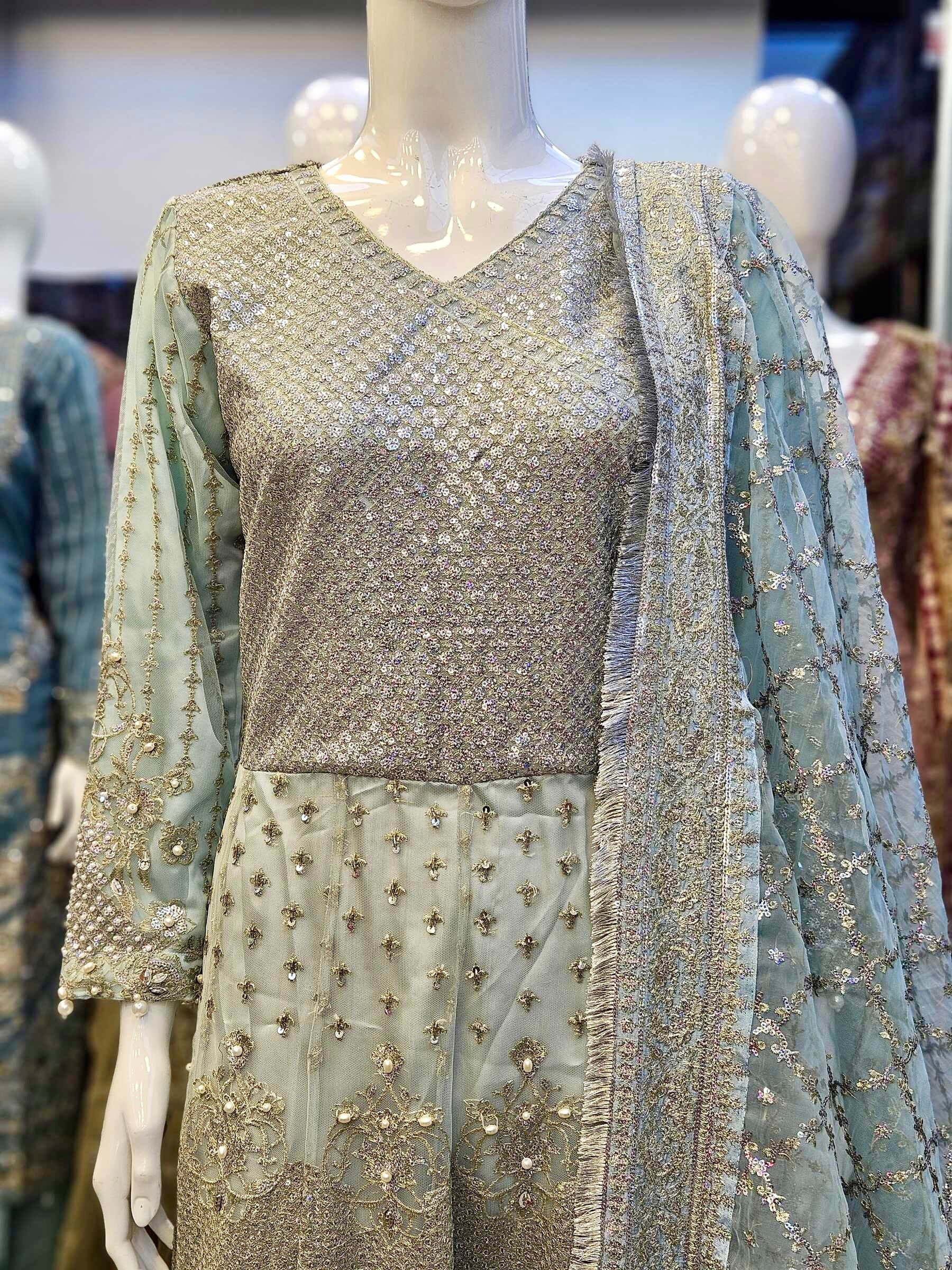 Navy Blue Stone Work Kameez | Silk Sharara & Chiffon Dupatta | 4-Side Embroidered | Sizes Up to 8XL