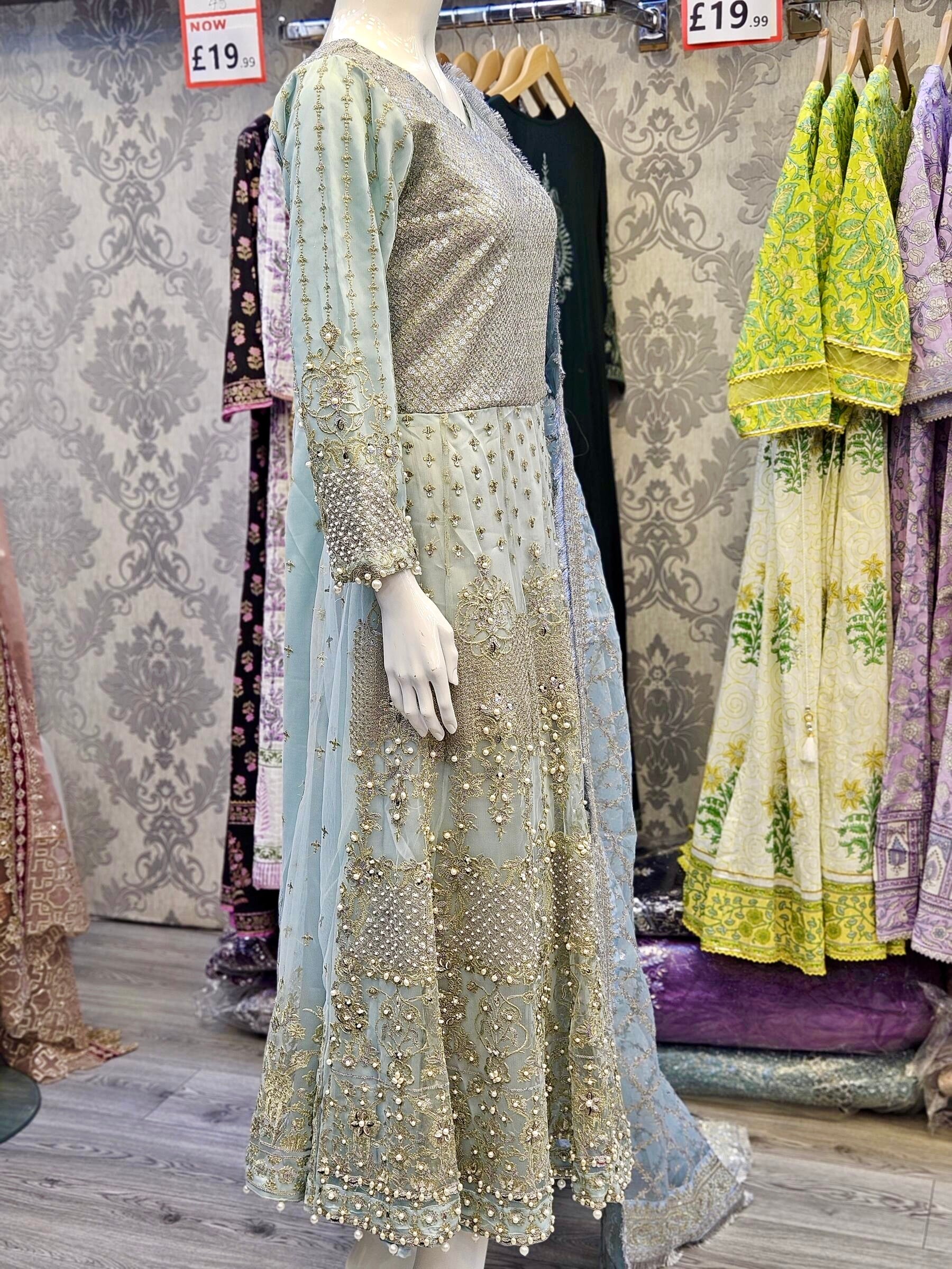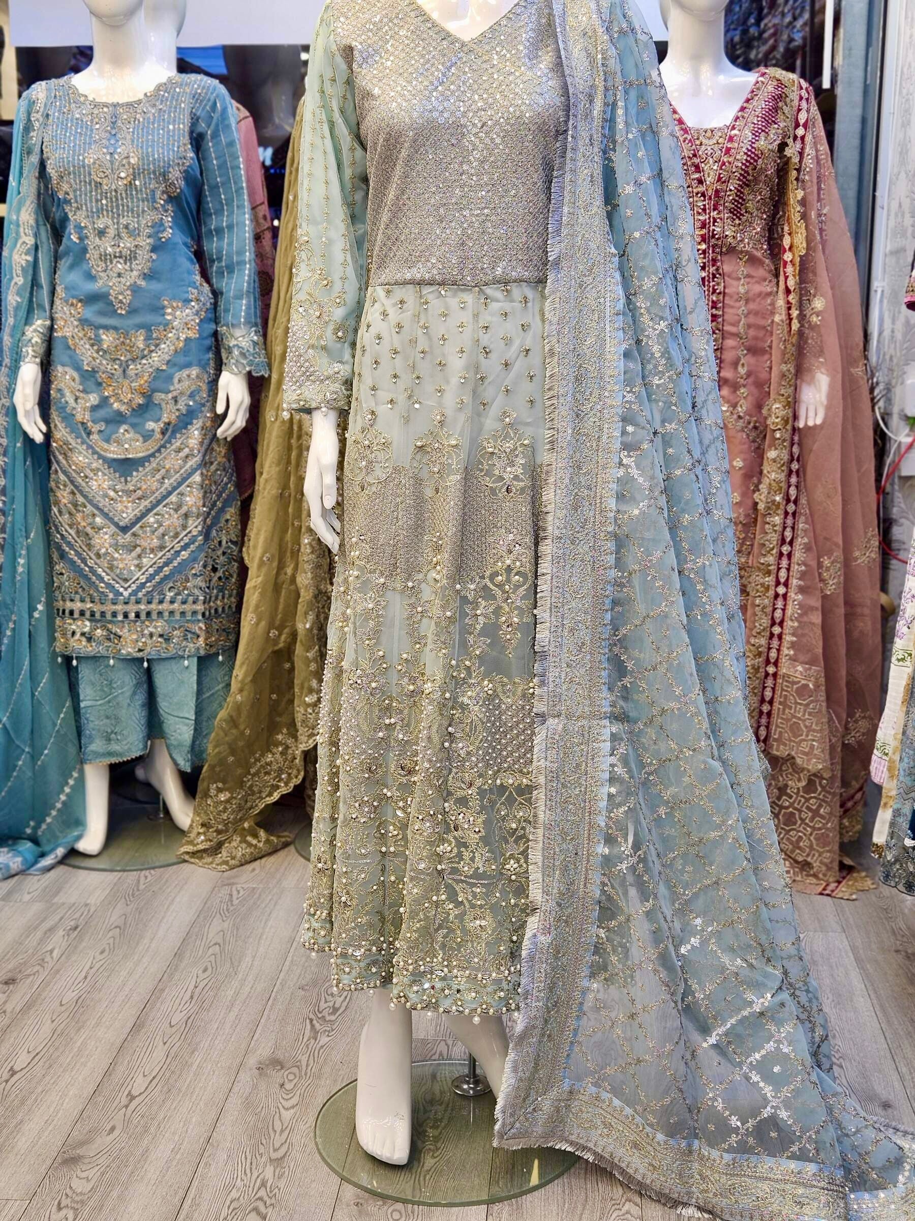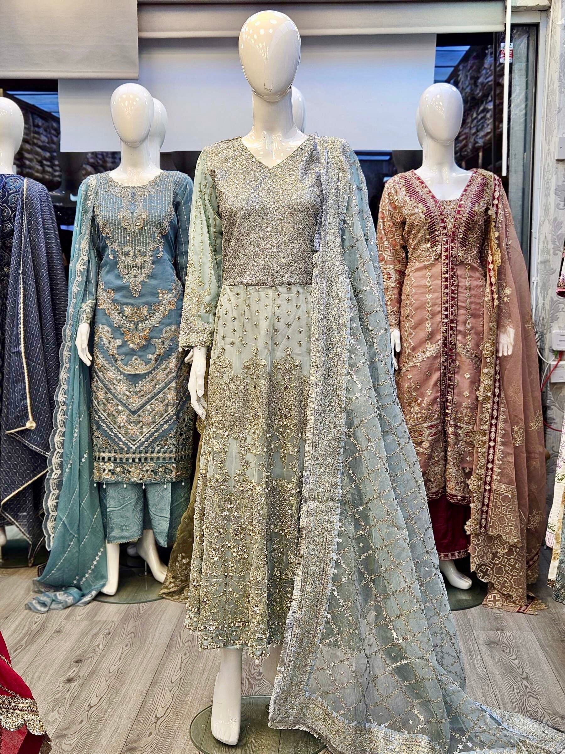 ELF Light Grey Hand Embellished Organza Kameez | Pink Crystal Detail | Sizes Up to 8XL