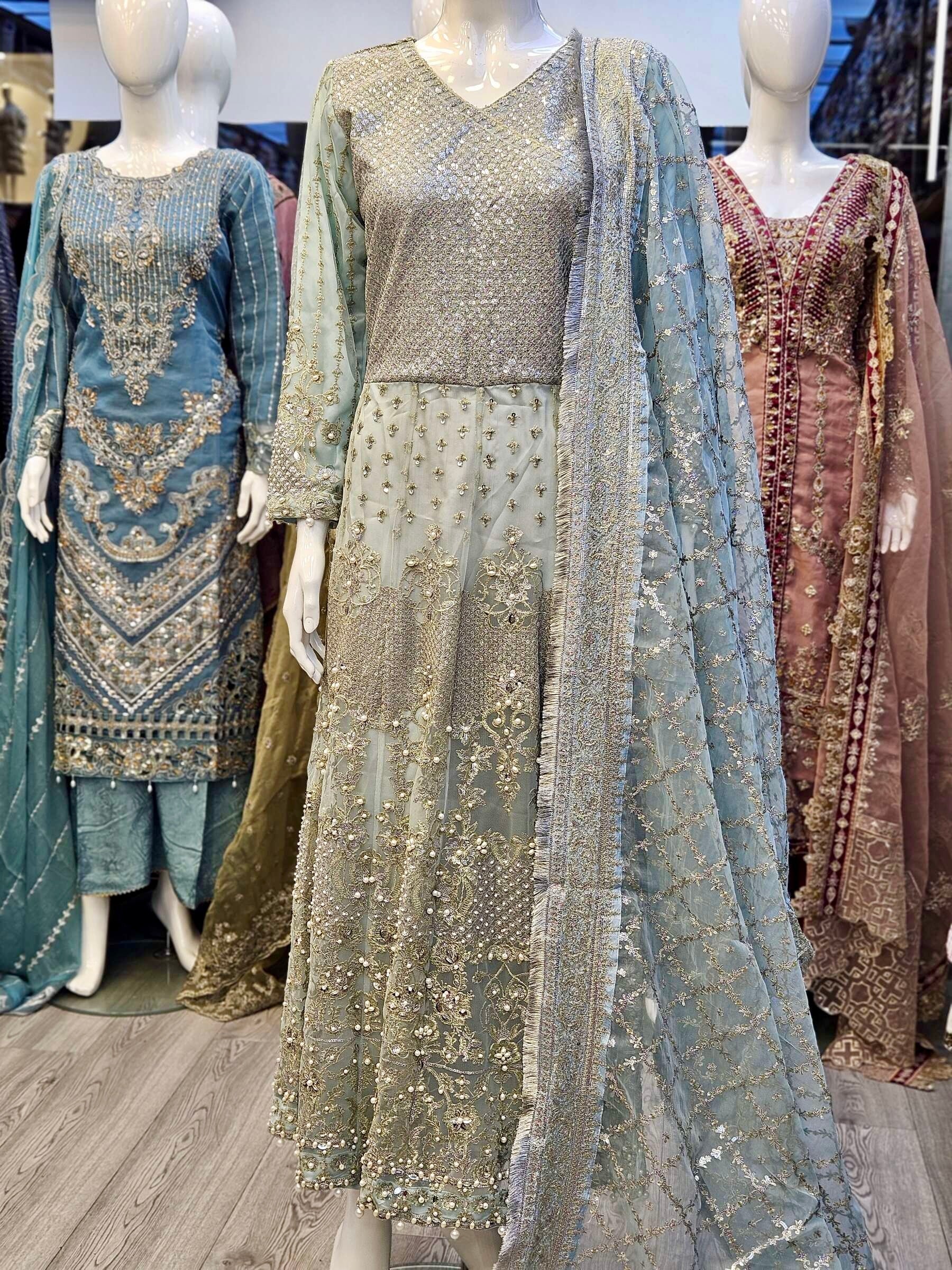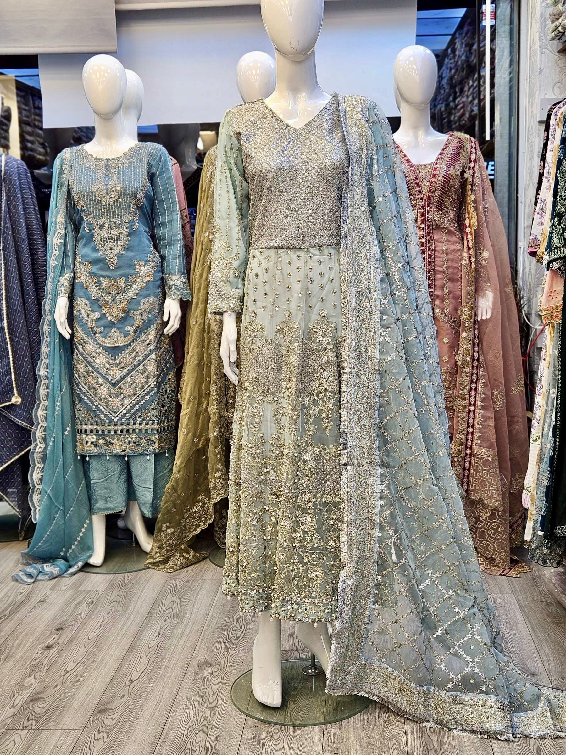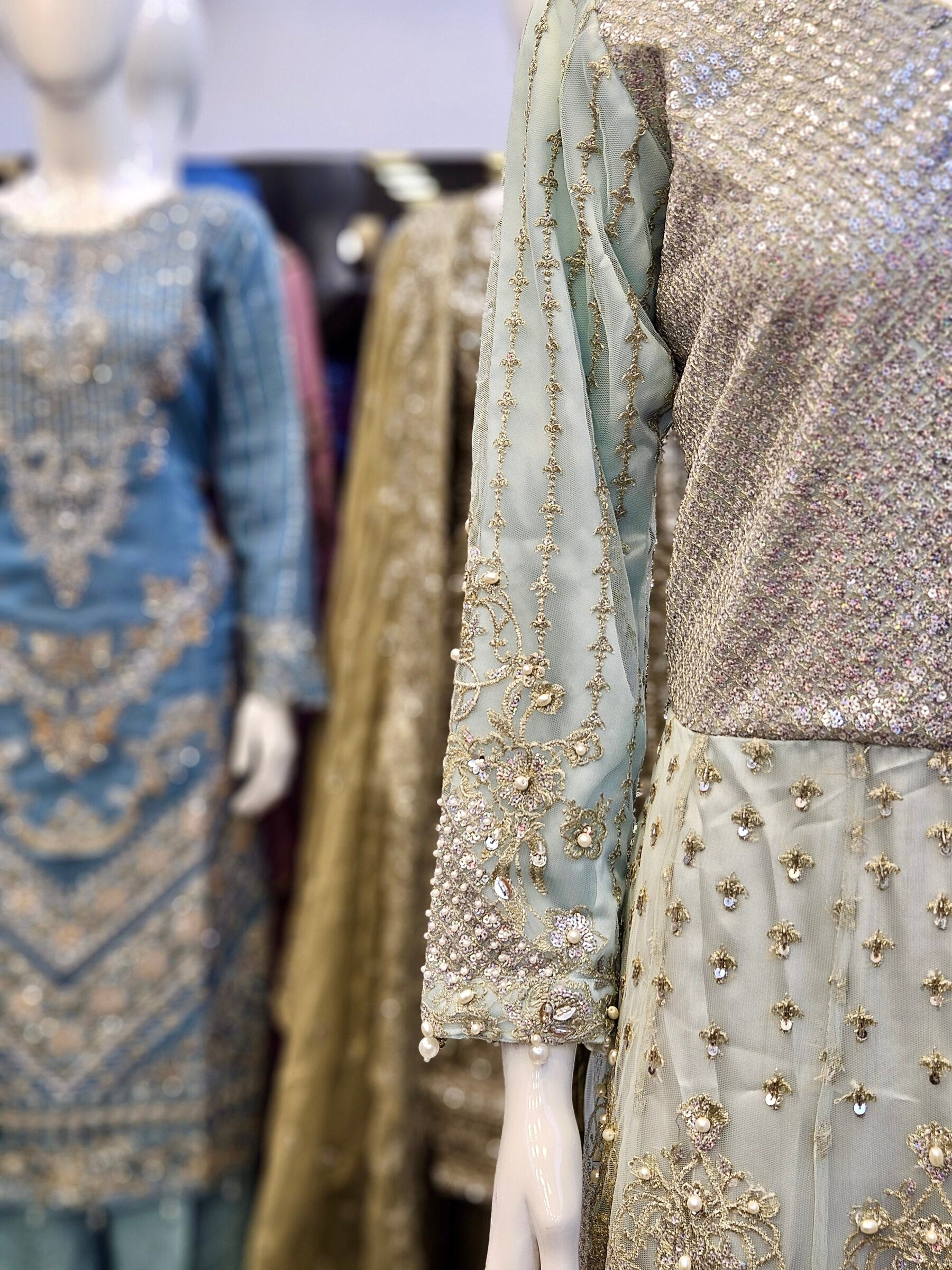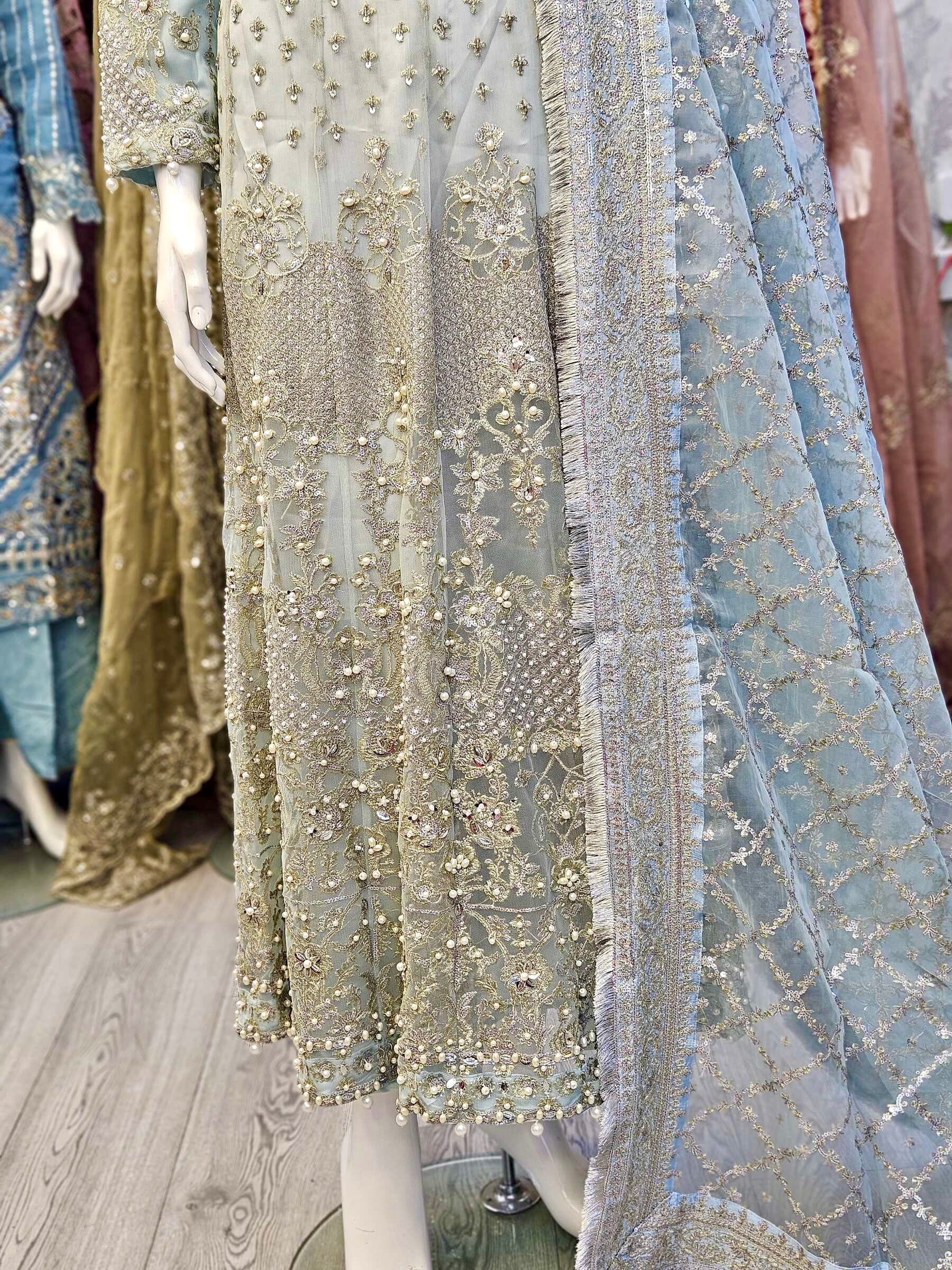 ELF Light Grey Hand Embellished Organza Kameez | Pink Crystal Detail | Sizes Up to 8XL