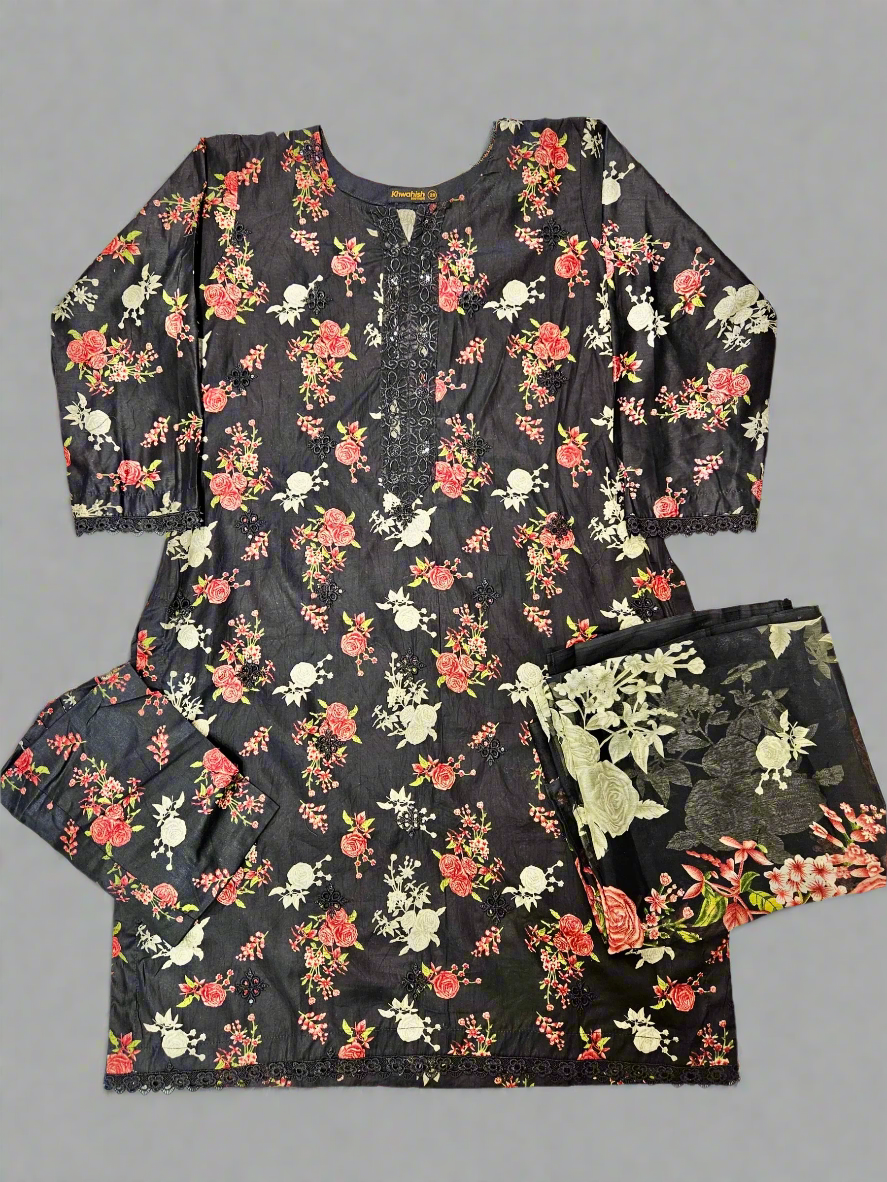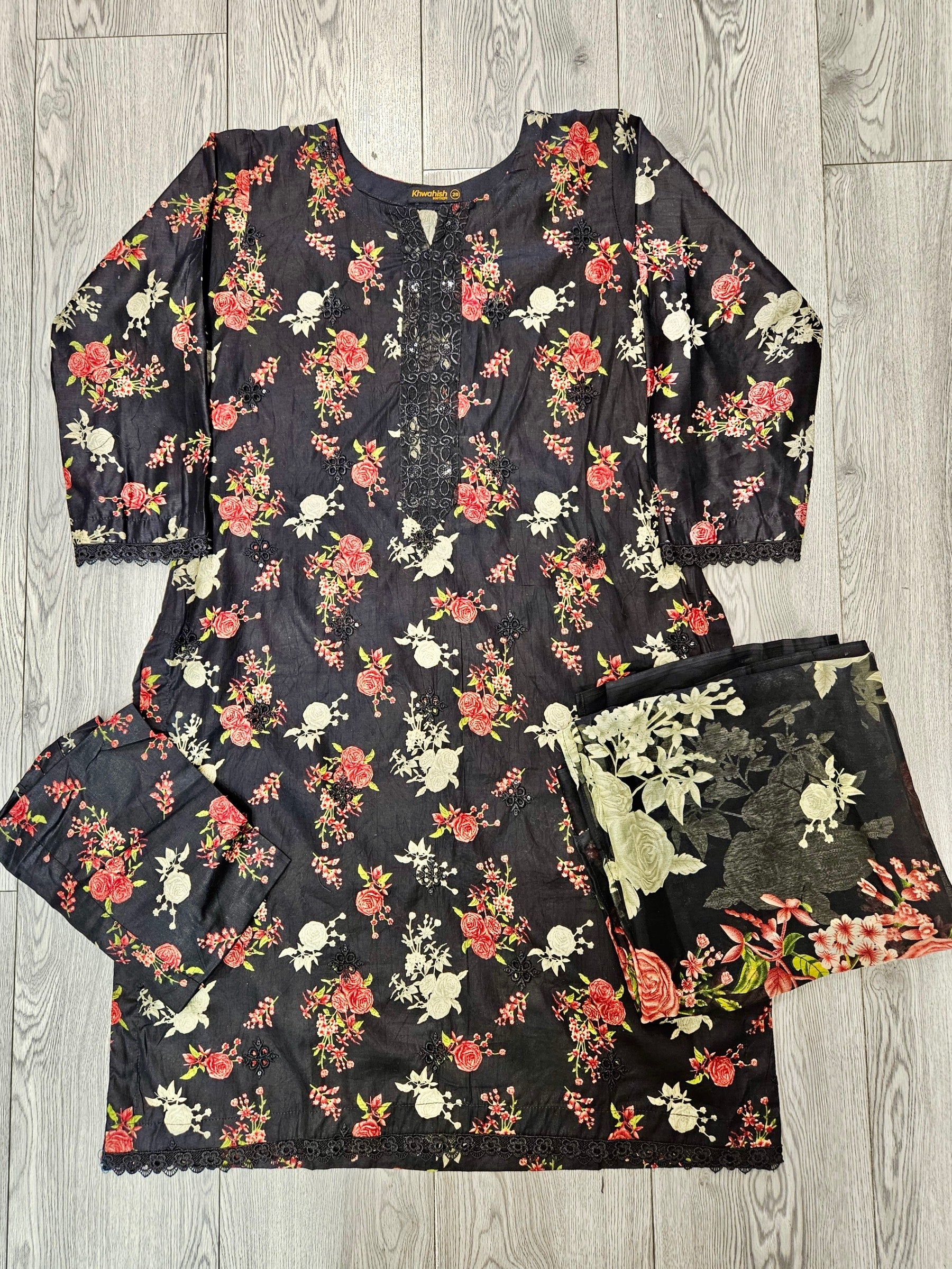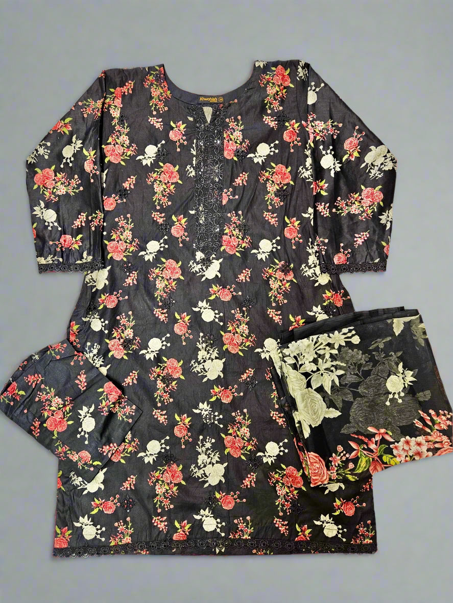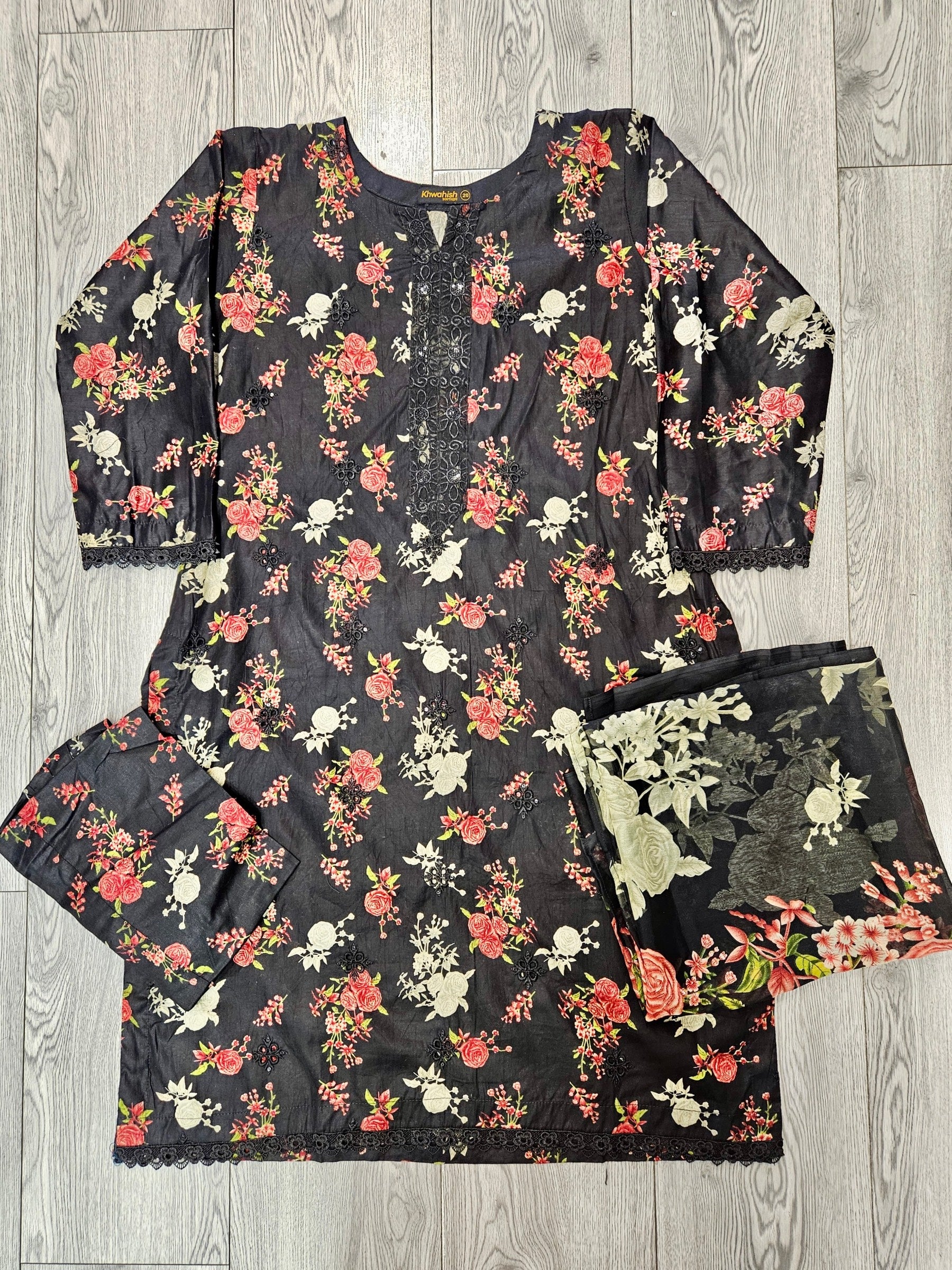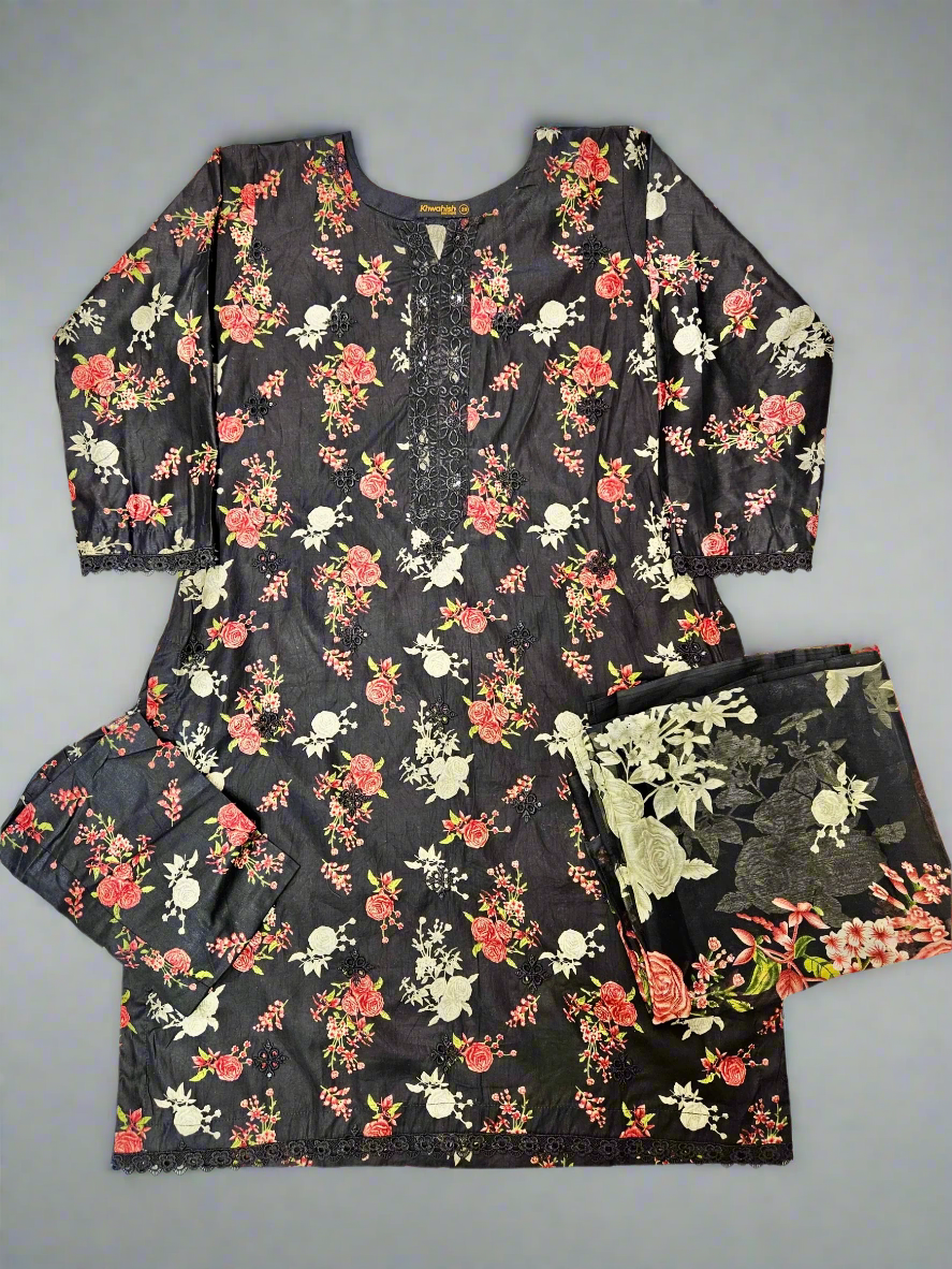 IZK black and crimson red colour floral print cotton shalwar kameez