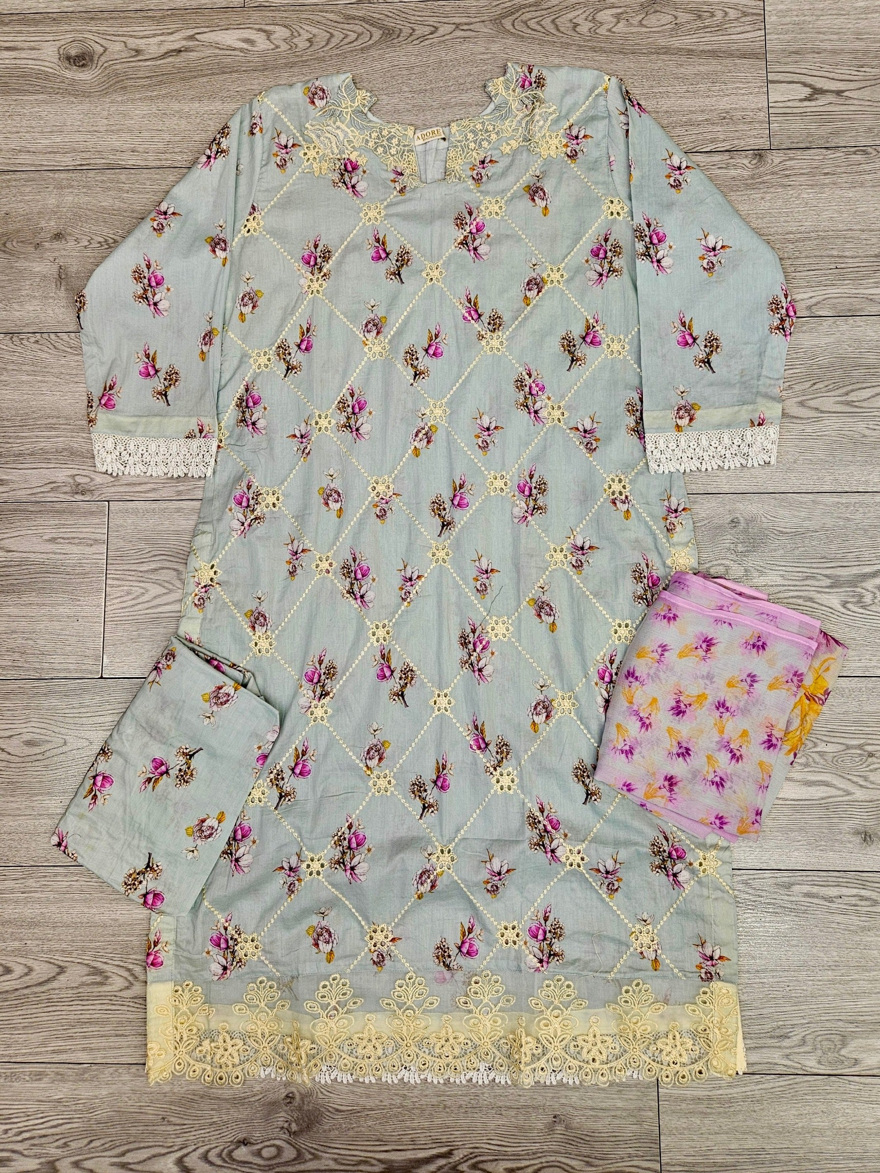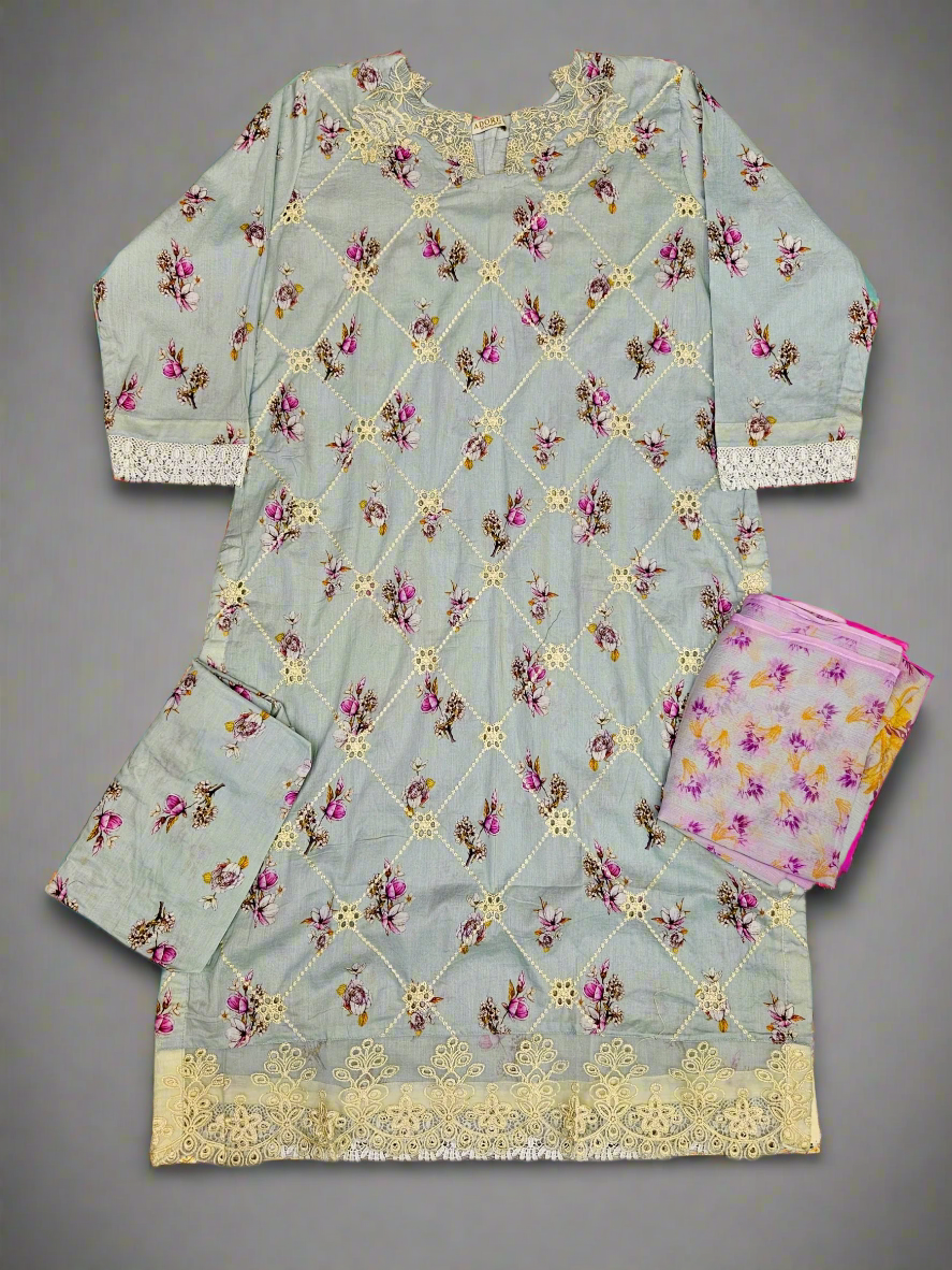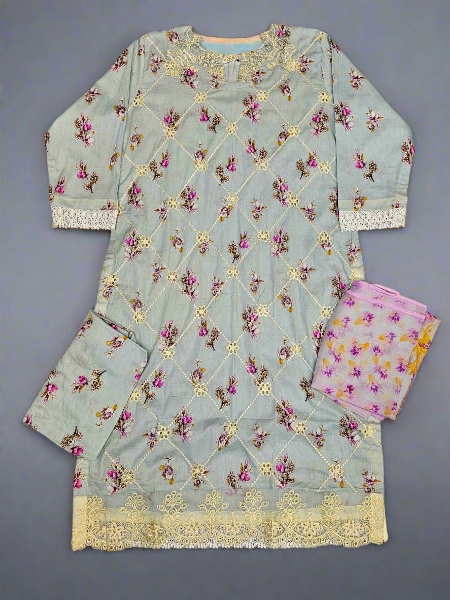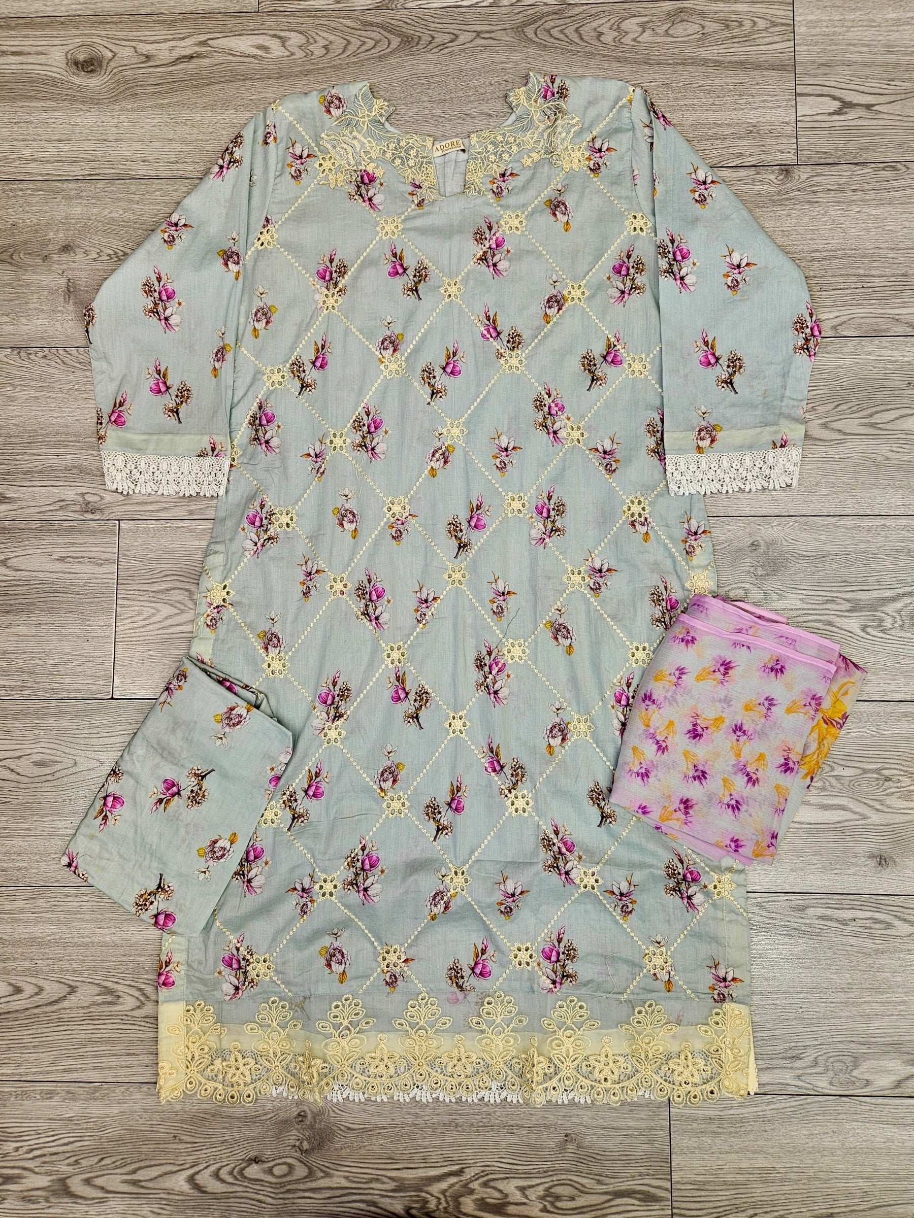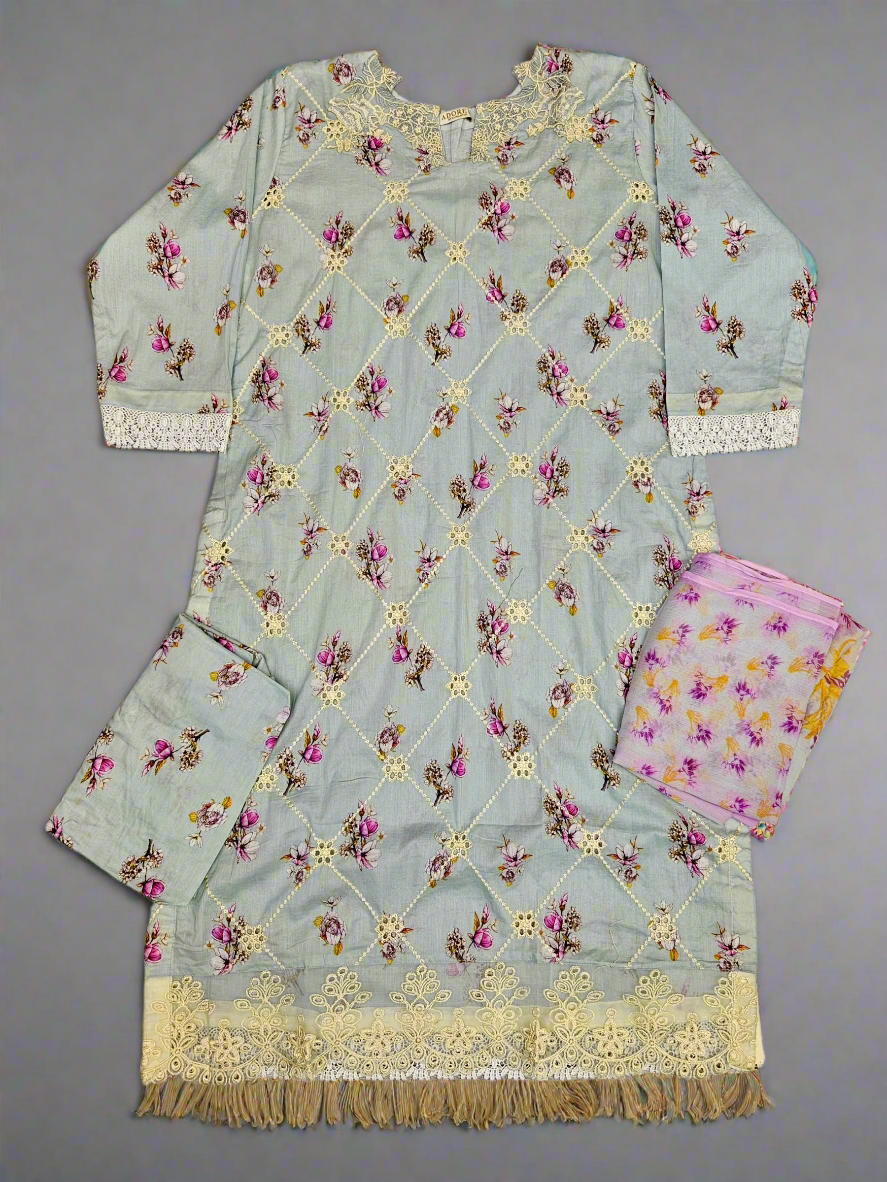Sea Green & Mint Linen Viscose Suit | Orange Pink Symmetrical Print | Chikan Embroidery | Sizes Up to 8XL