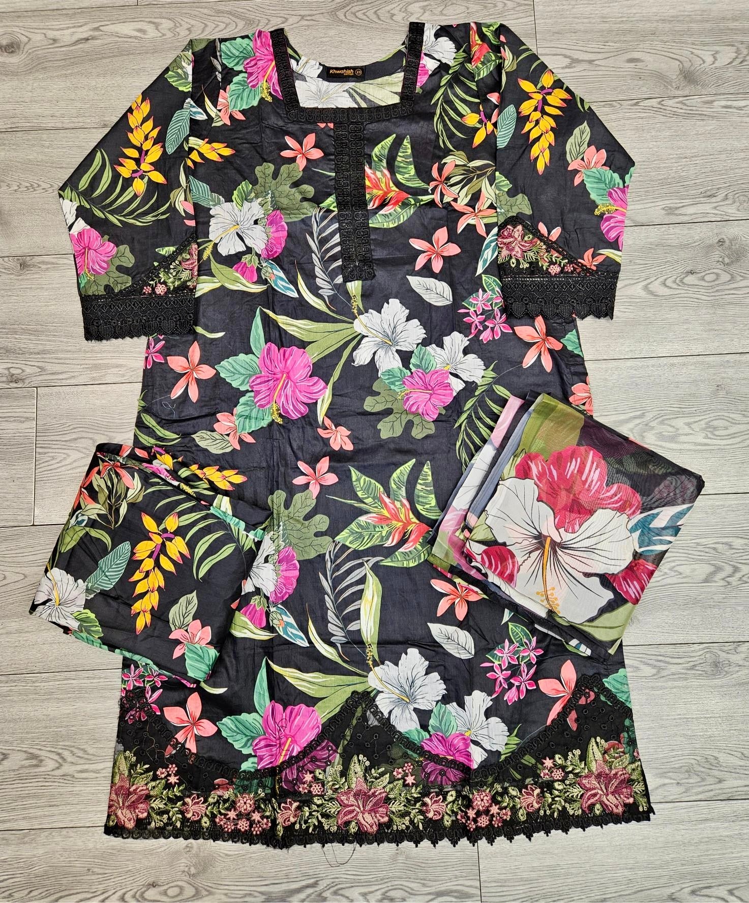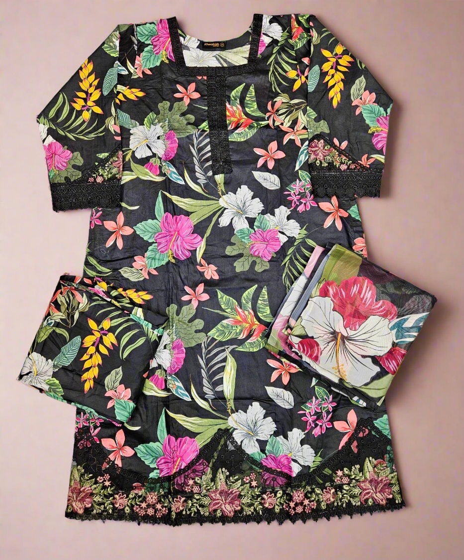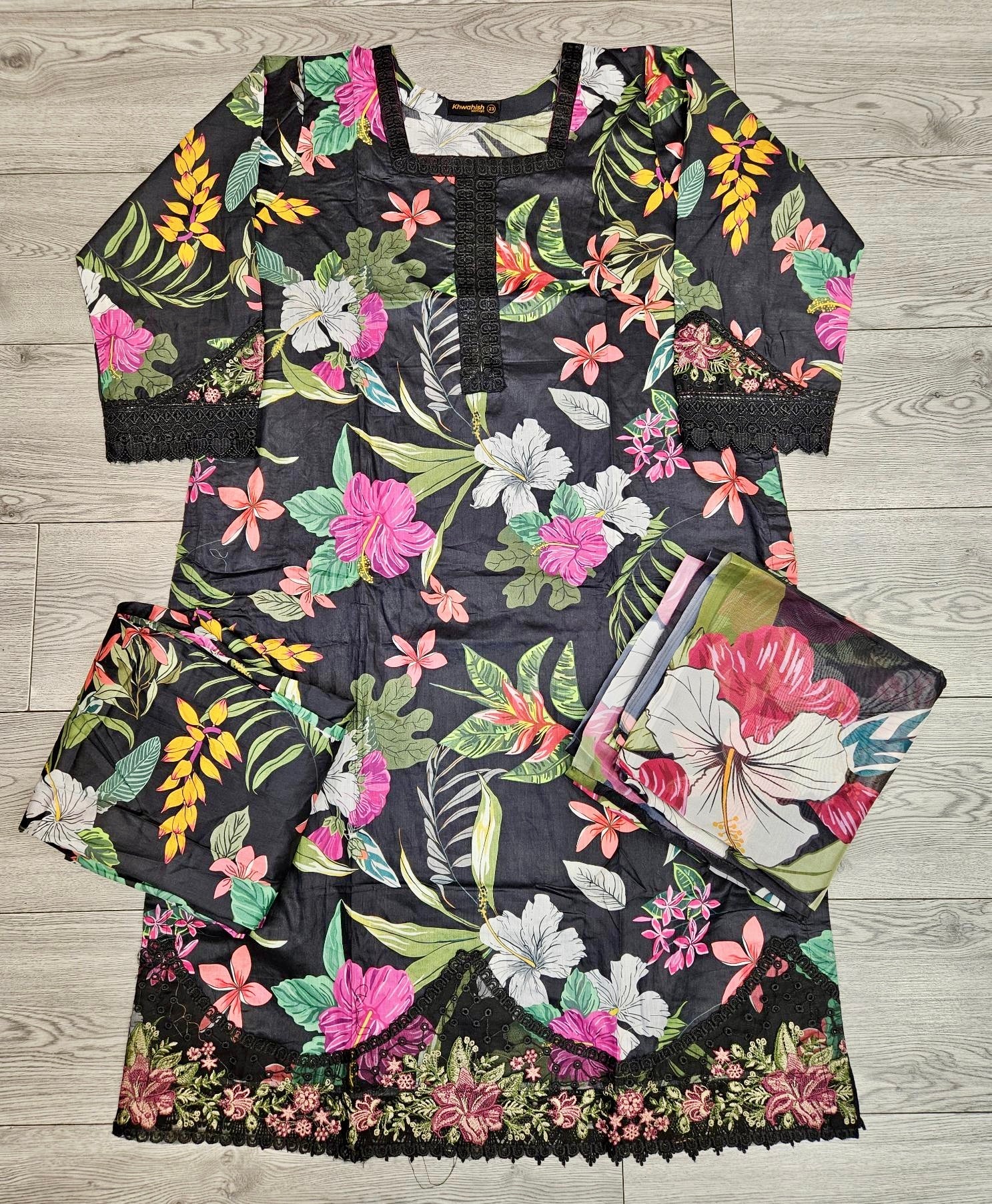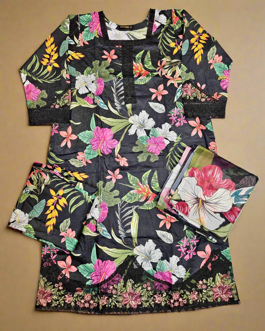MB Black and pink colour floral print with embroidery cotton fabric
