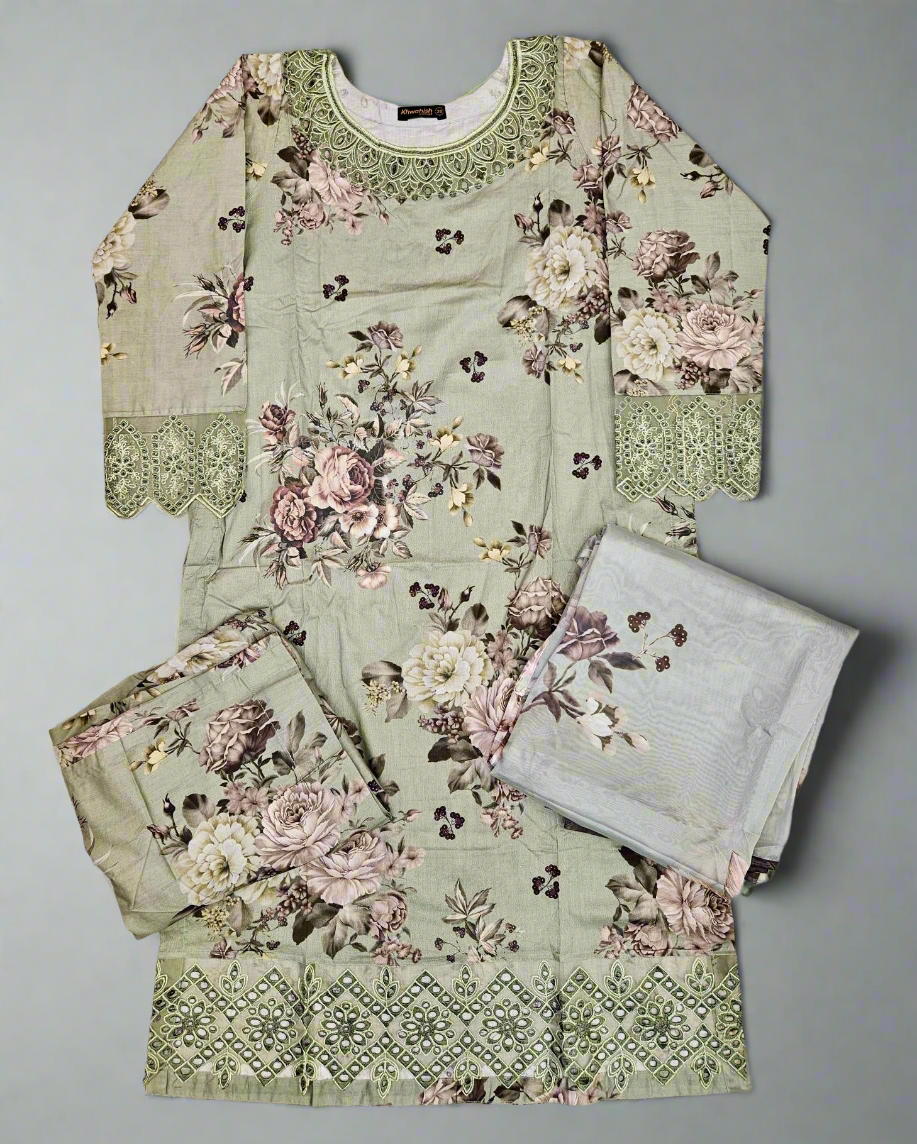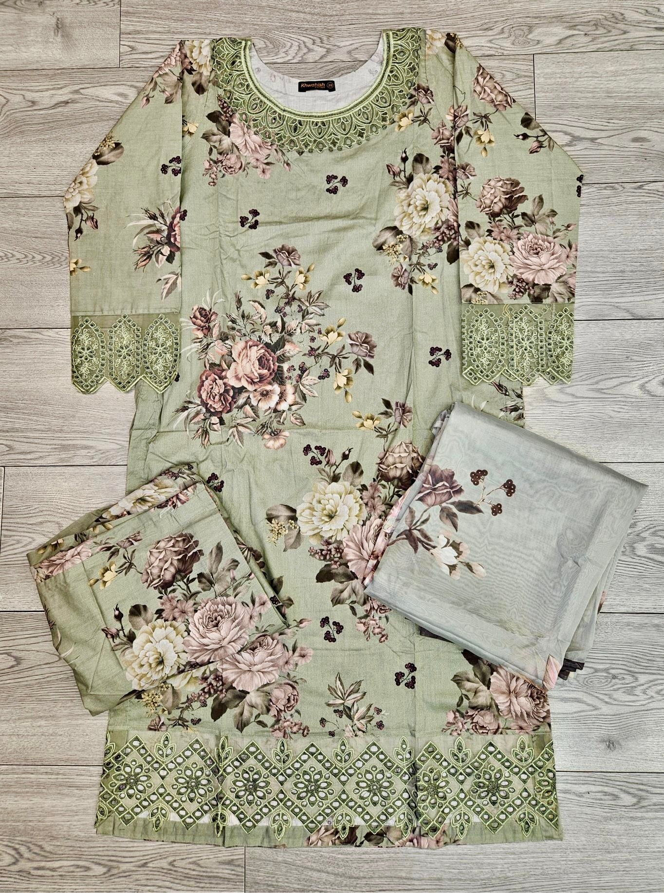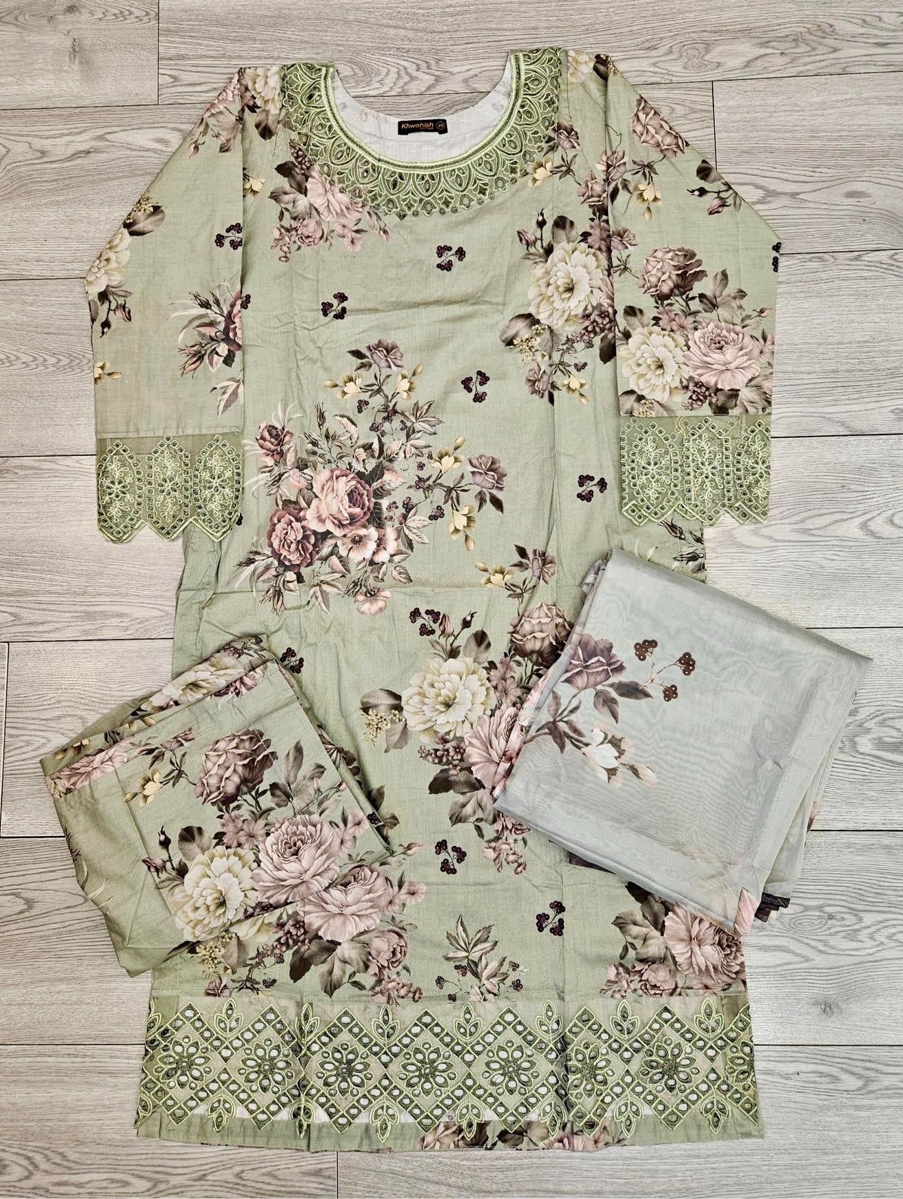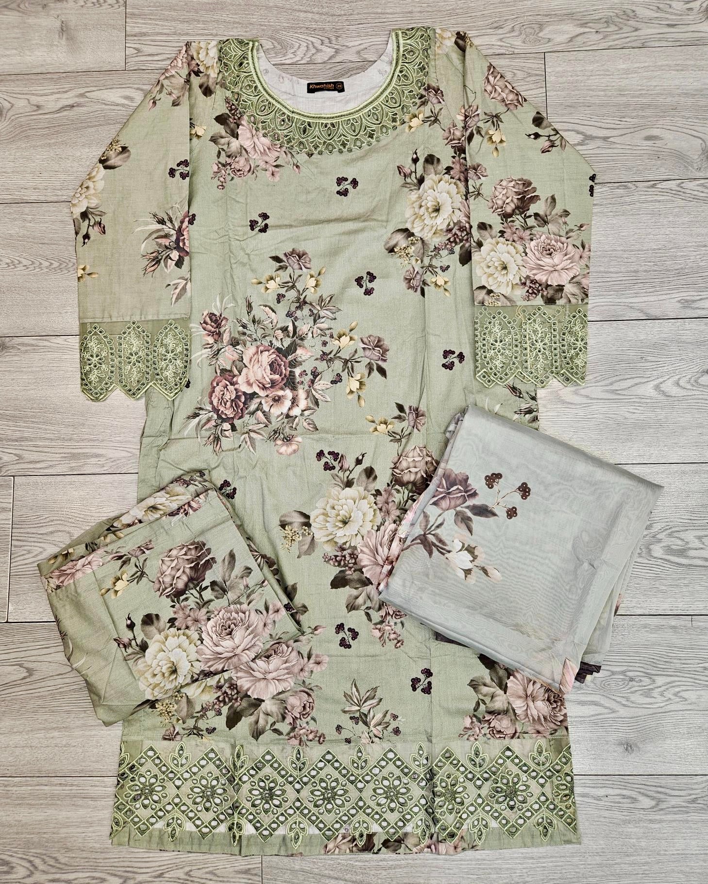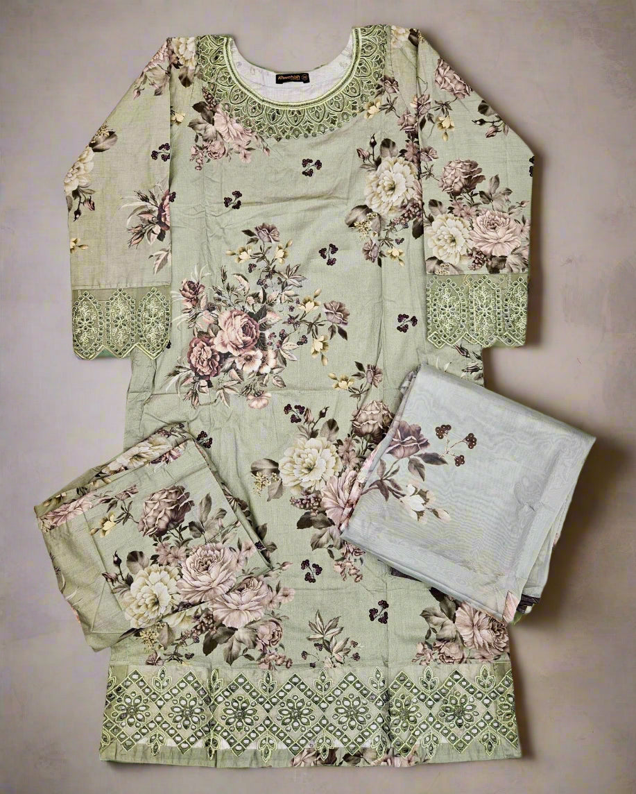 Sea Green & Mint Linen Viscose Suit | Orange Pink Symmetrical Print | Chikan Embroidery | Sizes Up to 8XL
