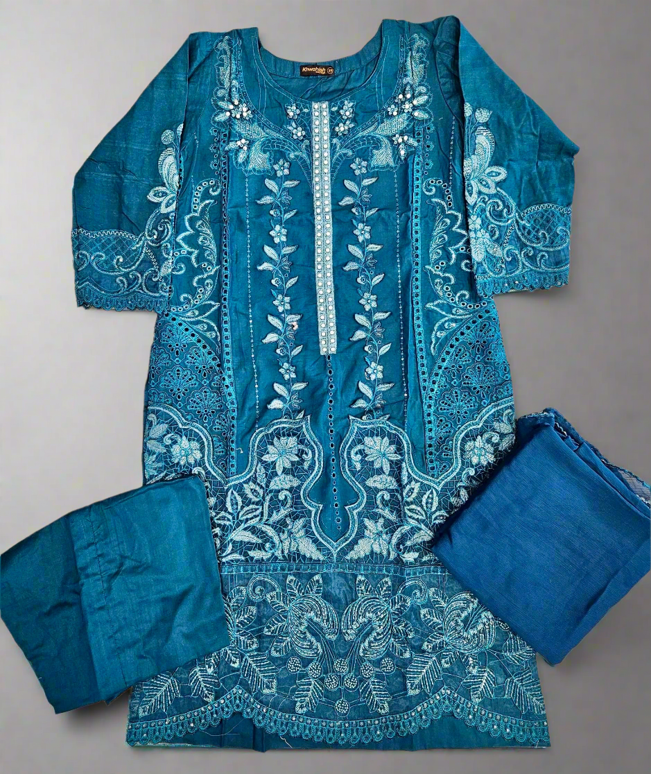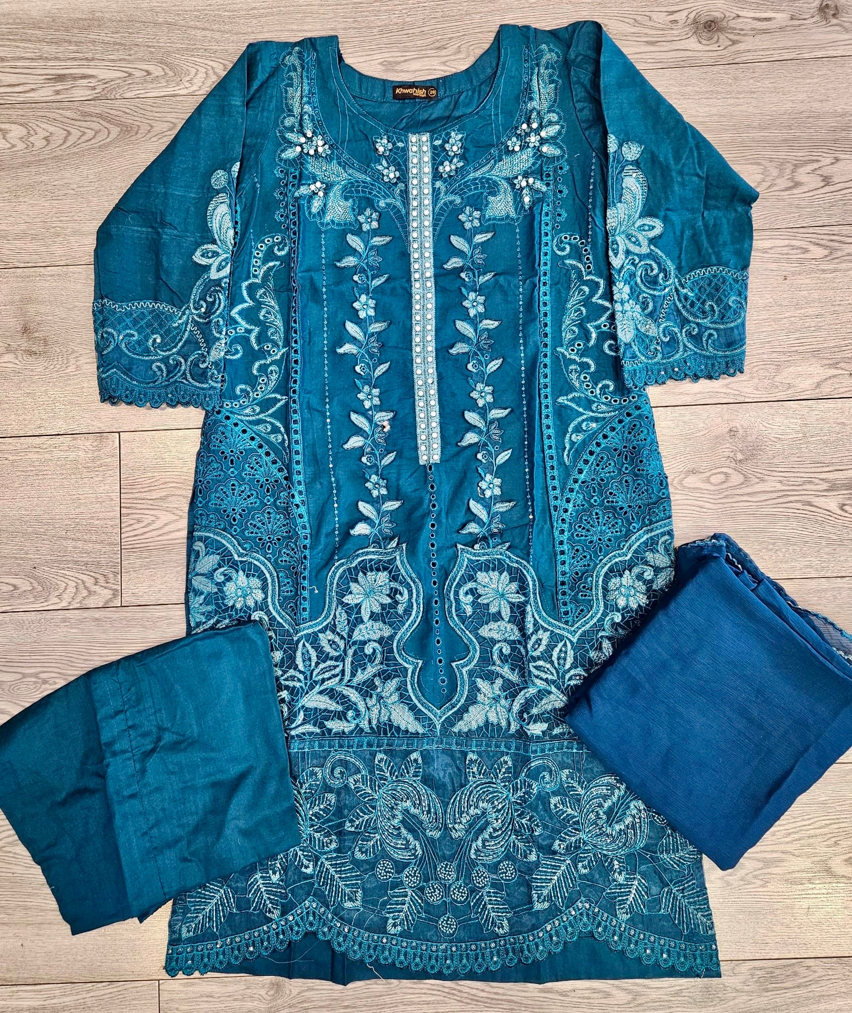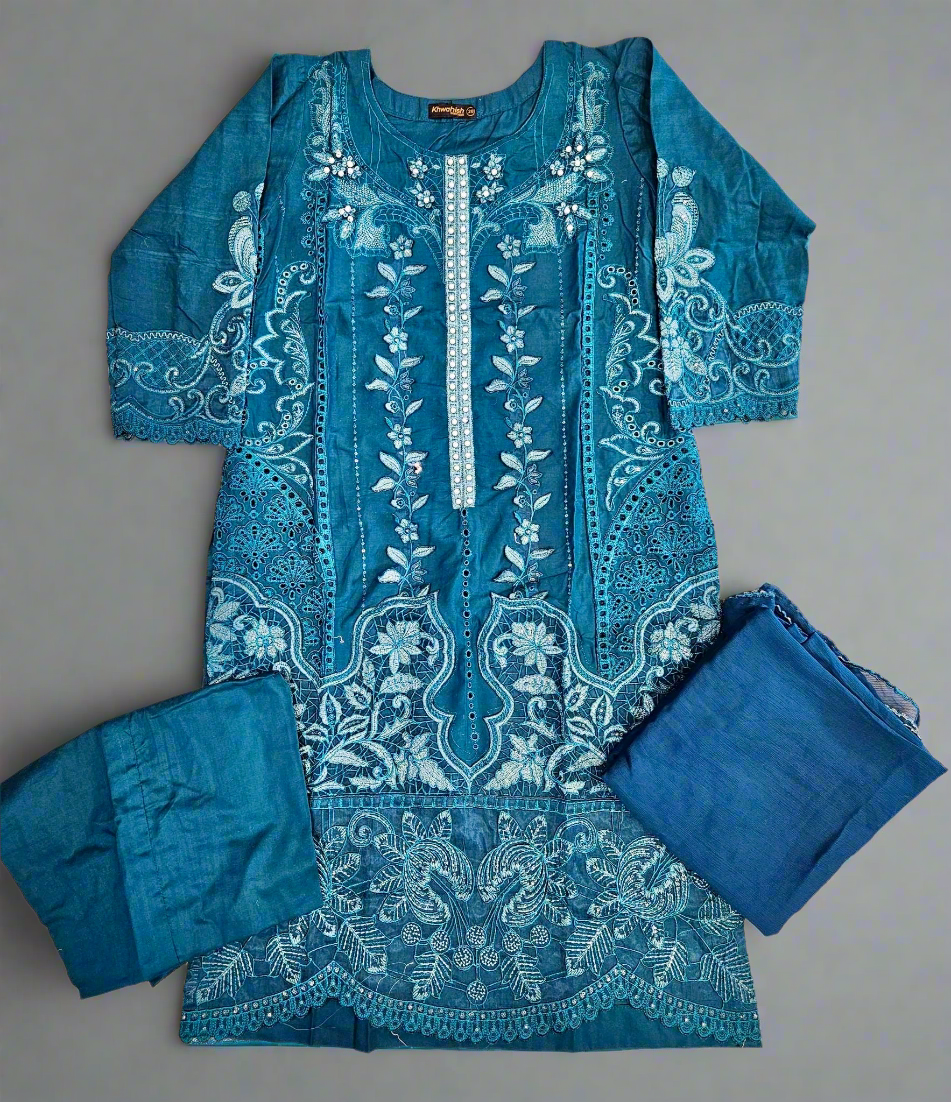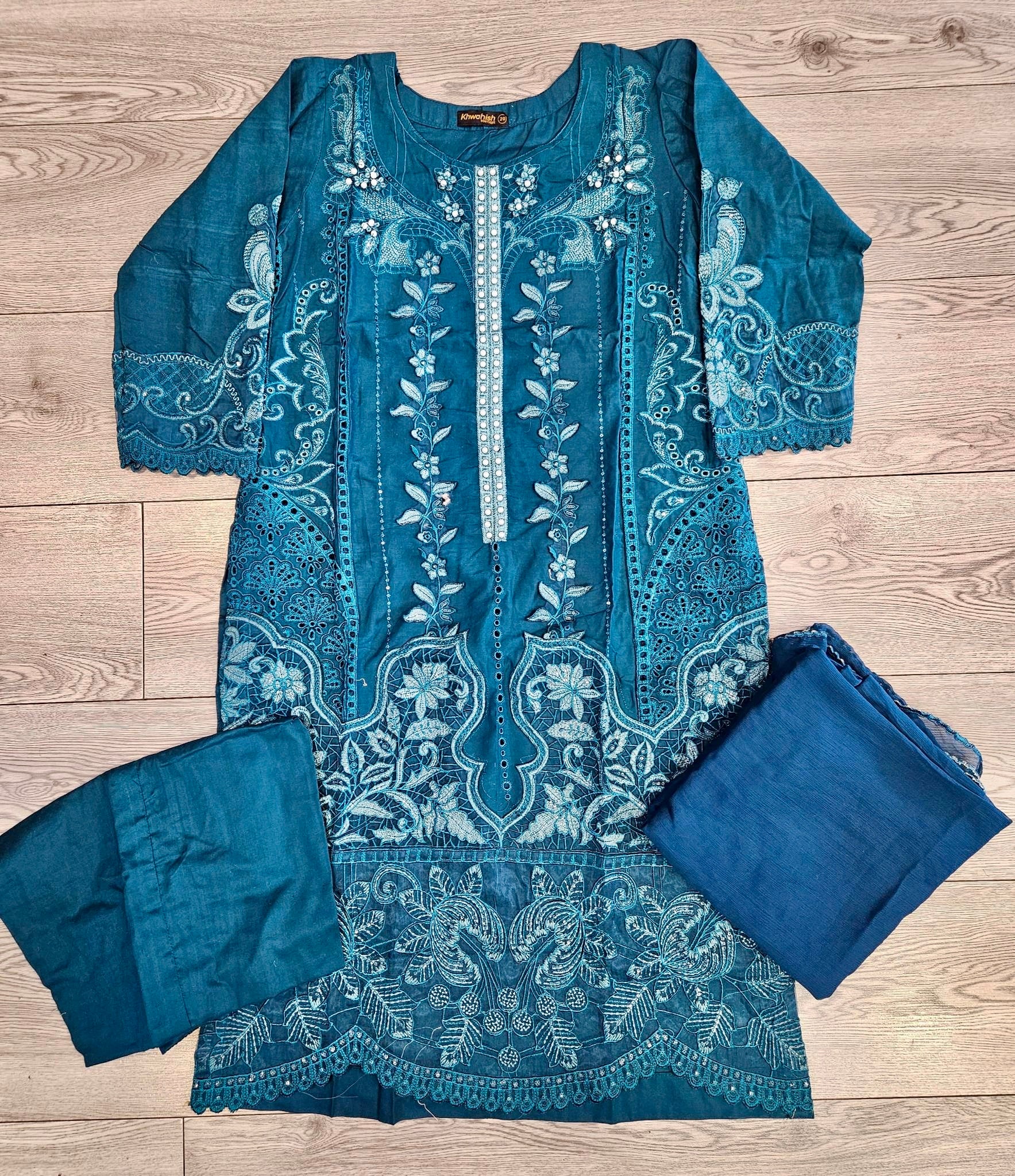MB teal blue and silver colour laser cutwork chikan embroidery