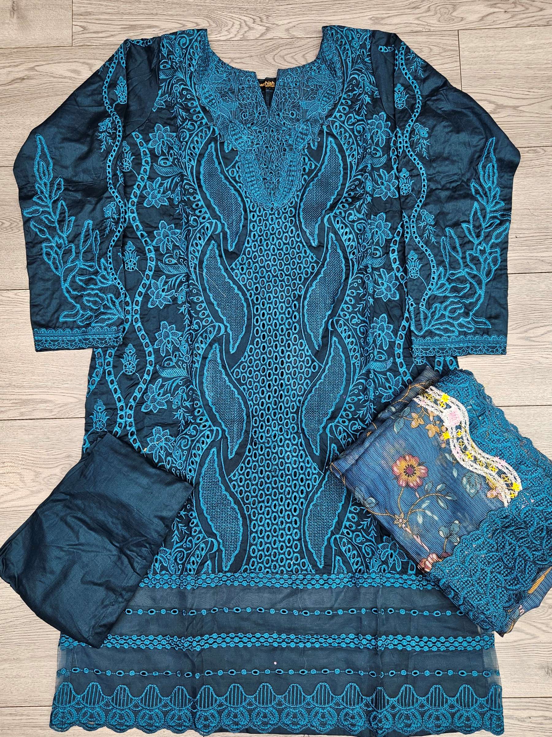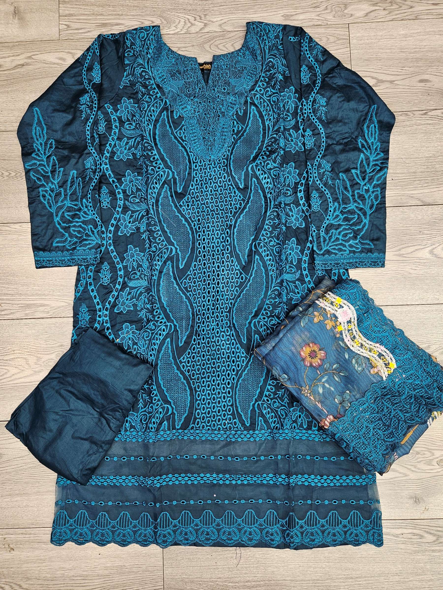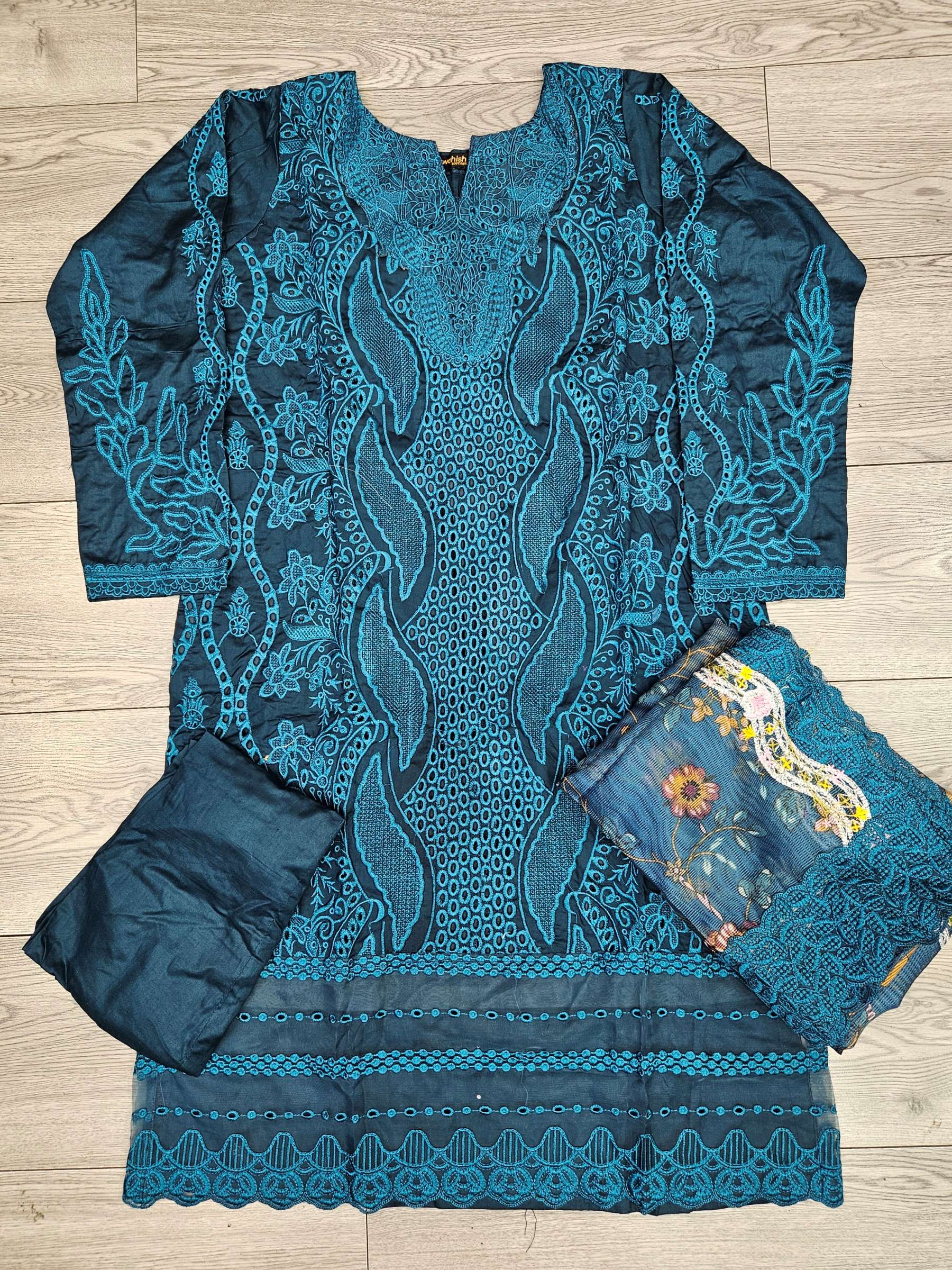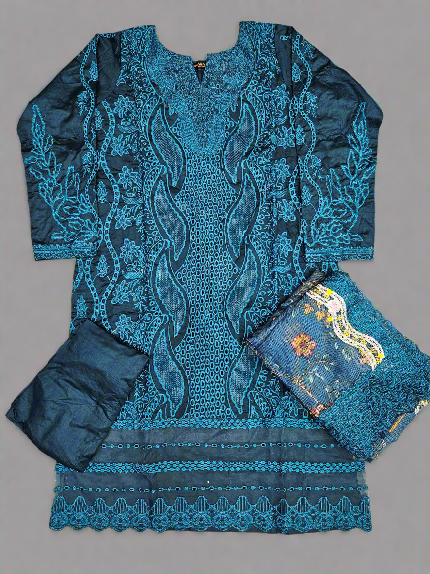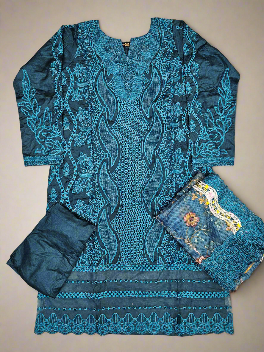 MB Teal Blue Laser-Cut Chikan Embroidery with Floral Dupatta