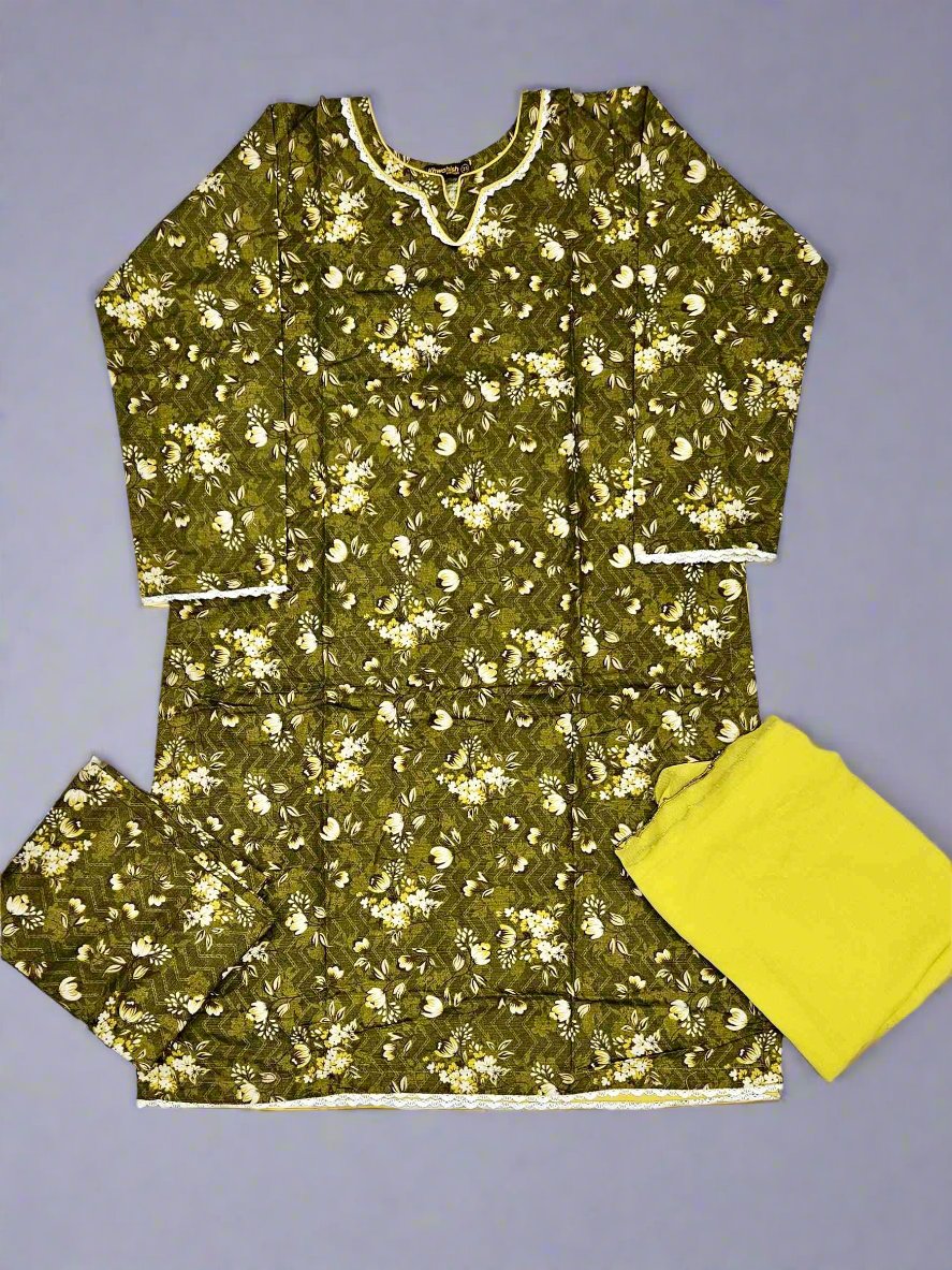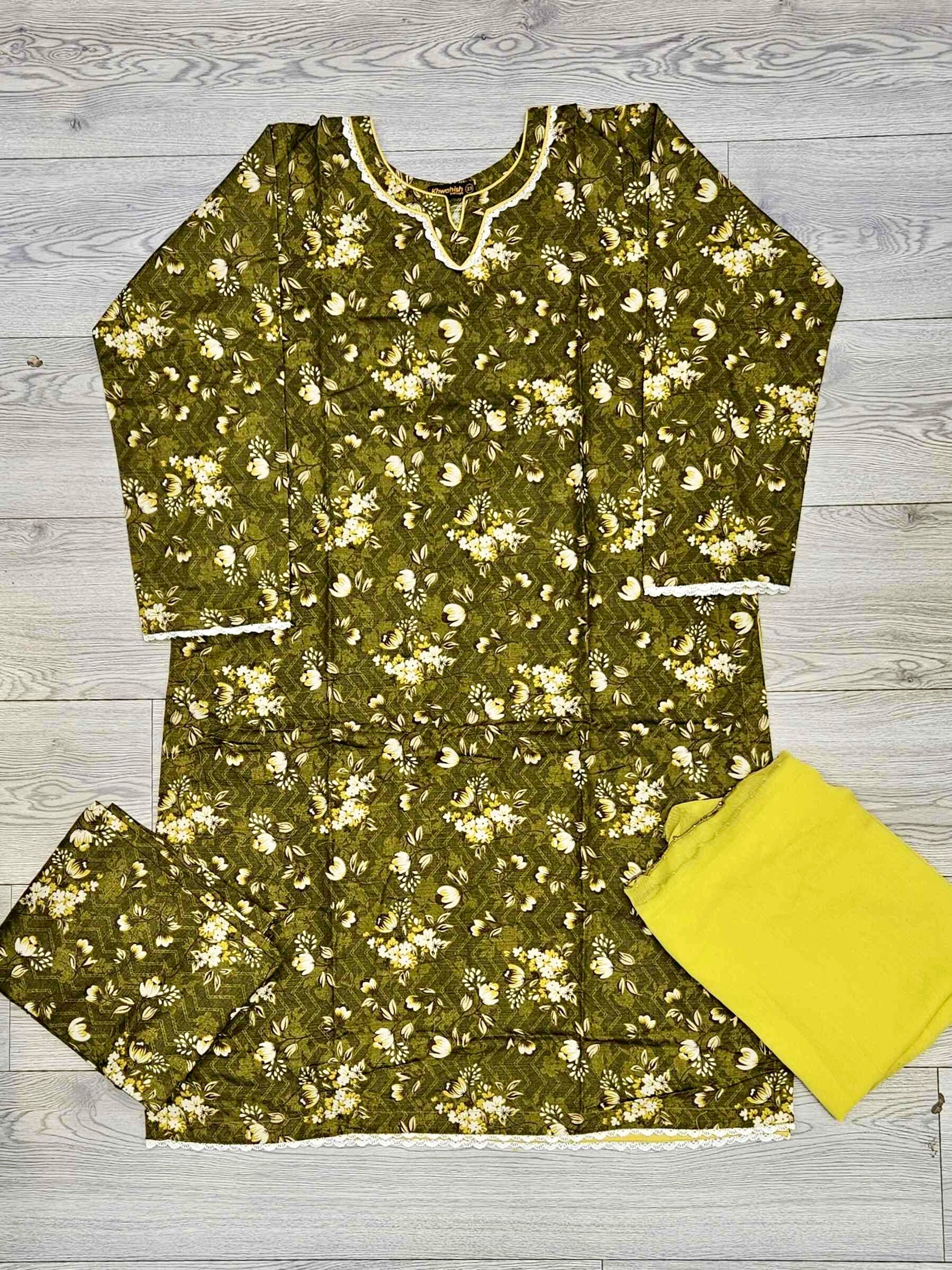 Sea Green & Mint Linen Viscose Suit | Orange Pink Symmetrical Print | Chikan Embroidery | Sizes Up to 8XL