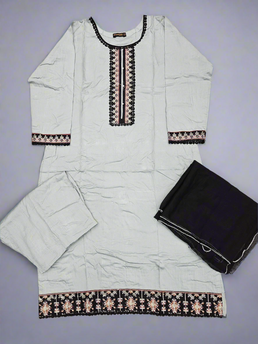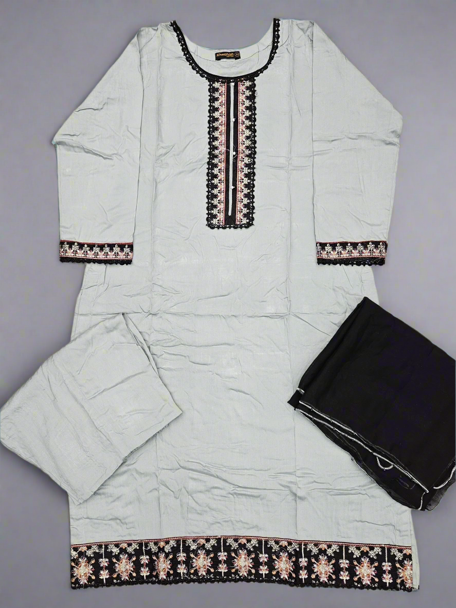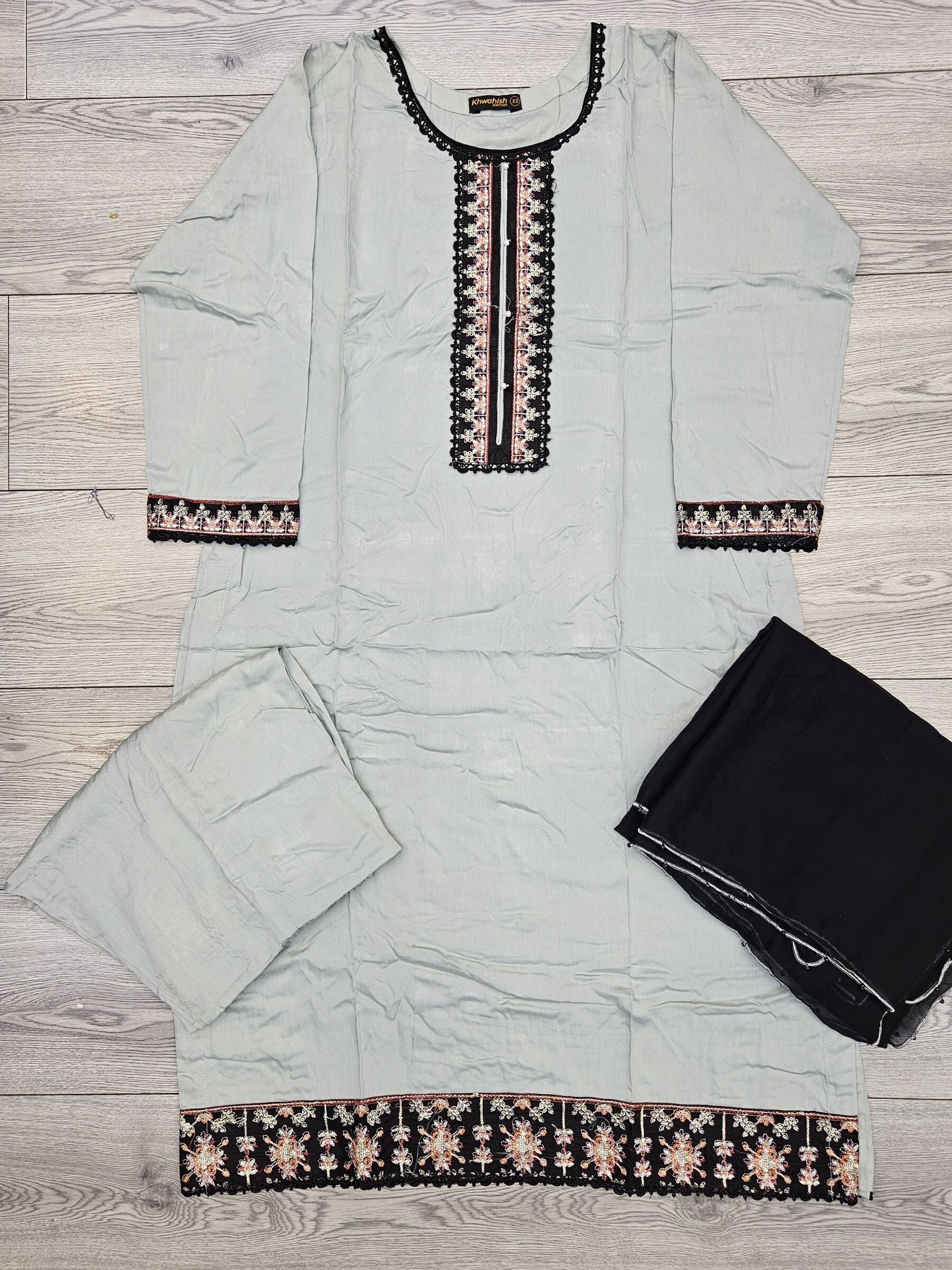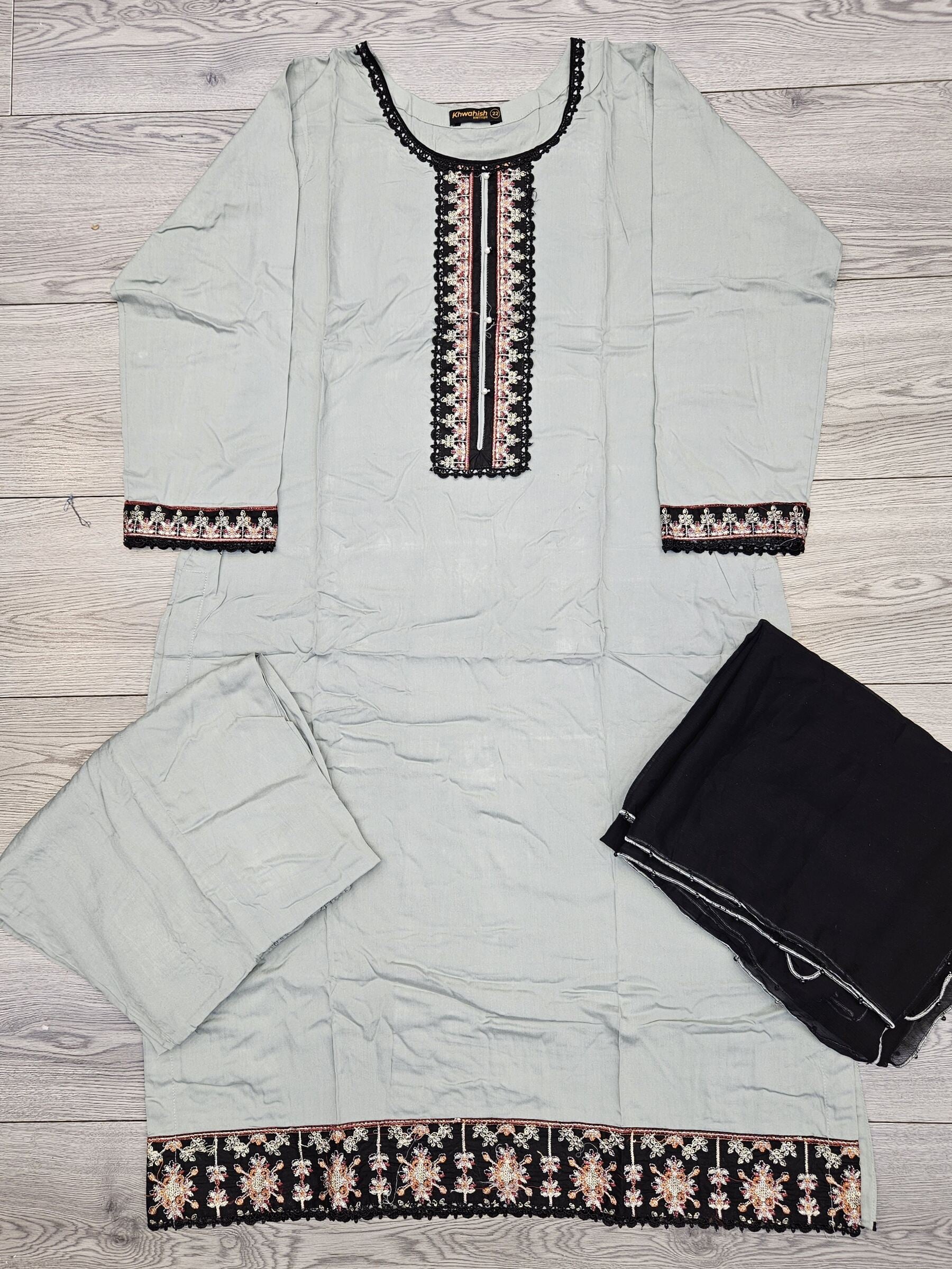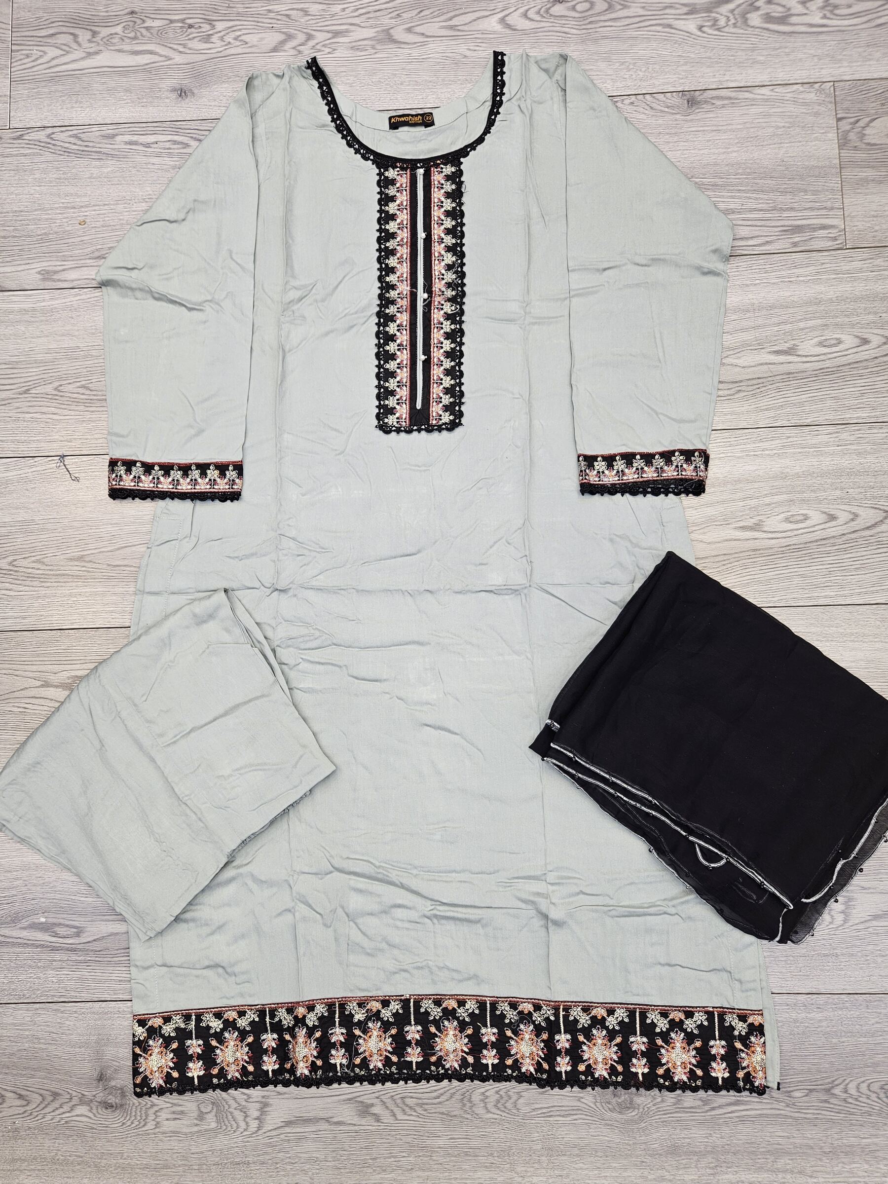 Pigeon blue colour linen fabric shalwar kameez with embroidery on neck