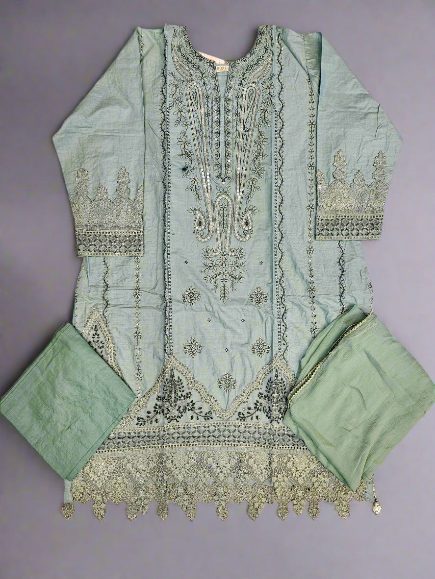 Sea Green & Mint Linen Viscose Suit | Orange Pink Symmetrical Print | Chikan Embroidery | Sizes Up to 8XL