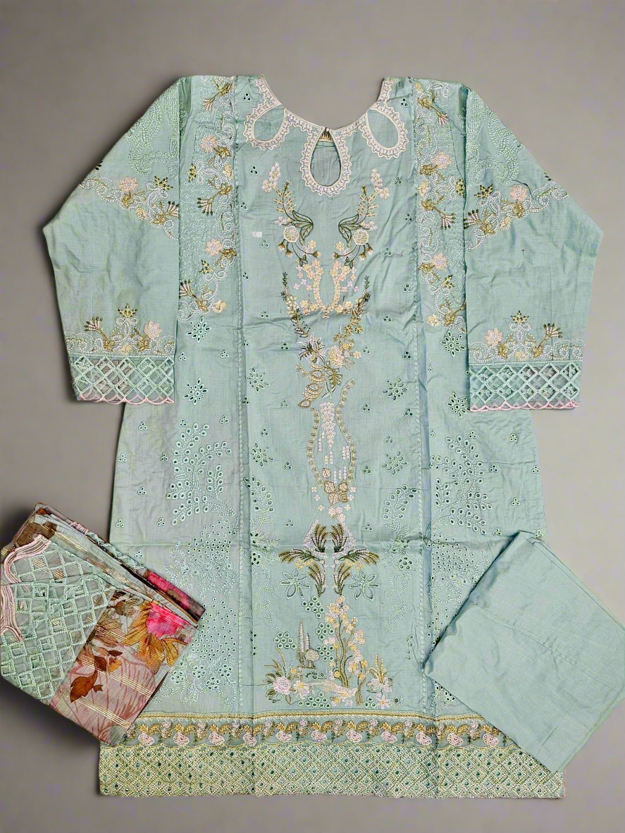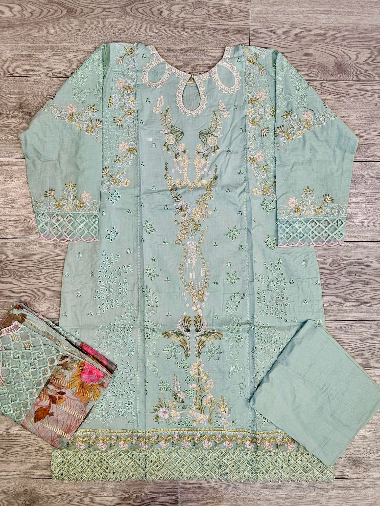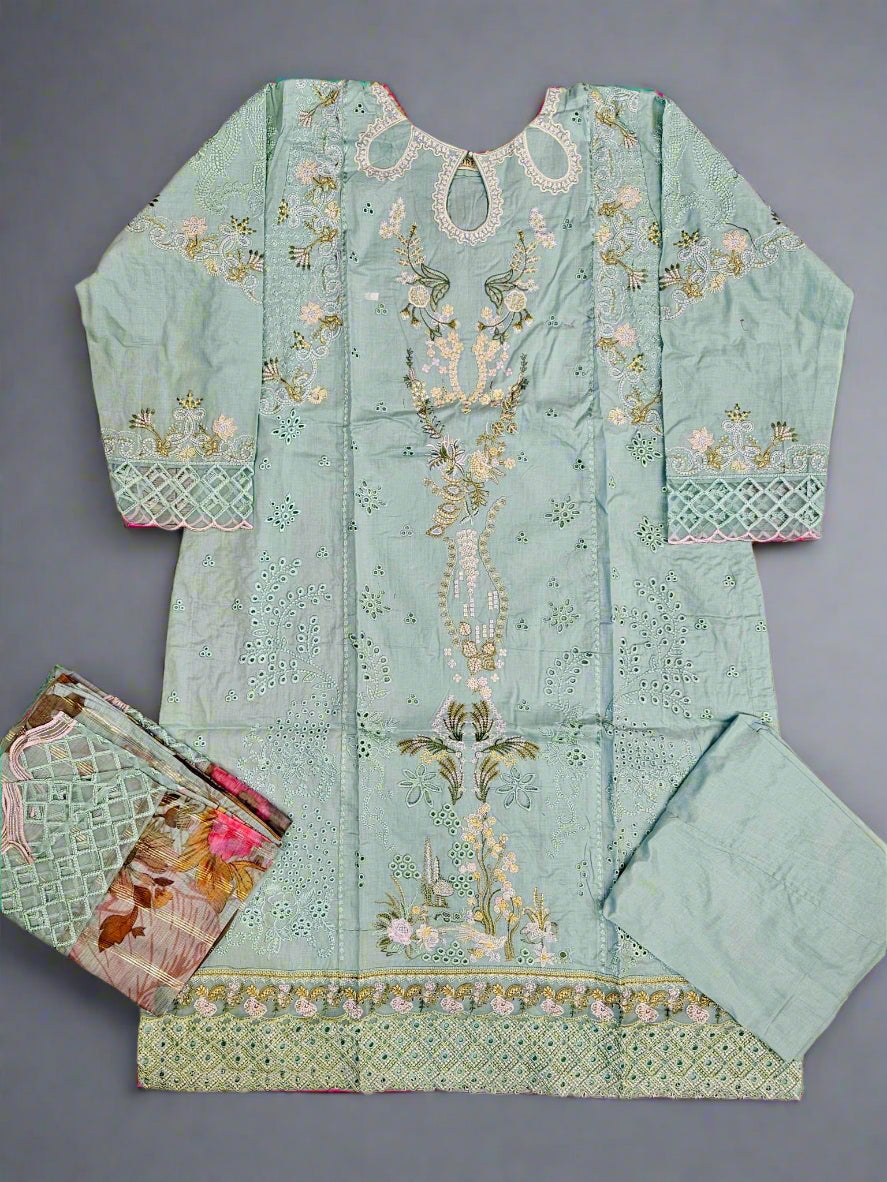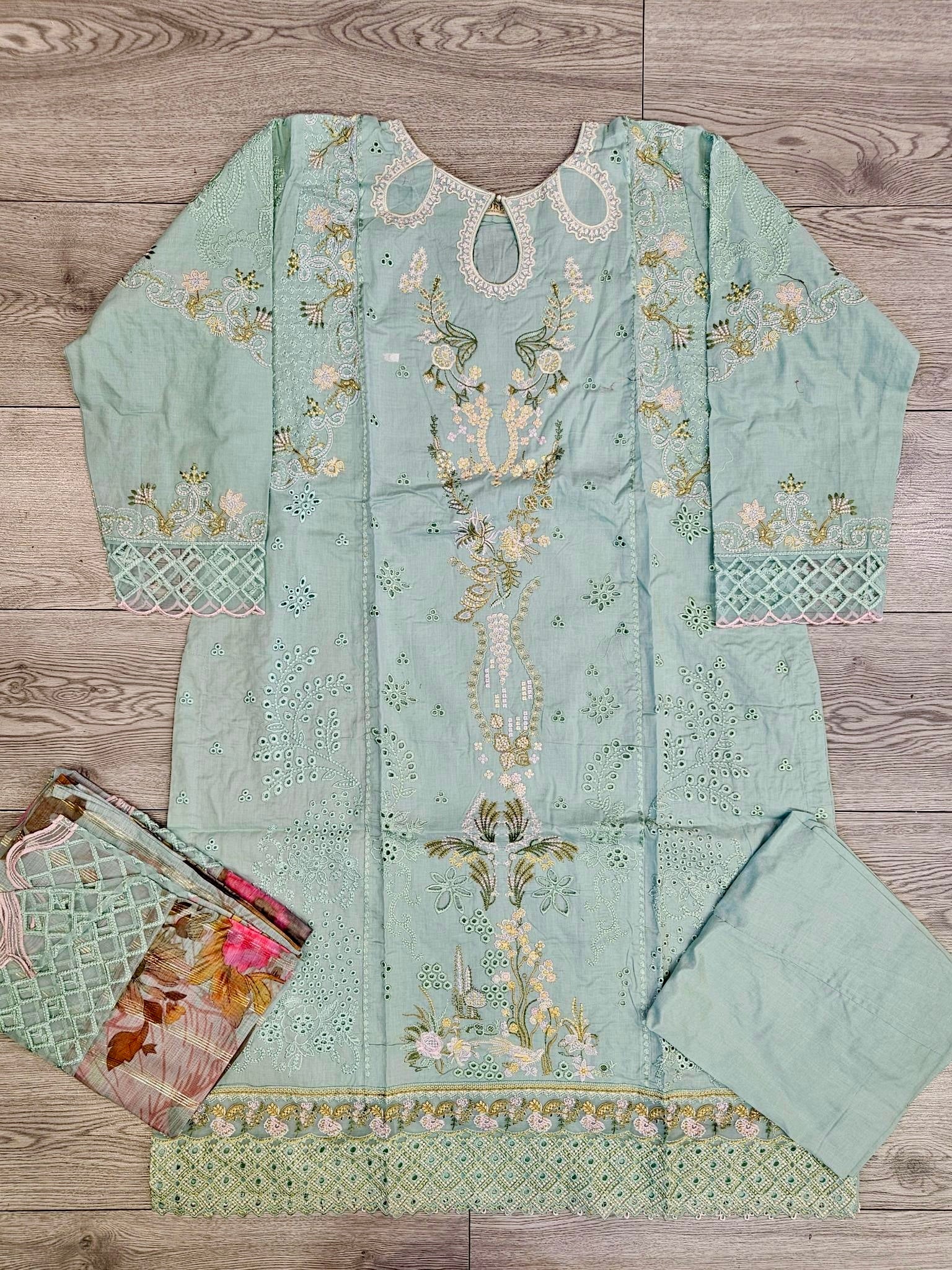 Sea Green & Mint Linen Viscose Suit | Orange Pink Symmetrical Print | Chikan Embroidery | Sizes Up to 8XL