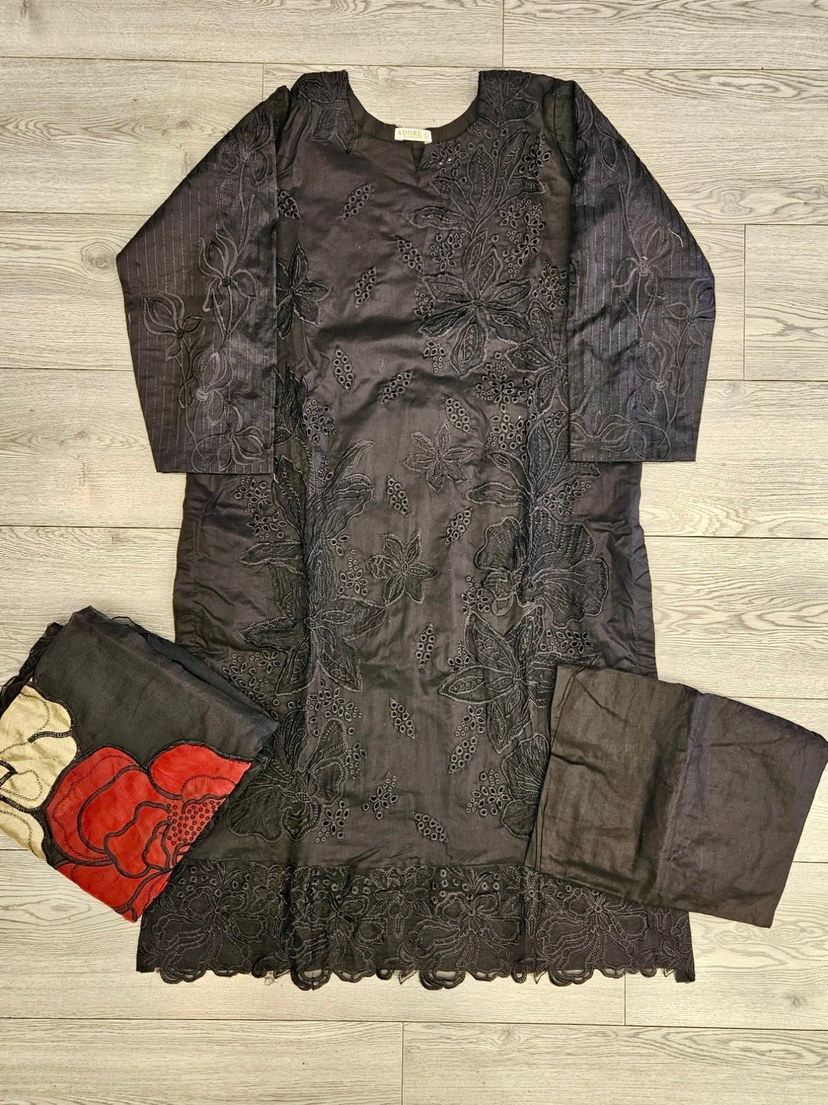 Navy Blue Stone Work Kameez | Silk Sharara & Chiffon Dupatta | 4-Side Embroidered | Sizes Up to 8XL