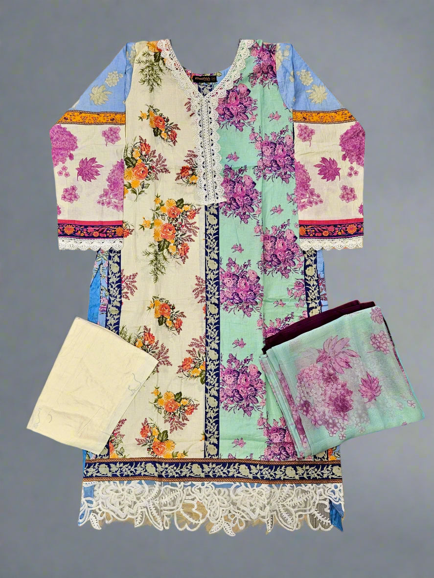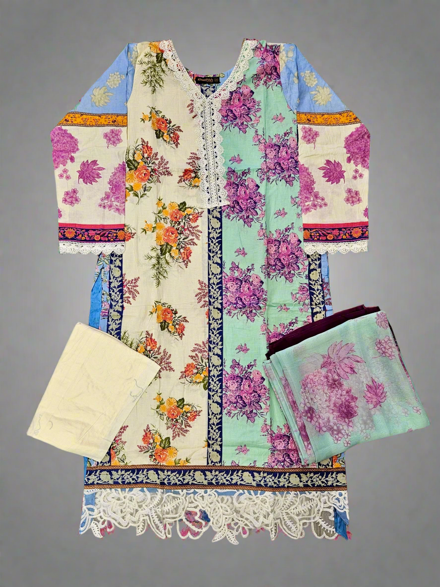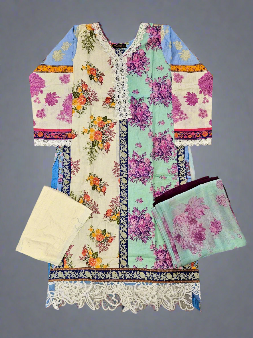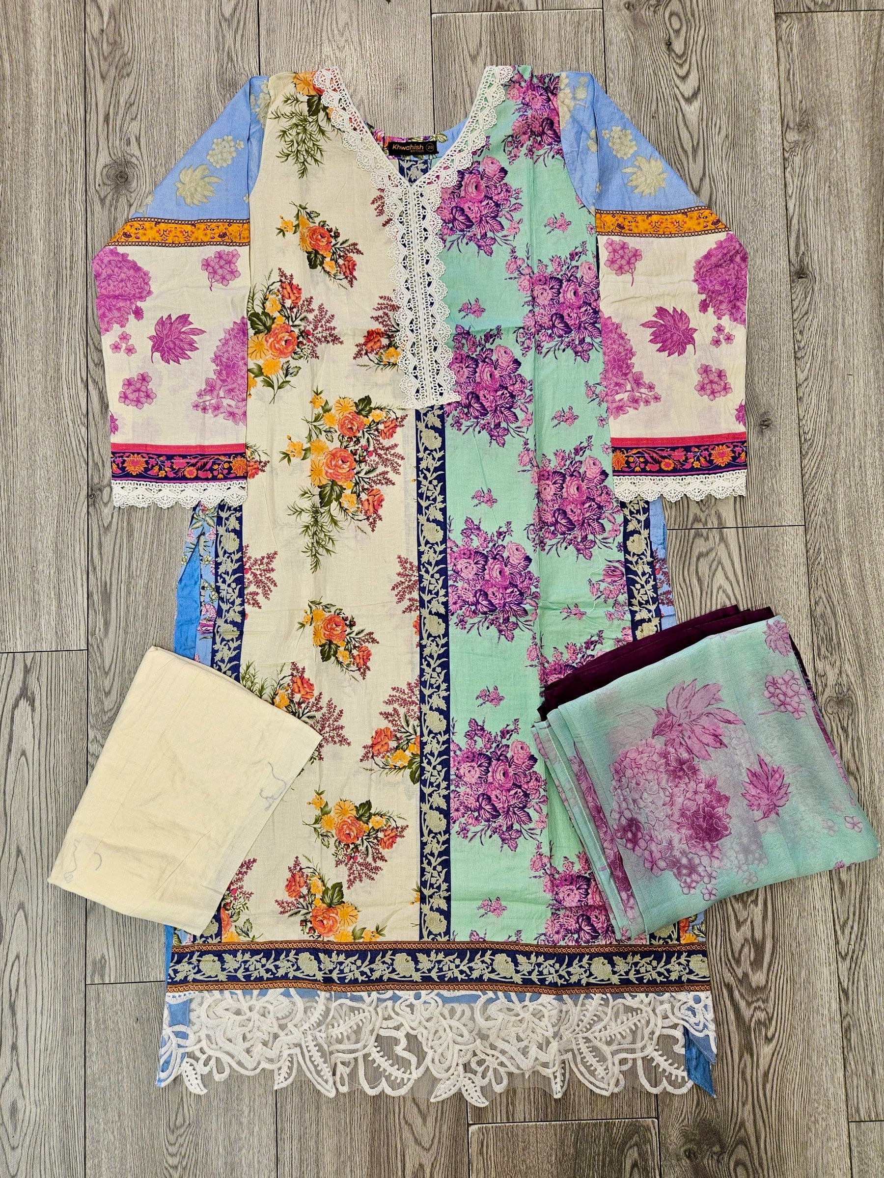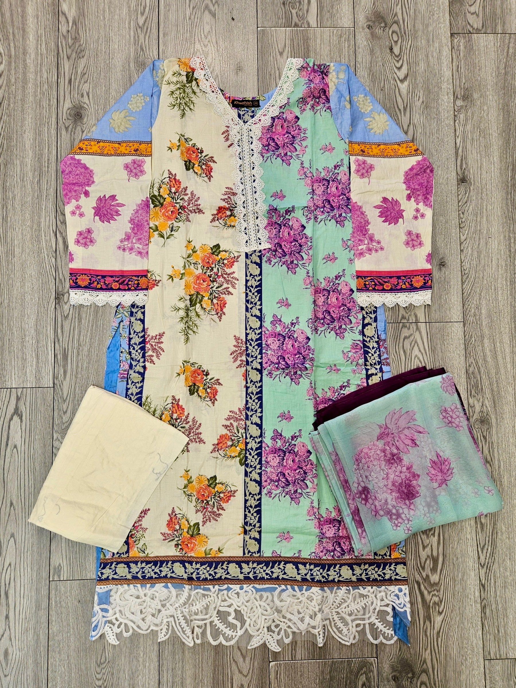 SS cream white and seafoam green colour floral print cotton shalwar kameez