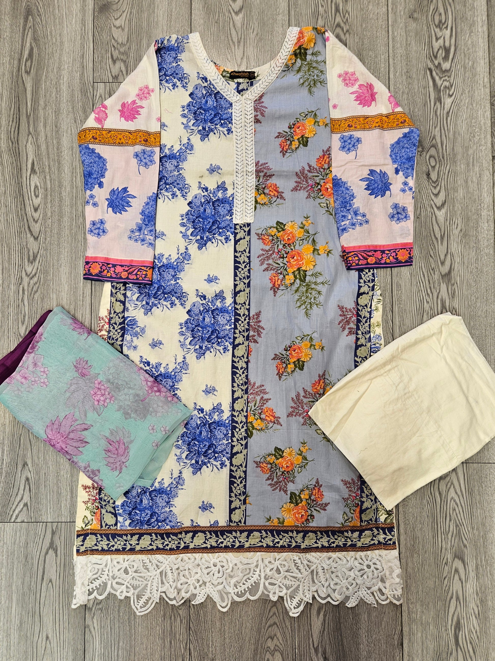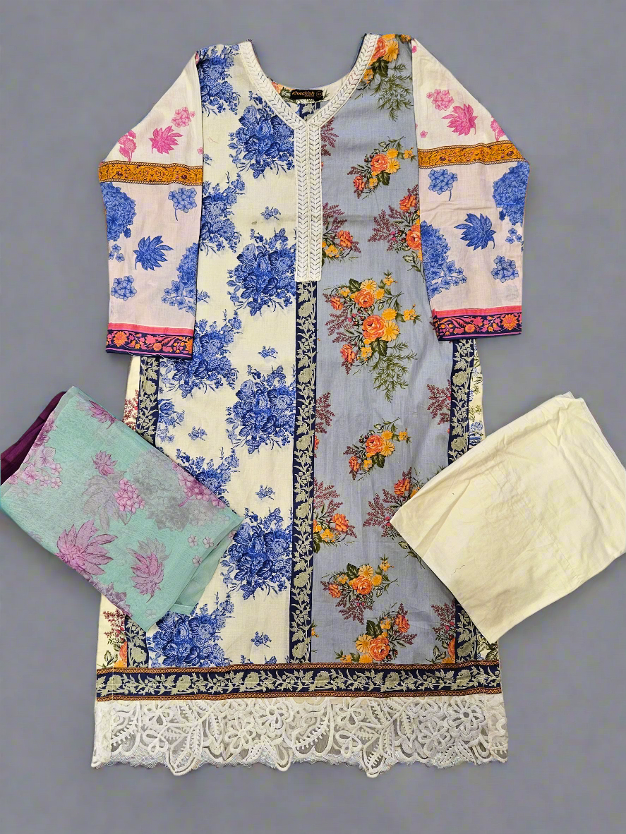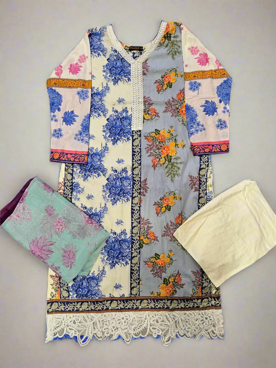 Sea Green & Mint Linen Viscose Suit | Orange Pink Symmetrical Print | Chikan Embroidery | Sizes Up to 8XL