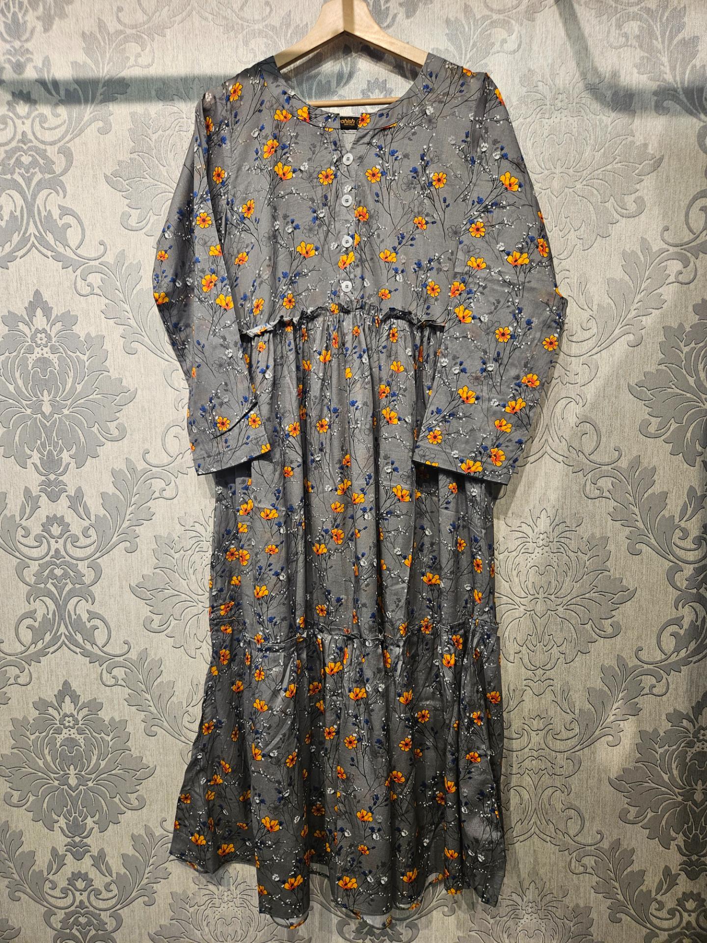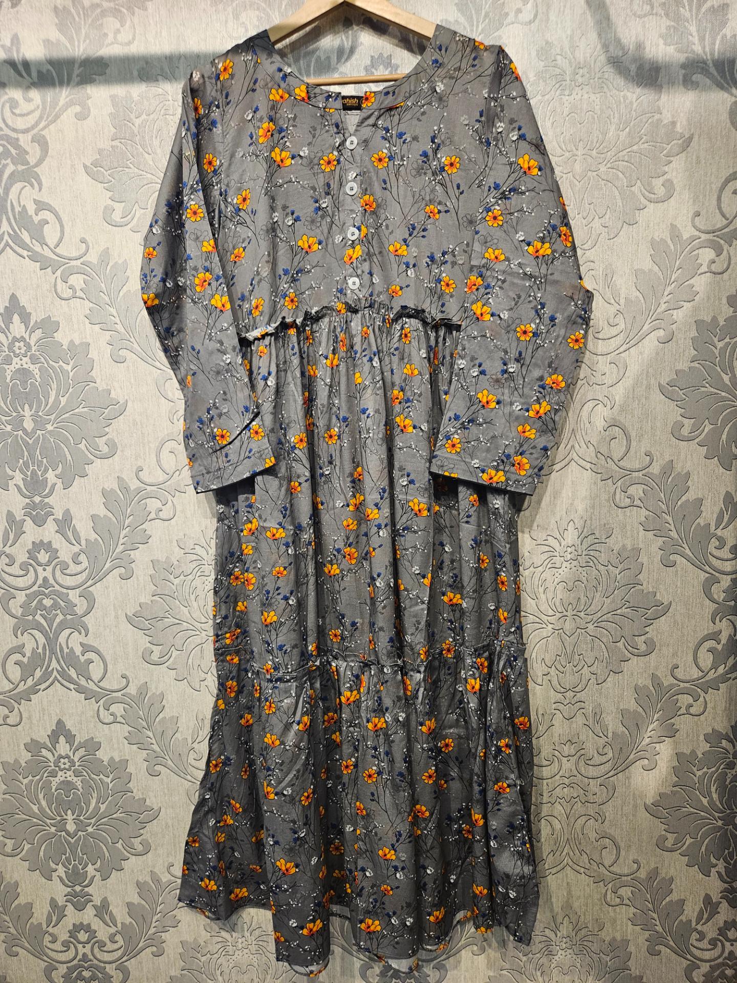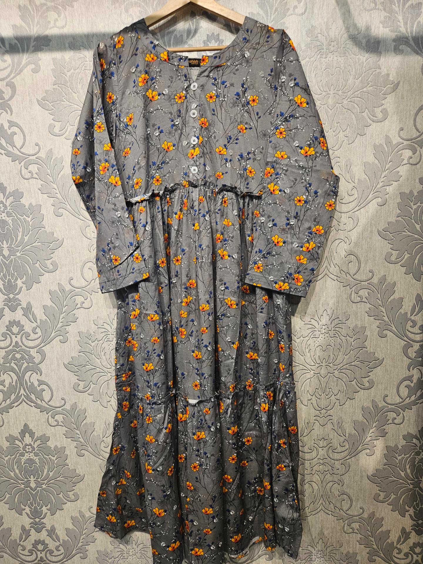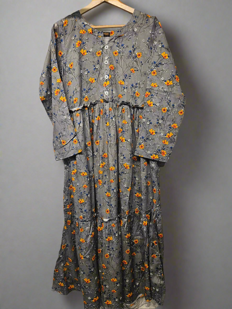 Women's Casual Cotton Dress - Grey Blue Orange Floral Print Summer Holiday Vacation Dress