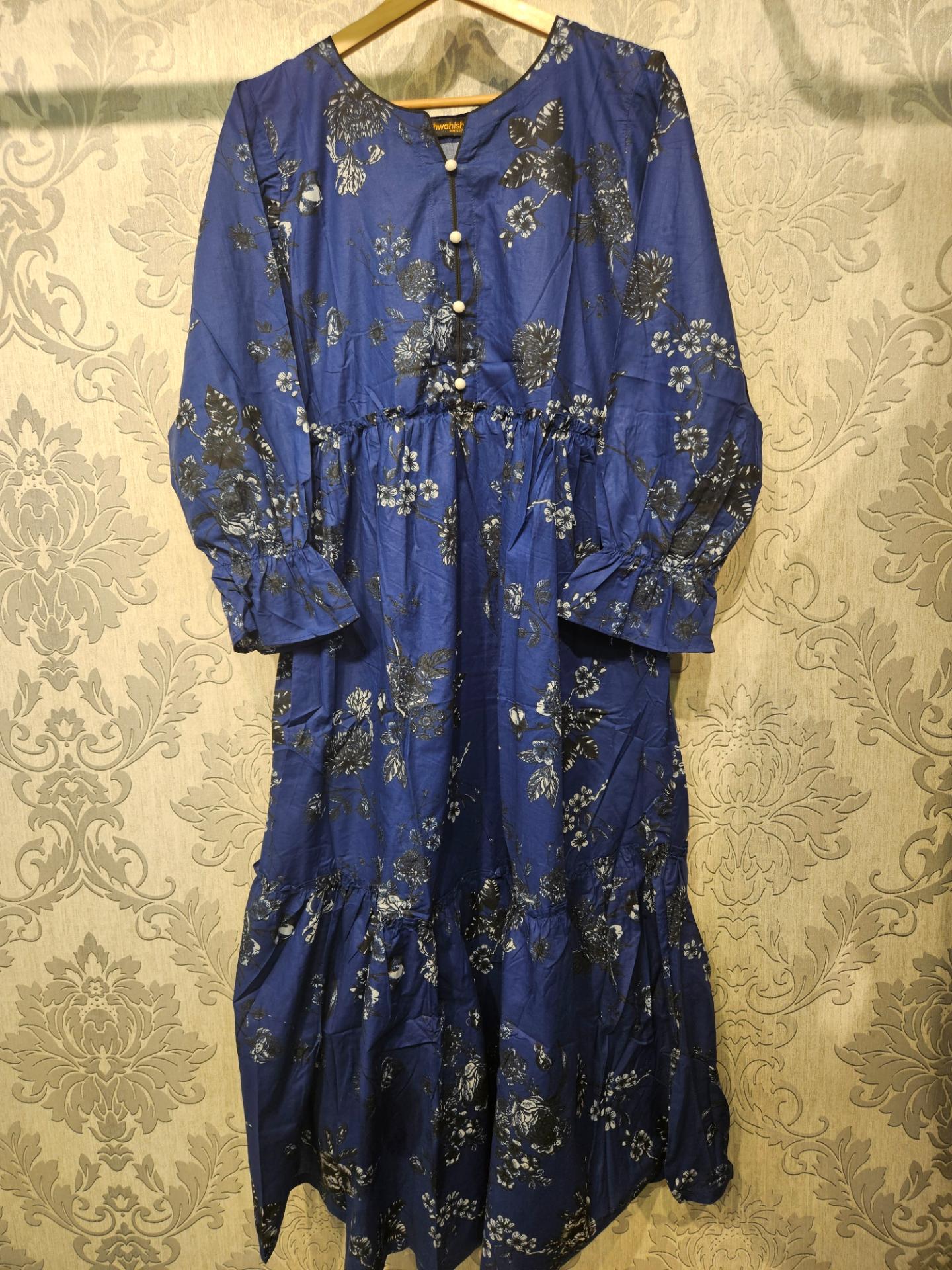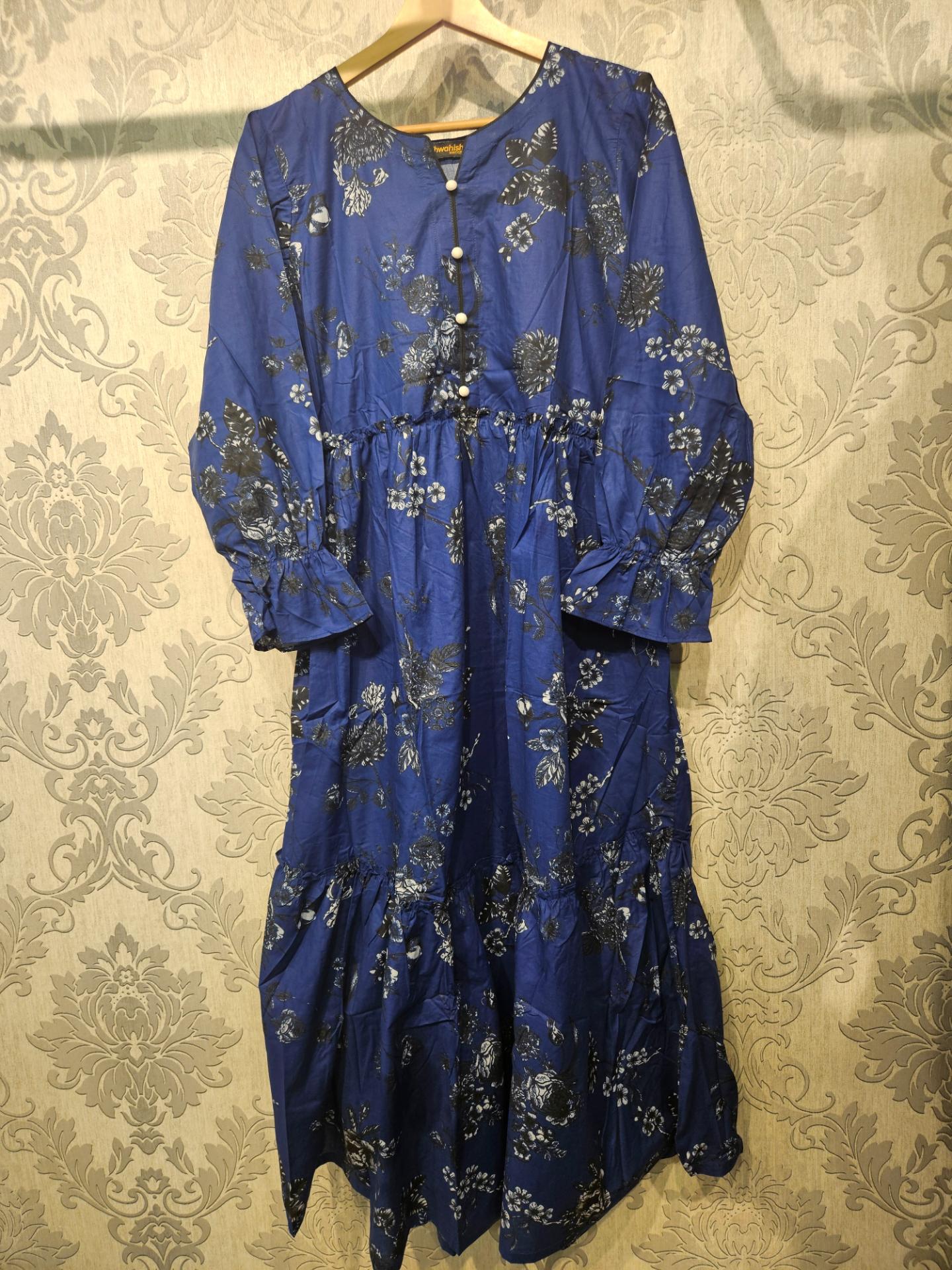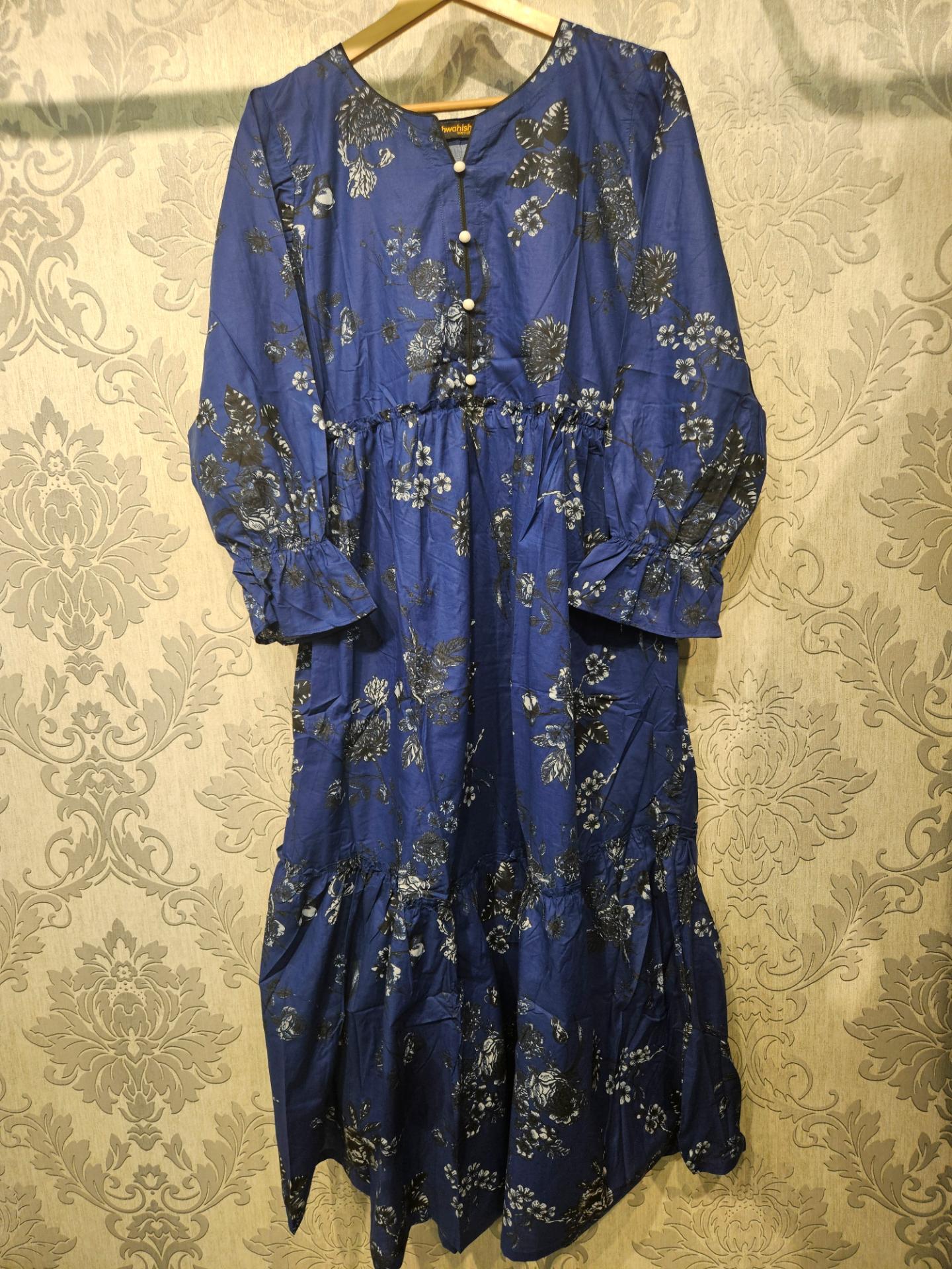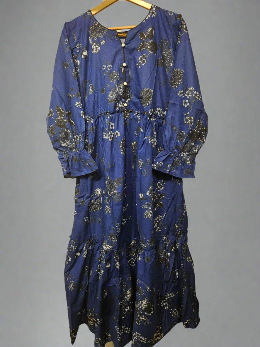 Women's Casual Cotton Dress - Navy Blue and Grey Floral Print Summer Holiday Vacation Dress