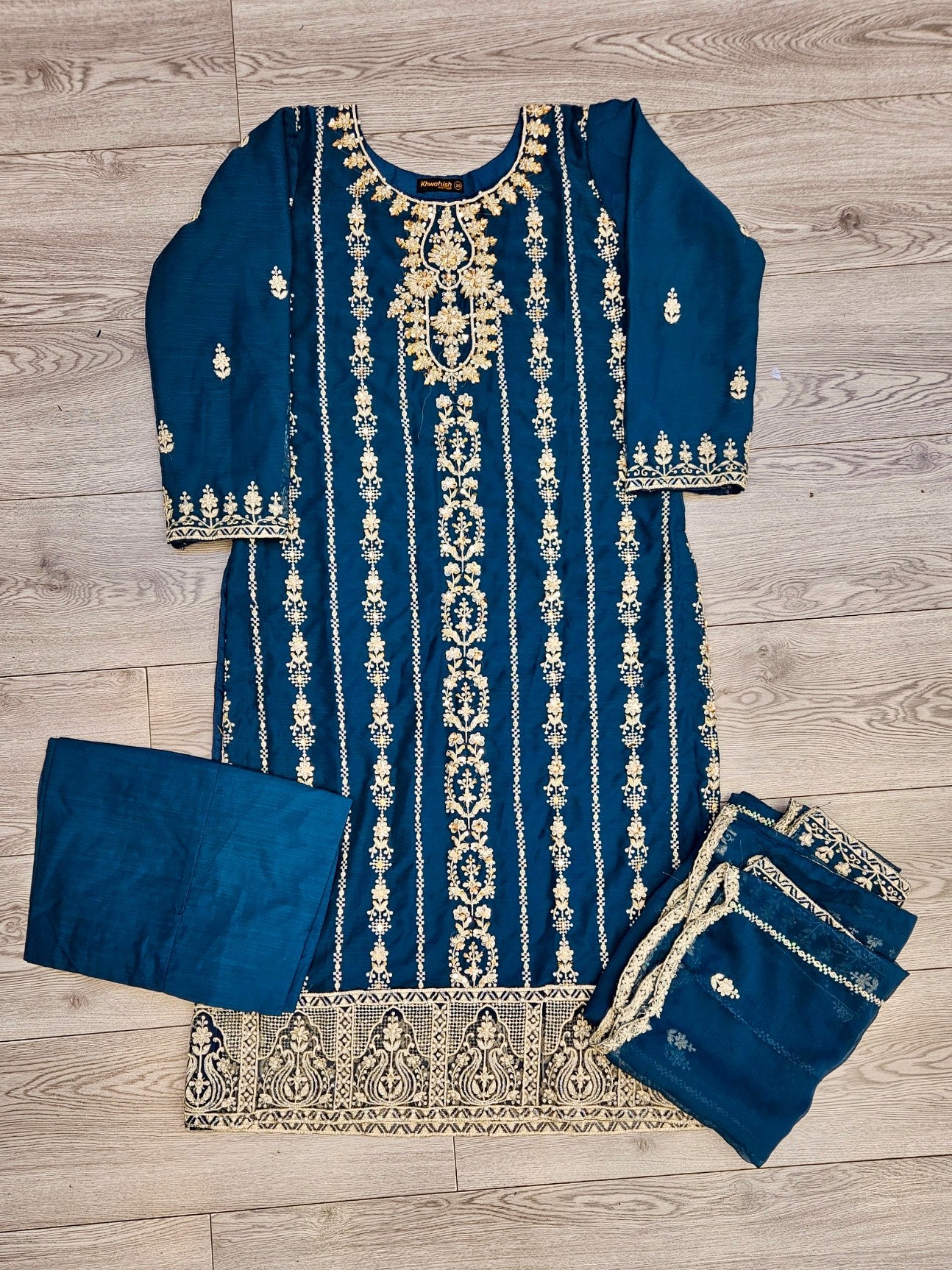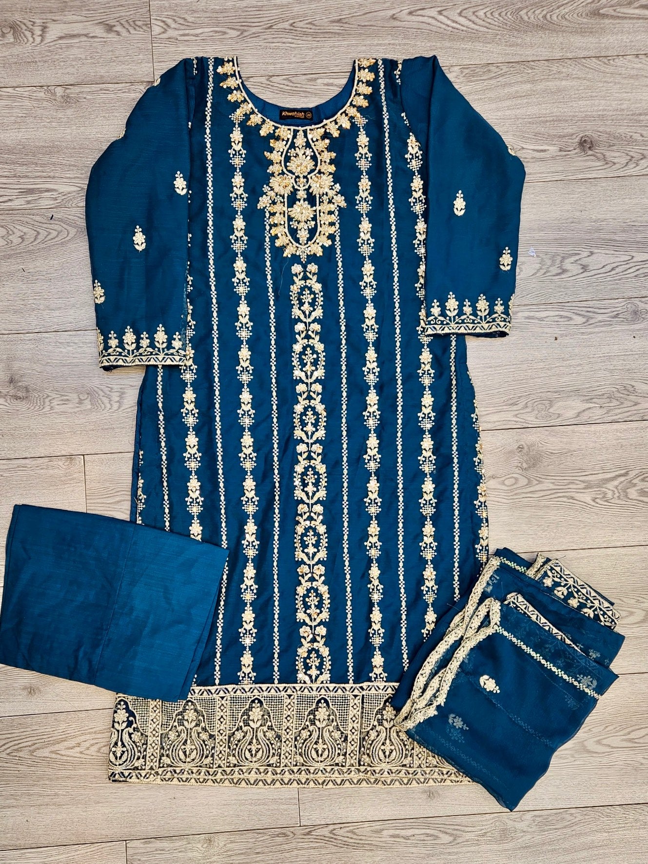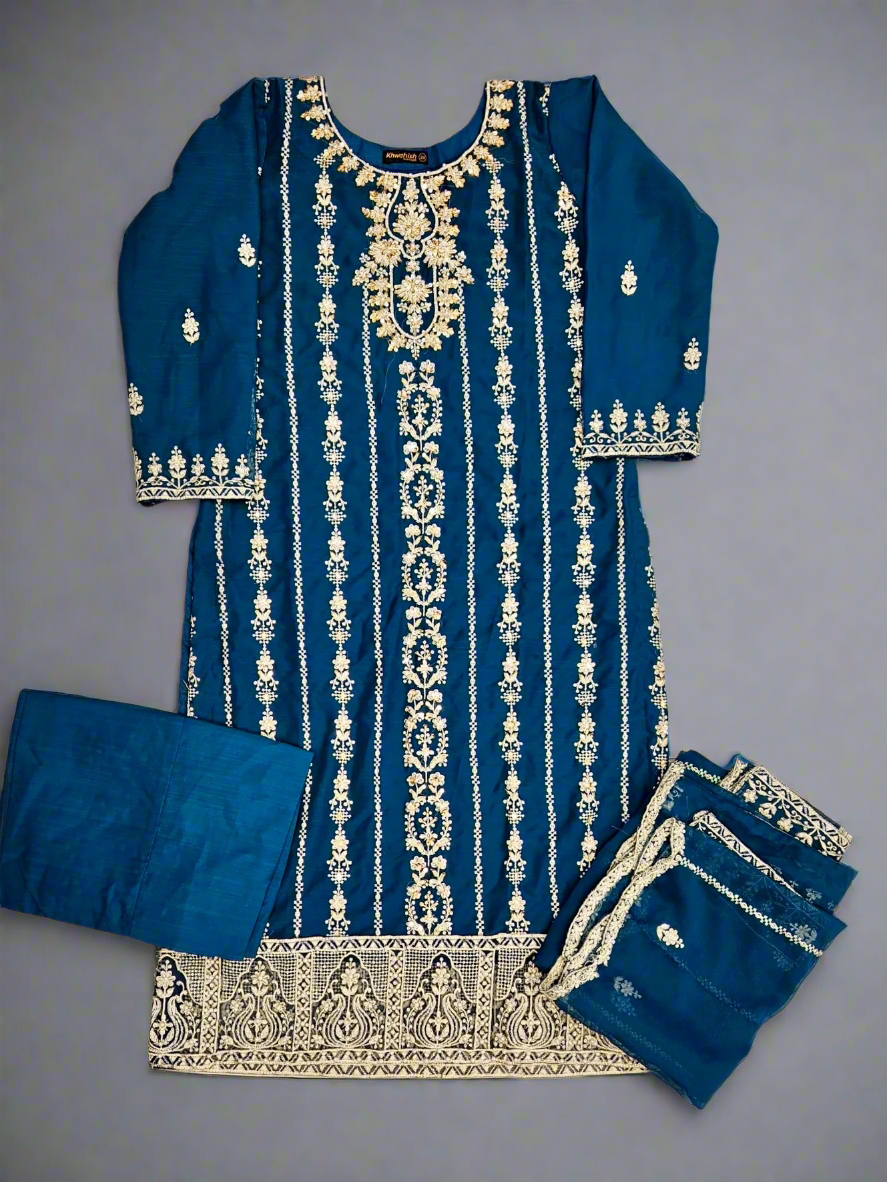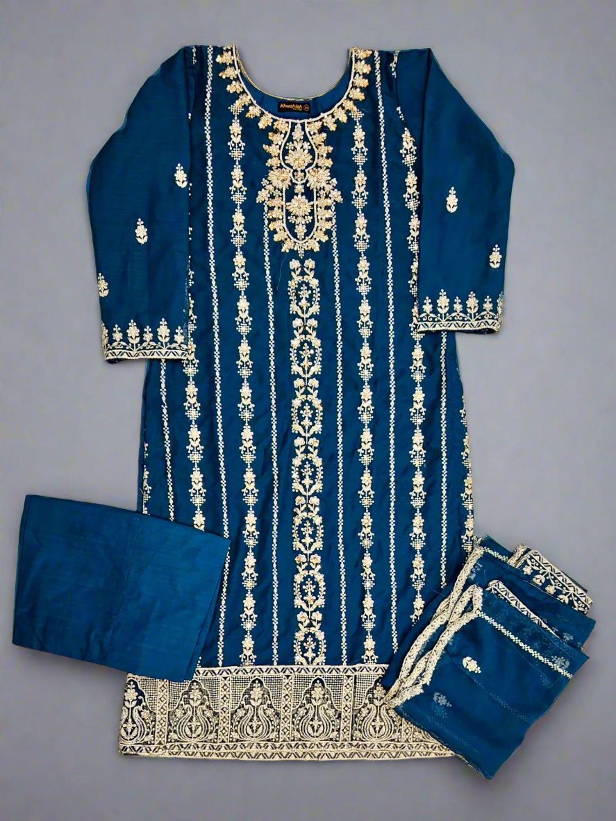 Navy Blue Stone Work Kameez | Silk Sharara & Chiffon Dupatta | 4-Side Embroidered | Sizes Up to 8XL