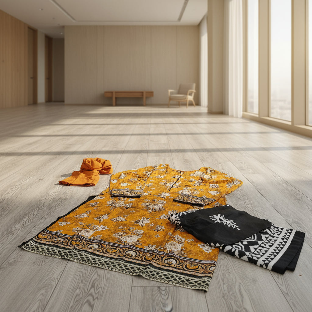Deep Mustard & Brown Floral Linen Viscose Suit | Chikan Embroidery | Sizes Up to 8XL