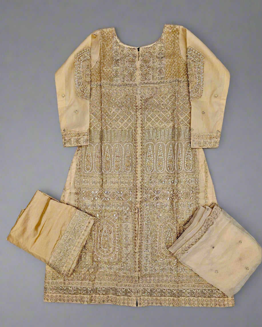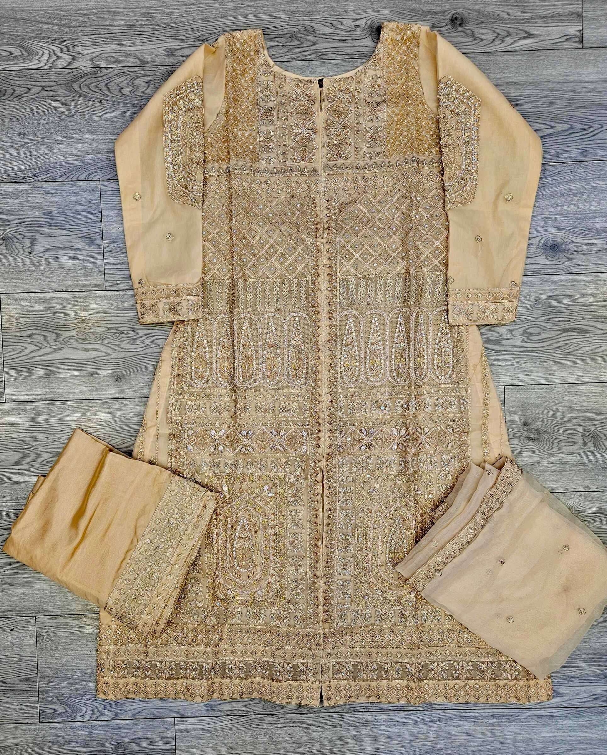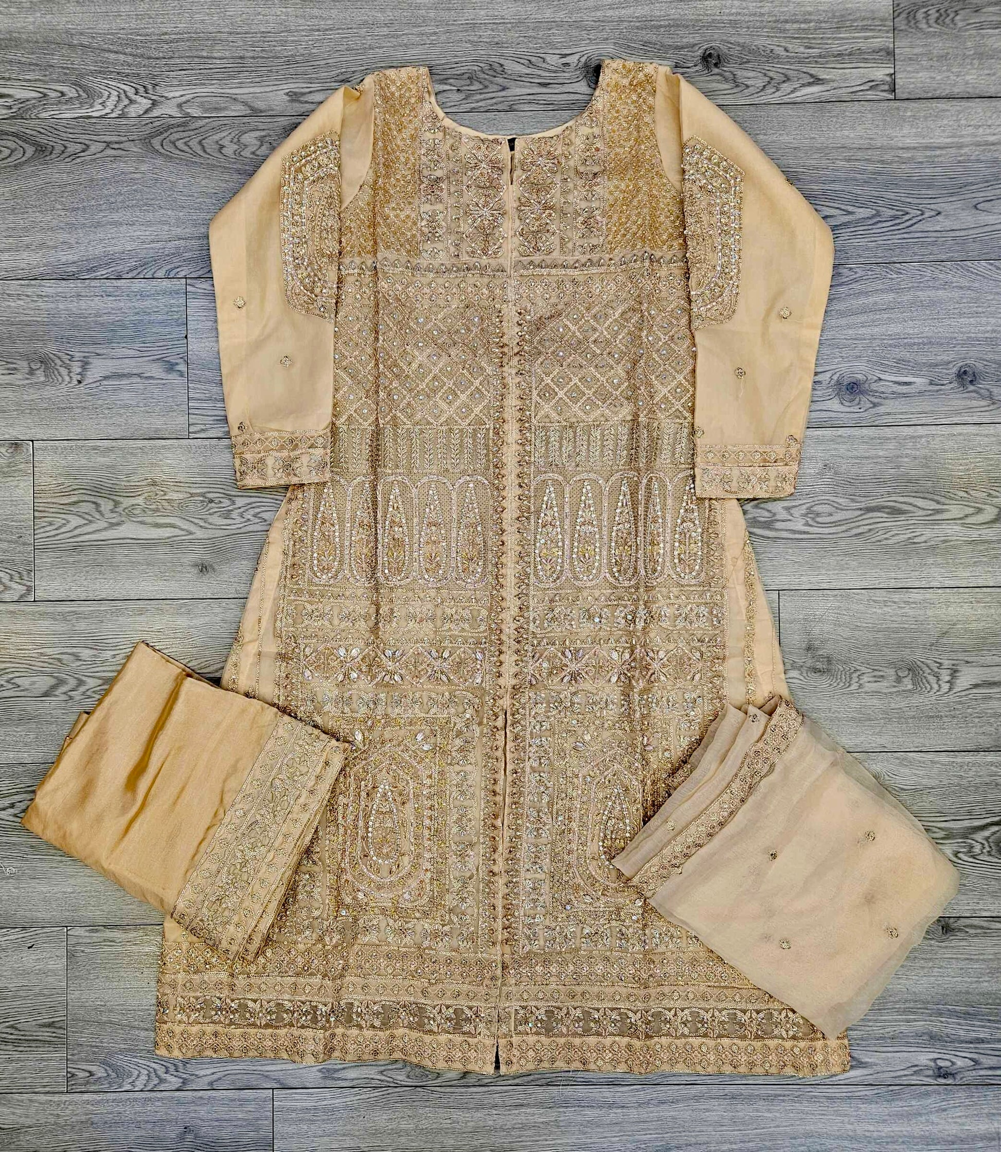 CHRZ Nude Peach Hand Embellished Chiffon Kameez | Embroidered Dupatta & Trousers | Front Split Design