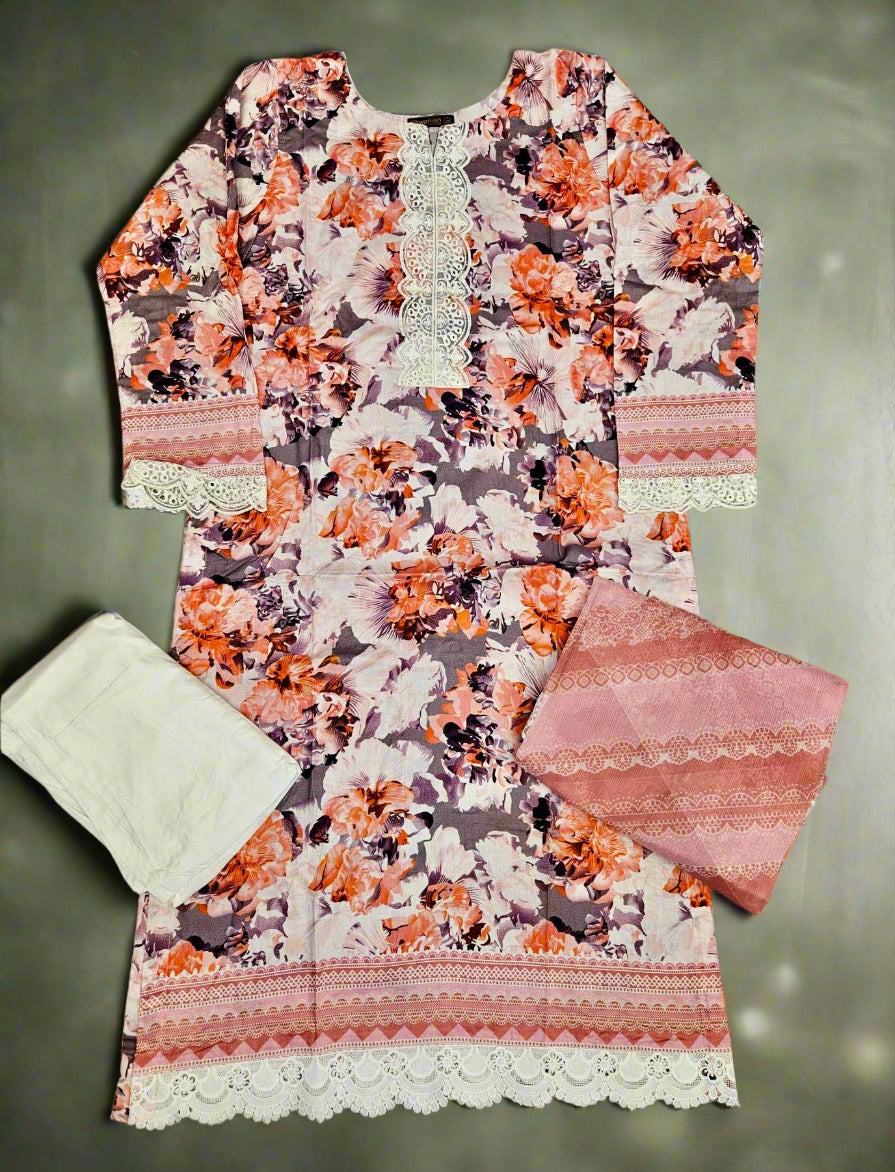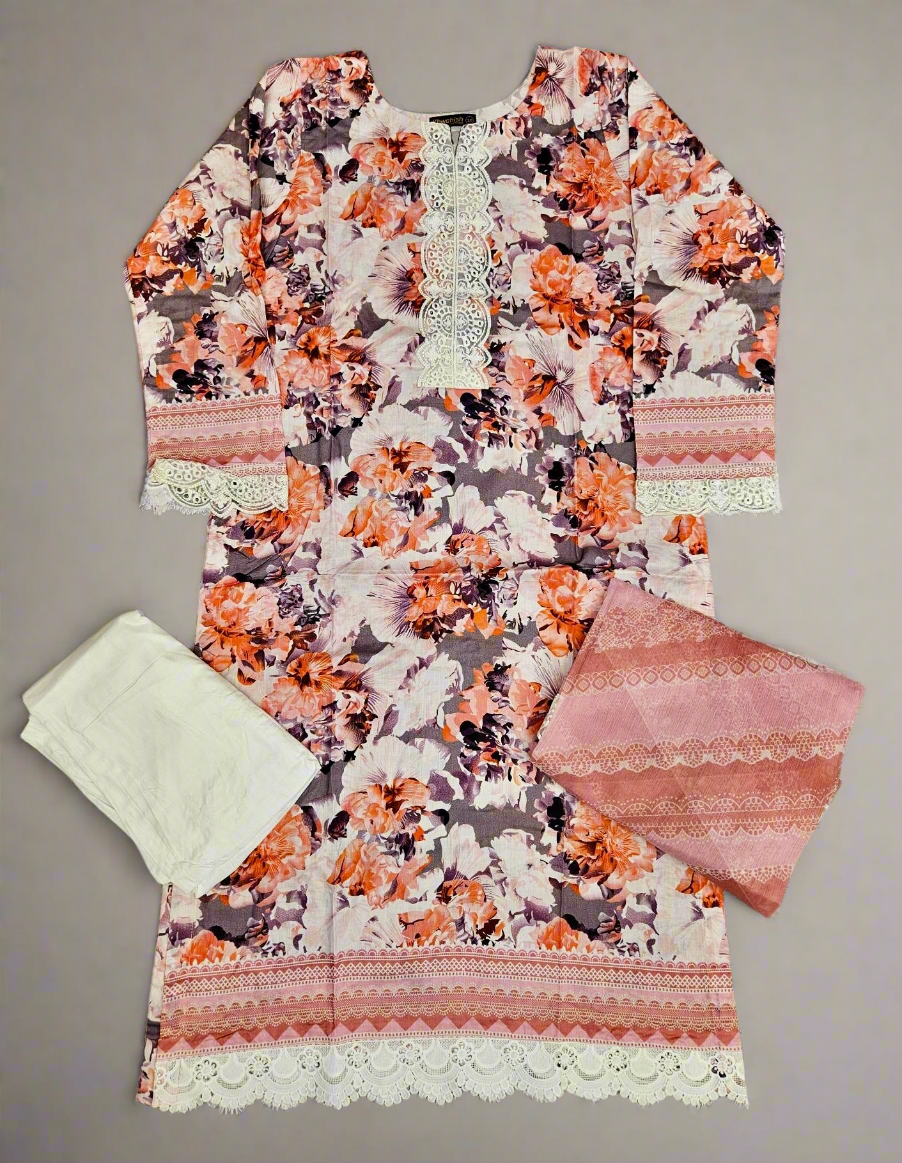 MB Tiger orange and white colour floral print with embroidery