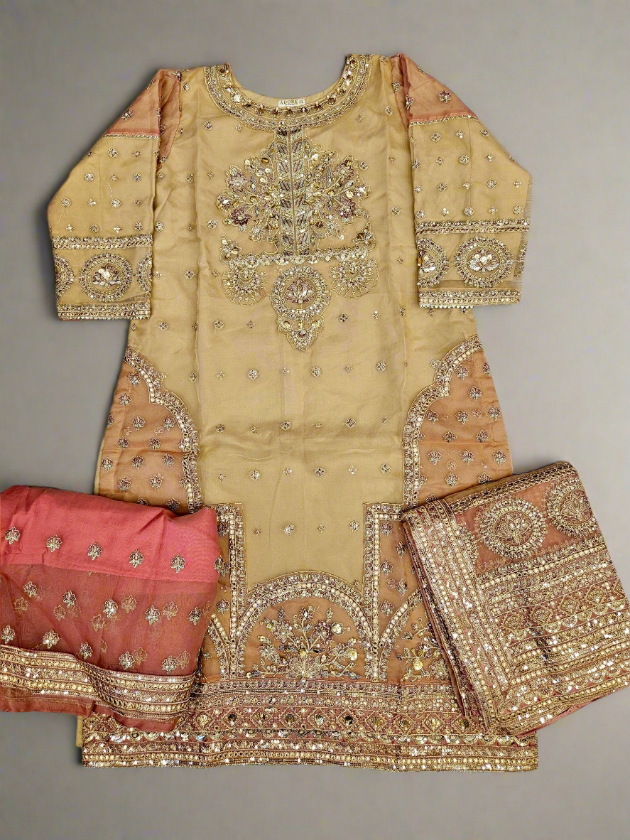 CHRZ Nude Peach Hand Embellished Chiffon Kameez | Embroidered Dupatta & Trousers | Front Split Design