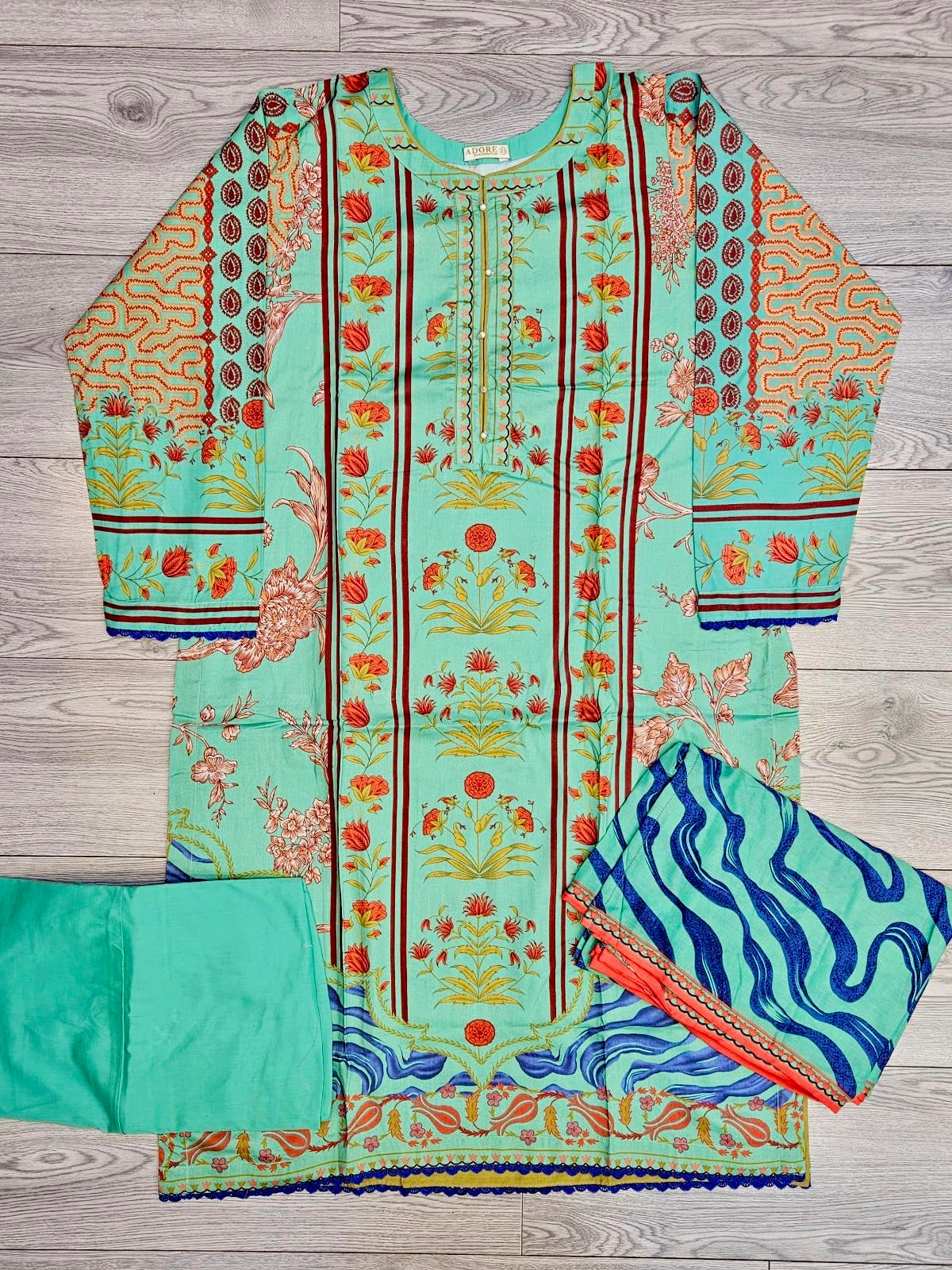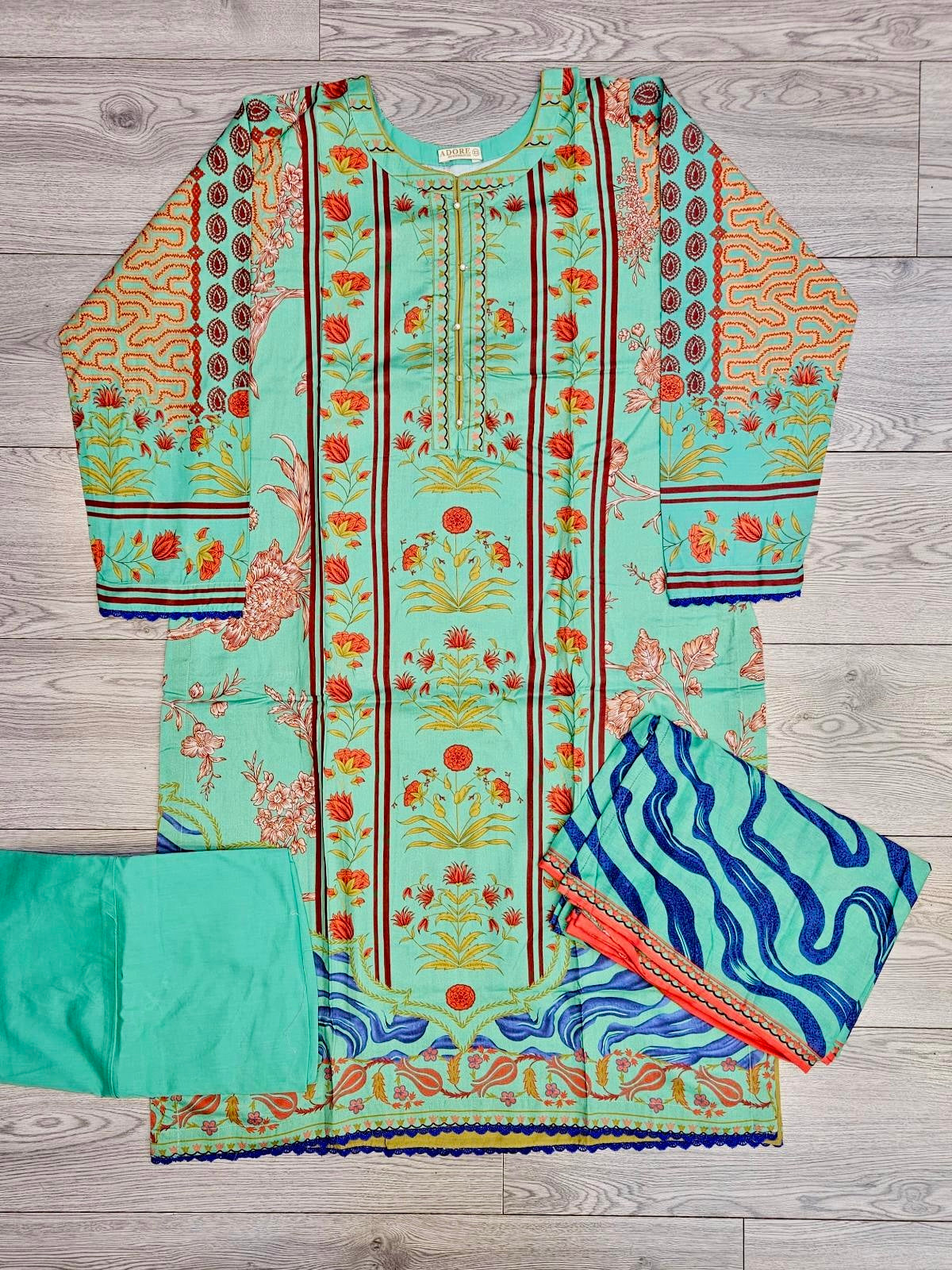 Sea Green & Mint Linen Viscose Suit | Orange Pink Symmetrical Print | Chikan Embroidery | Sizes Up to 8XL
